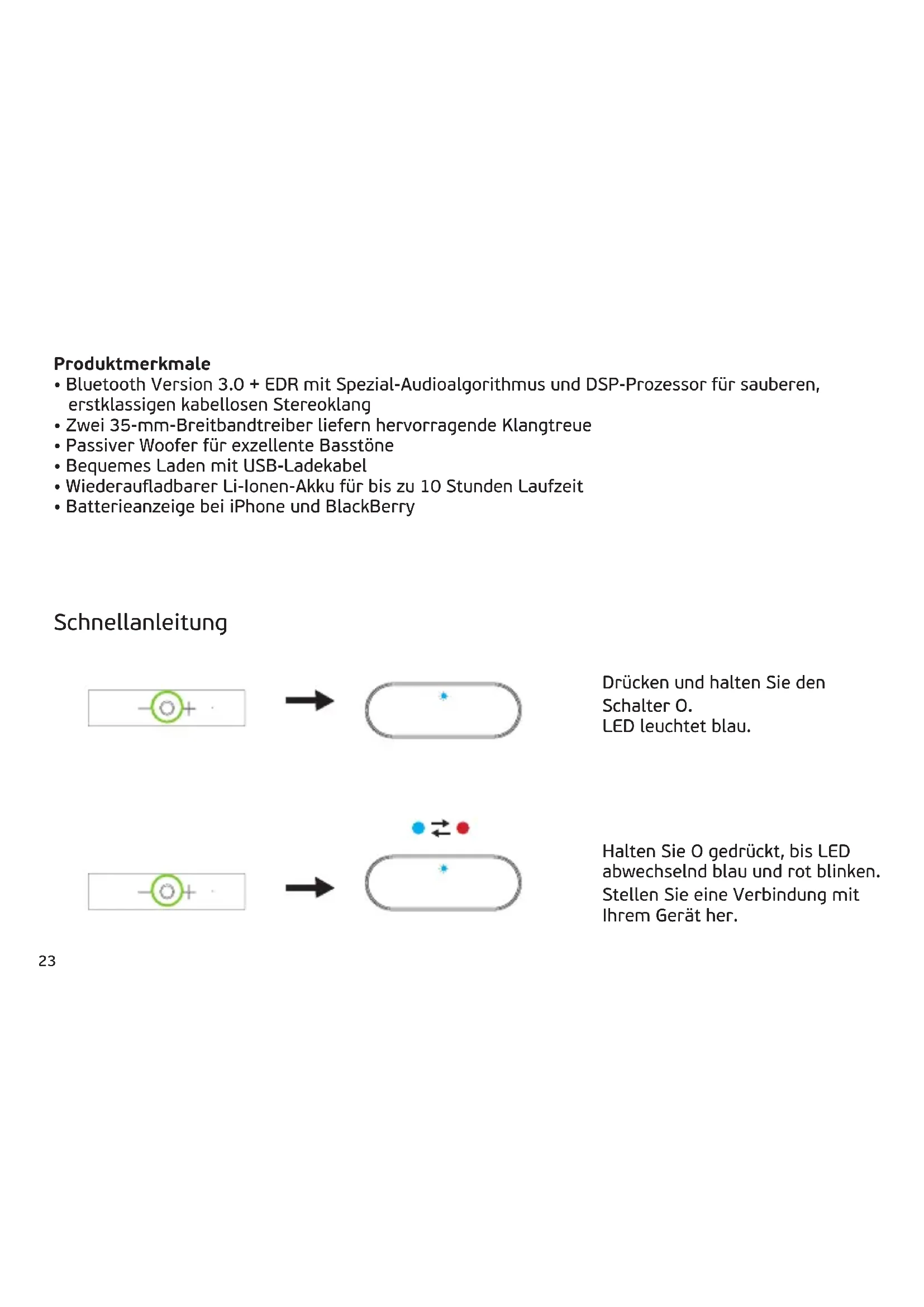 - Prüfen Sie auch bei Ihrem BT-Gerät, ob die Verbindung mit „xq S10 “ hergestellt ist. Der Kopplungsprozess kann auch einfach durch Drücken und Halten der Taste O aufgerufen werden: Wenn die LED rot/blau blinkt, lassen Sie den Schalter für den Kopplungsprozess los.