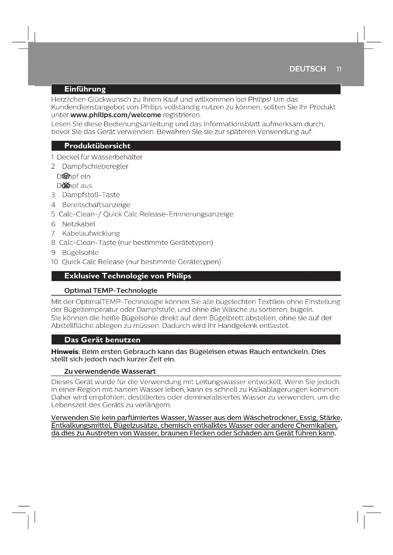 Problem Mögliche Ursache Lösung Der Bügelbrettbezug wird nass, oder beim Bügeln benden sich Wassertropfen auf dem Sto. Dampf ist nach langem Bügeln auf dem Bügelbrettbezug kondensiert. Tauschen Sie den Bügelbrettbezug aus, wenn der Schaumsto abgenutzt ist. Sie können eine zusätzliche Schicht Filz unter dem Bügelbrettbezug anbringen, um Kondensation auf dem Bügelbrett zu verhindern. Filz können Sie in einem Stogeschäft kaufen. Sie besitzen möglicherweise einen Bügelbrettbezug, der für die starken Dampfstöße des Geräts nicht geeignet ist. Bringen Sie eine zusätzliche Schicht Filz unter dem Bügelbrettbezug an, um die Kondensation auf dem Bügelbrett zu verhindern. Filz können Sie in einem Stogeschäft kaufen. Wasser tropft beim Bügeln auf das Kleidungsstück. Sie haben die Dampfstoß- Funktion zu oft innerhalb zu kurzer Zeit verwendet. Bügeln Sie eine Zeit lang mit waagerecht gehaltenem Bügeleisen weiter, bevor Sie die Dampfstoß-Funktion erneut betätigen. Sie haben den Deckel des Wasserbehälters nicht richtig geschlossen. Drücken Sie auf den Deckel, bis er hörbar einrastet. Sie haben den Quick Calc Release-Einsatz nicht ordnungsgemäß wieder in das Gerät eingesetzt (nur bestimmte Gerätetypen). Hören Sie auf zu bügeln und lassen Sie das Bügeleisen mindestens 1 Stunde lang abkühlen. Entnehmen Sie den Quick Calc Release-Einsatz. Bringen Sie ihn wieder am Gerät an und stellen Sie sicher, dass der Einsatz mit der Oberäche des Geräts abschließt. Drücken Sie den Hebel nach unten, bis er hörbar einrastet. Wenn der Einsatz beschädigt ist, wenden Sie sich an ein Service-Center in Ihrem Land (entnehmen Sie die Kontaktdaten der internationalen Garantieschrift). Das Bügeleisen gibt keinen Dampfstoß ab. Sie haben die Dampfstoß- Funktion zu oft innerhalb zu kurzer Zeit verwendet. Bügeln Sie eine Zeit lang mit waagerecht gehaltenem Bügeleisen weiter, bevor Sie die Dampfstoß-Funktion erneut betätigen. Das Bügeleisen ist noch nicht heiß genug zum Bügeln. Warten Sie, bis die Bereitschaftsanzeige aufhört, langsam zu blinken und durchgehend leuchtet. Sie haben eine Chemikalie in den Wasserbehälter gegeben. Spülen Sie den Wasserbehälter aus, und geben Sie kein Parfum und keine Chemikalien in den Wasserbehälter. Schmutziges Wasser und Verunreinigungen treten aus der Bügelsohle während des Bügelns aus. Durch hartes Wasser mit Verunreinigungen oder Chemikalien haben sich Kalkpartikel in der Bügelsohle gebildet. Verwenden Sie die Quick Calc Release- (nur bestimmte Gerätetypen) oder Calc-Clean- Funktion (nur bestimmte Gerätetypen). Weitere Informationen nden Sie im Kapitel "Reinigung und Wartung". Wasser tropft aus der Bügelsohle, nachdem das Bügeleisen von der Stromversorgung getrennt wird. Sie haben das Bügeleisen waagerecht abgestellt, und es war noch Wasser im Wasserbehälter. Leeren Sie den Wasserbehälter nach jedem Gebrauch, oder bewahren Sie das Bügeleisen in senkrechter Position auf. Der Dampfschieberegler ist auf eingestellt. Stellen Sie den Dampfschieberegler auf die Position . Ein gelbes Licht auf dem Gri des Bügeleisens blinkt. Die Calc-Clean-Erinnerungsanzeige wurde aktiviert. Dadurch werden Sie daran erinnert, Ihr Gerät zu entkalken. Verwenden Sie die Quick Calc Release- (nur bestimmte Gerätetypen) oder Calc-Clean-Funktion (nur bestimmte Gerätetypen). Weitere Informationen nden Sie im Kapitel "Reinigung und Wartung". Das Bügeleisen hinterlässt auf dem Sto glänzende Stellen oder einen Abdruck. Die zu bügelnde Oberäche war uneben, z. B. weil Sie auf dem Sto über einer Naht oder einer Falte gebügelt haben. Das Bügeleisen kann auf allen bügelechten Kleidungsstücken verwendet werden. Der Glanz bzw. der Abdruck ist nicht von Dauer und verschwindet beim Waschen. Bügeln Sie, wenn möglich, nicht über Nähte oder Falten. Legen Sie ein Baumwolltuch auf den Bügelbereich, um Abdrücke zu vermeiden.15 FRANÇAIS Introduction Félicitations pour votre achat et bienvenue dans l'univers Philips ! Pour proter pleinement de l'assistance oerte par Philips, enregistrez votre produit à l'adresse suivante : www.philips.com/welcome. Lisez attentivement ce mode d'emploi et la brochure « Informations importantes » avant d'utiliser l'appareil. Conservez-les pour un usage ultérieur. Présentation du produit 1 Couvercle du réservoir d'eau 2 Curseur de vapeur Vapeur activée Vapeur désactivée 3 Bouton Eet pressing 4 Voyant « Fer prêt » 5 Voyant de rappel Calc Clean / Quick Calc Release 6 Cordon d'alimentation 7 Système d'enroulement du cordon 8 Bouton Calc Clean (certains modèles uniquement) 9 Semelle 10 Quick Calc Release (certains modèles uniquement) Technologie exclusive de Philips Technologie OptimalTEMP La technologie OptimalTEMP vous permet de repasser tous les types de tissus repassables, dans l'ordre que vous souhaitez, sans avoir à régler la température du fer ni à trier vos vêtements. Vous pouvez laisser la semelle chaude reposer directement sur la planche à repasser sans la redéposer sur le support du fer à repasser. Cela permettra de réduire la pression exercée sur votre poignet. Utilisation de l'appareil Remarque : lors de la première utilisation, le fer peut dégager un peu de fumée. Cela s'arrête après un bref instant. Type d'eau à utiliser Cet appareil a été conçu pour être utilisé avec de l'eau du robinet. Cependant, si vous habitez dans une zone où l'eau est très calcaire, des dépôts peuvent se former rapidement. Par conséquent, il est recommandé d'utiliser de l'eau distillée ou déminéralisée pour prolonger la durée de vie de l'appareil. N'utilisez pas d'eau parfumée, d'eau provenant du sèche-linge, de vinaigre, d'amidon, de détartrants, de produits d'aide au repassage ou d'autres agents chimiques dans le réservoir d'eau car ils peuvent entraîner des projections d'eau, des taches marron ou des dommages à votre appareil.FRANÇAIS