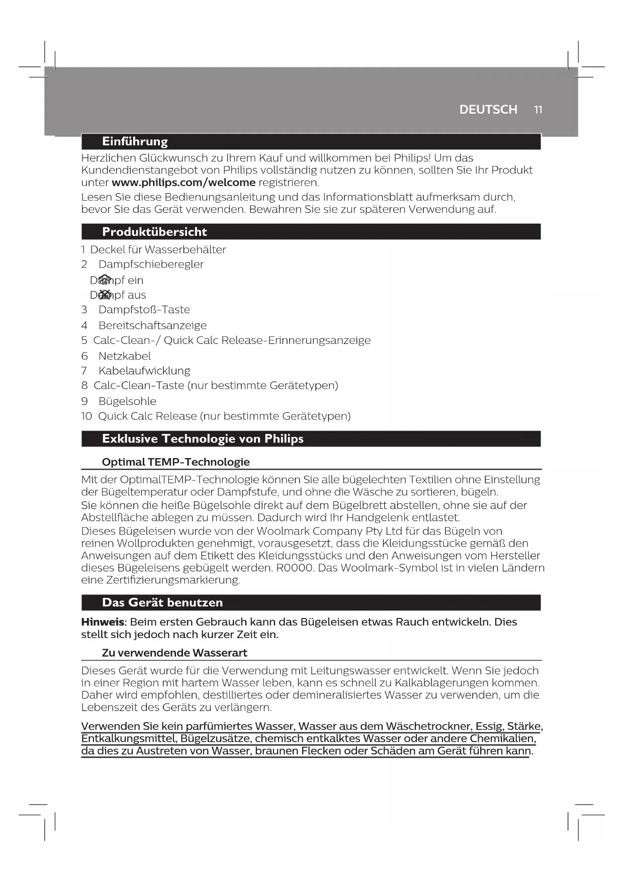 Problem Mögliche Ursache Lösung Der Bügelbrettbezug wird nass, oder beim Bügeln benden sich Wassertropfen auf dem Sto. Dampf ist nach langem Bügeln auf dem Bügelbrettbezug kondensiert. Tauschen Sie den Bügelbrettbezug aus, wenn der Schaumsto abgenutzt ist. Sie können eine zusätzliche Schicht Filz unter dem Bügelbrettbezug anbringen, um Kondensation auf dem Bügelbrett zu verhindern. Filz können Sie in einem Stogeschäft kaufen. Sie besitzen möglicherweise einen Bügelbrettbezug, der für die starken Dampfstöße des Geräts nicht geeignet ist. Bringen Sie eine zusätzliche Schicht Filz unter dem Bügelbrettbezug an, um die Kondensation auf dem Bügelbrett zu verhindern. Filz können Sie in einem Stogeschäft kaufen. Wasser tropft beim Bügeln auf das Kleidungsstück. Sie haben die Dampfstoß- Funktion zu oft innerhalb zu kurzer Zeit verwendet. Bügeln Sie eine Zeit lang mit waagerecht gehaltenem Bügeleisen weiter, bevor Sie die Dampfstoß-Funktion erneut betätigen. Sie haben den Deckel des Wasserbehälters nicht richtig geschlossen. Drücken Sie auf den Deckel, bis er hörbar einrastet. Sie haben den Quick Calc Release-Einsatz nicht ordnungsgemäß wieder in das Gerät eingesetzt (nur bestimmte Gerätetypen). Hören Sie auf zu bügeln und lassen Sie das Bügeleisen mindestens 1 Stunde lang abkühlen. Entnehmen Sie den Quick Calc Release-Einsatz. Bringen Sie ihn wieder am Gerät an und stellen Sie sicher, dass der Einsatz mit der Oberäche des Geräts abschließt. Drücken Sie den Hebel nach unten, bis er hörbar einrastet. Wenn der Einsatz beschädigt ist, wenden Sie sich an ein Service-Center in Ihrem Land (entnehmen Sie die Kontaktdaten der internationalen Garantieschrift). Das Bügeleisen gibt keinen Dampfstoß ab. Sie haben die Dampfstoß- Funktion zu oft innerhalb zu kurzer Zeit verwendet. Bügeln Sie eine Zeit lang mit waagerecht gehaltenem Bügeleisen weiter, bevor Sie die Dampfstoß-Funktion erneut betätigen. Das Bügeleisen ist noch nicht heiß genug zum Bügeln. Warten Sie, bis die Bereitschaftsanzeige aufhört, langsam zu blinken und durchgehend leuchtet. Sie haben eine Chemikalie in den Wasserbehälter gegeben. Spülen Sie den Wasserbehälter aus, und geben Sie kein Parfum und keine Chemikalien in den Wasserbehälter. Schmutziges Wasser und Verunreinigungen treten aus der Bügelsohle während des Bügelns aus. Durch hartes Wasser mit Verunreinigungen oder Chemikalien haben sich Kalkpartikel in der Bügelsohle gebildet. Verwenden Sie die Quick Calc Release- (nur bestimmte Gerätetypen) oder Calc-Clean- Funktion (nur bestimmte Gerätetypen). Weitere Informationen nden Sie im Kapitel "Reinigung und Wartung". Wasser tropft aus der Bügelsohle, nachdem das Bügeleisen von der Stromversorgung getrennt wird. Sie haben das Bügeleisen waagerecht abgestellt, und es war noch Wasser im Wasserbehälter. Leeren Sie den Wasserbehälter nach jedem Gebrauch, oder bewahren Sie das Bügeleisen in senkrechter Position auf. Der Dampfschieberegler ist auf eingestellt. Stellen Sie den Dampfschieberegler auf die Position . Ein gelbes Licht auf dem Gri des Bügeleisens blinkt. Die Calc-Clean-Erinnerungsanzeige wurde aktiviert. Dadurch werden Sie daran erinnert, Ihr Gerät zu entkalken. Verwenden Sie die Quick Calc Release- (nur bestimmte Gerätetypen) oder Calc-Clean-Funktion (nur bestimmte Gerätetypen). Weitere Informationen nden Sie im Kapitel "Reinigung und Wartung". Das Bügeleisen hinterlässt auf dem Sto glänzende Stellen oder einen Abdruck. Die zu bügelnde Oberäche war uneben, z. B. weil Sie auf dem Sto über einer Naht oder einer Falte gebügelt haben. Das Bügeleisen kann auf allen bügelechten Kleidungsstücken verwendet werden. Der Glanz bzw. der Abdruck ist nicht von Dauer und verschwindet beim Waschen. Bügeln Sie, wenn möglich, nicht über Nähte oder Falten. Legen Sie ein Baumwolltuch auf den Bügelbereich, um Abdrücke zu vermeiden.15 FRANÇAIS Introduction Félicitations pour votre achat et bienvenue dans l'univers Philips ! Pour proter pleinement de l'assistance oerte par Philips, enregistrez votre produit à l'adresse suivante : www.philips.com/welcome. Lisez attentivement ce mode d'emploi et la brochure « Informations importantes » avant d'utiliser l'appareil. Conservez-les pour un usage ultérieur. Présentation du produit 1 Couvercle du réservoir d'eau 2 Curseur de vapeur Vapeur activée Vapeur désactivée 3 Bouton Eet pressing 4 Voyant « Fer prêt » 5 Voyant de rappel Calc Clean / Quick Calc Release 6 Cordon d'alimentation 7 Système d'enroulement du cordon 8 Bouton Calc Clean (certains modèles uniquement) 9 Semelle 10 Quick Calc Release (certains modèles uniquement) Technologie exclusive de Philips Technologie OptimalTEMP La technologie OptimalTEMP vous permet de repasser tous les types de tissus repassables, dans l'ordre que vous souhaitez, sans avoir à régler la température du fer ni à trier vos vêtements. Vous pouvez laisser la semelle chaude reposer directement sur la planche à repasser sans la redéposer sur le support du fer à repasser. Cela permettra de réduire la pression exercée sur votre poignet. Ce fer a été approuvé par The Woolmark Company Pty Ltd pour le repassage de vêtements en laine à condition que ceux-ci soient repassés selon les instructions indiquées sur l’étiquette du vêtement et celles fournies par le fabricant du fer. R0000. Le symbole Woolmark est une marque de certication dans de nombreux pays. Utilisation de l'appareil Remarque : lors de la première utilisation, le fer peut dégager un peu de fumée. Cela s'arrête après un bref instant. Type d'eau à utiliser Cet appareil a été conçu pour être utilisé avec de l'eau du robinet. Cependant, si vous habitez dans une zone où l'eau est très calcaire, des dépôts peuvent se former rapidement. Par conséquent, il est recommandé d'utiliser de l'eau distillée ou déminéralisée pour prolonger la durée de vie de l'appareil.FRANÇAIS