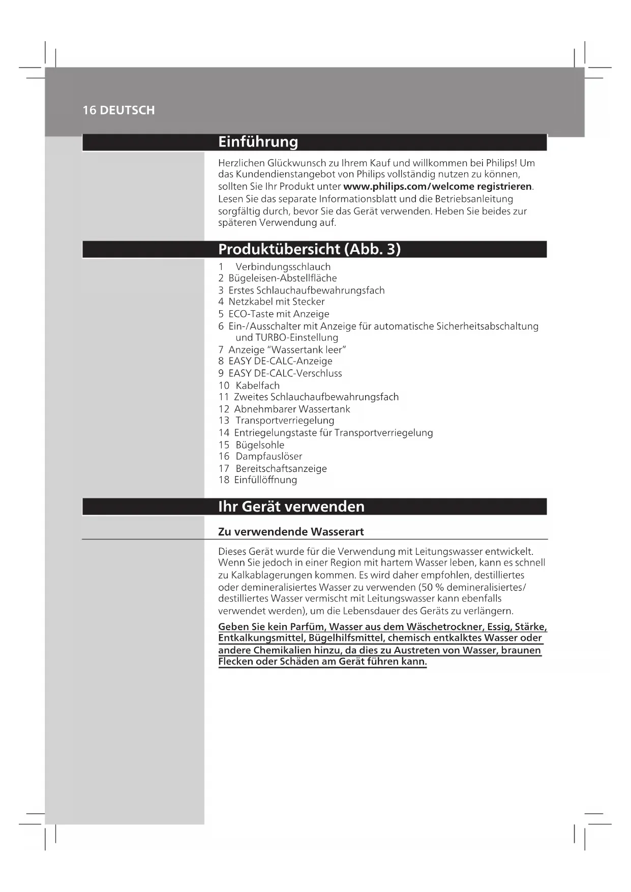 11 Stop moving the iron when no more water comes out or when steam starts coming out. 12 You can continue to use the appliance immediately. Otherwise unplug the appliance after the descaling is completed. Storage 1 Switchotheapplianceandunplugit. 2 Remove the water tank and empty it. 3 Put the iron on the iron platform. Push the carry lock to lock the iron onto the platform. 4 Fold the supply hose and mains cord. Put them in their respective storage compartments. 5 You can carry the appliance with one hand by the handle of the iron. Do not carry the appliance by holding the water tank release lever.14 Troubleshooting This chapter summarises the most common problems you could encounter with the appliance. If you are unable to solve the problem with the information below, visit www.philips.com/support for a list of frequently asked questions or contact the Consumer Care Centre in your country. Problem Possible cause Solution The ironing board cover becomes wet or there are water droplets on the garment during ironing. Steam has condensed on the ironing board cover after a long ironing session. Replace the ironing board cover if the foam material has worn out. You can also add an extra layer of felt material under the ironing board cover to prevent condensation on the ironing board. You can buy felt in a fabric shop. You have an ironing board cover that is not designed to cope with the high steam rate of the appliance. Put an extra layer of felt material under the ironing board cover to prevent condensation on the ironing board. You can buy felt in a fabric shop. Water droplets come out of the soleplate. The steam that was still present in the hose has cooled down and condensed into water. This causes water droplets to come out of the soleplate. Steam away from the garment for a few seconds. Steam and/or water come out from under the EASY DE- CALC knob. The EASY DE-CALC knob is not tightened properly. Switch o the appliance and let the appliance cool down for 2 hours. Unscrew the EASY DE-CALC knob and screw it back onto the appliance properly. Note: Some water may escape when you remove the knob. The rubber sealing ring of the EASY DE-CALC knob is worn. Contact an authorised Philips service centre for a new EASY DE-CALC knob. Dirty water and impurities come out of the soleplate or the soleplate is dirty. Impurities or chemicals present in the water have deposited in the steam vents and/or on the soleplate. Clean the soleplate with a damp cloth. Too much scale and minerals have accumulated inside the appliance. Descale the appliance regularly (see chapter ‘Important - DESCALING’). The iron leaves a shine or an imprint on the garment. The surface to be ironed was uneven, for instance because you were ironing over a seam or a fold in the garment. PerfectCare is safe on all garments. The shine or imprint is not permanent and will come o if you wash the garment. Avoid ironing over seams or folds or you can place a cotton cloth over the area to be ironed to avoid imprints at seams and folds. The appliance does not produce any steam. There is not enough water in the water tank (the ‘water tank empty’ light ashes). Fill the water tank (see chapter ‘Using your appliance’, section ‘Filling the water tank’). The appliance is not hot enough to produce steam. Wait until the ‘iron ready’ light on the iron lights up continuously. ENGLISH15 Problem Possible cause Solution You did not press the steam trigger. Press the steam trigger and keep it pressed while you iron. The water tank is not placed in the appliance properly. Slide the water tank back into the appliance rmly (‘click’). The appliance is not switched on. Insert the plug in the wall socket and press the on/o button to switch on the appliance. The appliance has switched o. The light in the on/o button ashes. The auto-o function is activated automatically when the appliance has not been used for more than 10 minutes. Press the power on/o button to switch on the appliance again. The appliance produces a pumping sound. Water is pumped into the boiler inside the appliance. This is normal. If the pumping sound continues nonstop, switch o the appliance and remove the plug from the wall socket. Contact an authorised Philips service centre. ENGLISH16 DEUTSCH Einführung Herzlichen Glückwunsch zu Ihrem Kauf und willkommen bei Philips! Um das Kundendienstangebot von Philips vollständig nutzen zu können, sollten Sie Ihr Produkt unter www.philips.com/welcome registrieren. Lesen Sie das separate Informationsblatt und die Betriebsanleitung sorgfältig durch, bevor Sie das Gerät verwenden. Heben Sie beides zur späteren Verwendung auf. Produktübersicht (Abb. 3) 1 Verbindungsschlauch 2 Bügeleisen-Abstelläche 3 Erstes Schlauchaufbewahrungsfach 4 Netzkabel mit Stecker 5 ECO-Taste mit Anzeige 6 Ein-/Ausschalter mit Anzeige für automatische Sicherheitsabschaltung und TURBO-Einstellung 7 Anzeige “Wassertank leer” 8 EASY DE-CALC-Anzeige 9 EASY DE-CALC-Verschluss 10 Kabelfach 11 Zweites Schlauchaufbewahrungsfach 12 Abnehmbarer Wassertank 13 Transportverriegelung 14 Entriegelungstaste für Transportverriegelung 15 Bügelsohle 16 Dampfauslöser 17 Bereitschaftsanzeige 18 Einfüllönung Ihr Gerät verwenden Zu verwendende Wasserart Dieses Gerät wurde für die Verwendung mit Leitungswasser entwickelt. Wenn Sie jedoch in einer Region mit hartem Wasser leben, kann es schnell zu Kalkablagerungen kommen. Es wird daher empfohlen, destilliertes oder demineralisiertes Wasser zu verwenden (50% demineralisiertes/ destilliertes Wasser vermischt mit Leitungswasser kann ebenfalls verwendet werden), um die Lebensdauer des Geräts zu verlängern. Geben Sie kein Parfüm, Wasser aus dem Wäschetrockner, Essig, Stärke, Entkalkungsmittel, Bügelhilfsmittel, chemisch entkalktes Wasser oder andere Chemikalien hinzu, da dies zu Austreten von Wasser, braunen Flecken oder Schäden am Gerät führen kann.17 Füllen des Wasserbehälters Füllen Sie den Wasserbe