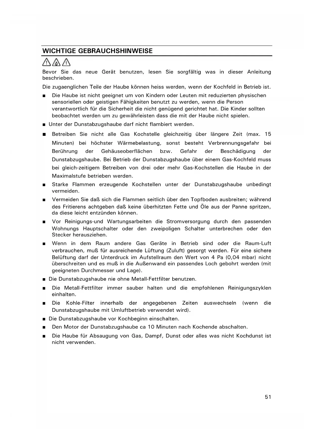 Bei Verwendung eines Gasherds ist der gleichzeitige Betrieb der Dunstabzugshaube und einer weiteren raumluftabhängigen Feuerstätte (wie z.B. Gas, Öl-oder Kohleheizgeräte, Durchlauferhitzer, Warmwasserbereiter oder andere Brennstoffe) nicht geraten. Der Unterdruck im Raum der Kochstelle muß unter 4 Pa (0,04 mbar) liegen und das Lokal muß genügend belüftet werden. Im Zweifelsfall geben die nationalen und internationalen gesetzlichen Bestimmungen genaue Informationen über die korrekte Installation von Gasgeräten und des gesamten Lüftungsverbundes der Wohnung, um zu verhindern, daß es zu unvollständigen Verbrennungen kommt, die zu gefährlichen Gasentwicklungen führen könnten.