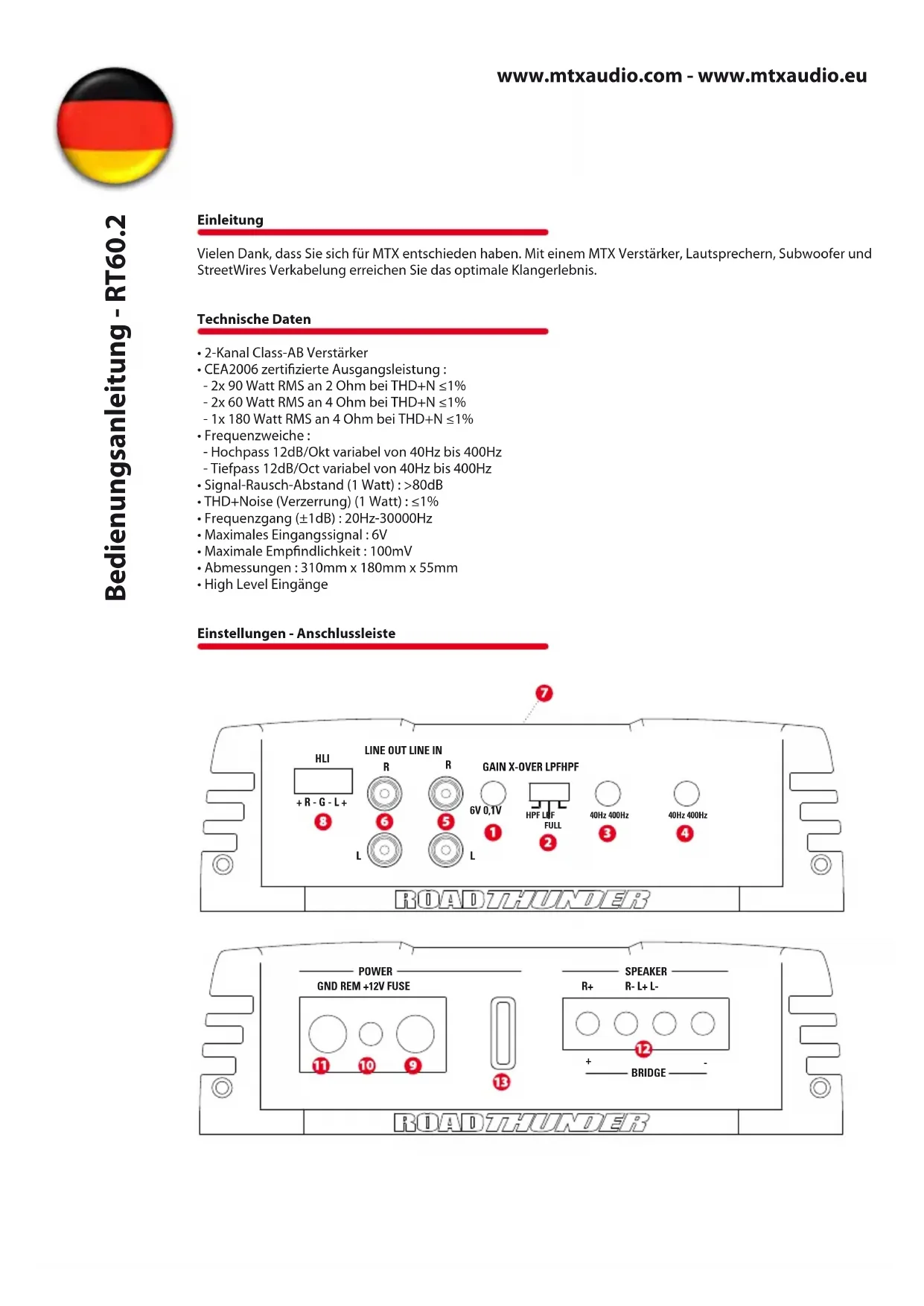 Tiefpass / Hochpass Schalter (X-OVER) : In der “LPF” Position ist die Tiefpass Aktivweiche akitviert. In der “HPF” Position ist die Hochpass Aktivweiche akitviert. In der “FULL” Position ist die Aktivweiche deakitviert. Hochpass Frequenzeinstellung (HPF) : Dieser Regler stellt die gewünschte Trennfrequenz des Hochpasslters ein. Die Frequenz ist von 40 Hz bis 400 Hz einstellbar. Tiefpass Frequenzeinstellung (LPF) : Dieser Regler stellt die gewünschte Trennfrequenz des Tiefpasslters ein. Die Frequenz ist von 40Hz bis 400 Hz einstellbar. Cincheingänge (LOW INPUT) : Diese Eingänge sind für Radios vorgesehen, die über Cinchausgänge verfügen. Für einen einwandfreien Betrieb sind mind. 100mV Spannung des Radios erforderlich. Um ungewünschte Störge- räusche zu vermeiden, empfehlen wir ein hochwertiges Cinchkabel mit “Twisted Pair” Aufbau (z.B. StreetWires). Cinchausgänge (LINE OUT) : Die Cinchausgänge ermöglichen den Anschluss weiterer Endstufen, wenn das Radio nur über einen Ausgang verfügt. Statusanzeige : die LED leuchtet rot wenn der Verstärker eingeschaltet ist. Bei Überhitzung oder Kurzschluss blinkt die LED. Hochpegel-Eingänge (HLI) : Sollte Ihr Radio nur über Lautsprecherausgänge verfügen, so nutzen Sie diese Ein- gänge. Die Lautsprecherkabel des Radios sollten direkt mit dem Adapter der Endstufe verbunden werden. Hinweis: Bei Verwendung der Hochpegel-Eingänge muß trotzdem ein Remote-Kabel verwendet werden, um den Verstärker ein- und auszuschalten. (+12V) Stromanschluss : Dies ist der Stromanschluss des Verstärkers. Dieser muss – um einen optimalen Betrieb sicherzustellen – direkt mit dem Pluspol der Batterie verbunden werden. Seien Sie beim Verlegen des Kabels vorsichtig und vermeiden Sie es, dass Kabel entlang der Cinch-, Antennenleitung oder anderer empndlicher Komponentenzu verlegen. Der besonders starke Stromuss in diesem Kabel könnte zu Störgeräuschen im Au- diosystem führen. Auch eine feste Verbindung des Kabels ist sehr wichtig, um maximale Leistung zu erzielen. Wir empfehlen für den MTX RT60.2 Verstärker einen Kabelquerschnitt von 10mm2. Remote-Anschluss (REM) : Liegen hier 12 Volt an, so schaltet der Verstärker ein. Nutzen Sie hierzu den „Remote“- Ausgang oder den Ausgang für die elektrische Antenne des Radios. Masseanschluss (GND) : Ein guter Massepunkt ist für die maximale Leistung des Verstärkers sehr wichtig. Ein möglichst kurzes Kabel mit dem gleichen Querschnitt, der auch für das Stromkabel verwendet wird, verbinden Sie direkt mit der Fahrzeugkarosserie. Entfernen Sie an dieser Stelle den Lack um das Massekabel mit dem blan- ken Metall zu verbinden. Lautsprecheranschlüsse (SPEAKER) : Schliessen hier Ihre(n) Subwoofer an. Achten Sie bei zwei Subwoofern oder Doppelschwingspule auf die Phase. Achtung: Die beide (+) Anschlüsse sind intern parallel geschaltet. Gleiches gilt für die (-) Anschlüsse. Um den Verstärker gebrückt zu betreiben verwenden Sie von rechts den Positiv- und von links den Negativ-Anschluss. Achtung : Brücken Sie den Verstärker nicht an einer Impedanz unterhalb von 4 Ohm. Sicherungen (FUSE) : Sollte eine Sicherung durchbrennen so ersetzten Sie diese mit einer neuen Sicherung des gleichen Wertes. Verwenden Sie niemals eine Sicherung mit einem höheren Wert.www.mtxaudio.com - www.mtxaudio.eu Bedienungsanleitung - RT60.2 Installation & Befestigung MTX empehlt den Einbau Ihrer RoadTHUNDER Endstufe durch einen authorisierten MTX Fachhändler. Etwaige Abweichungen von den hier gezeigten Anschlussmöglichkeiten können zu ernsthaften Schäden an der Endstu- fe, den Lautsprechern und/oder der Fahrzeugelektrik führen. Bitte prüfen Sie die Anschlüsse daher sehr genau, bevor Sie Ihr System einschalten.