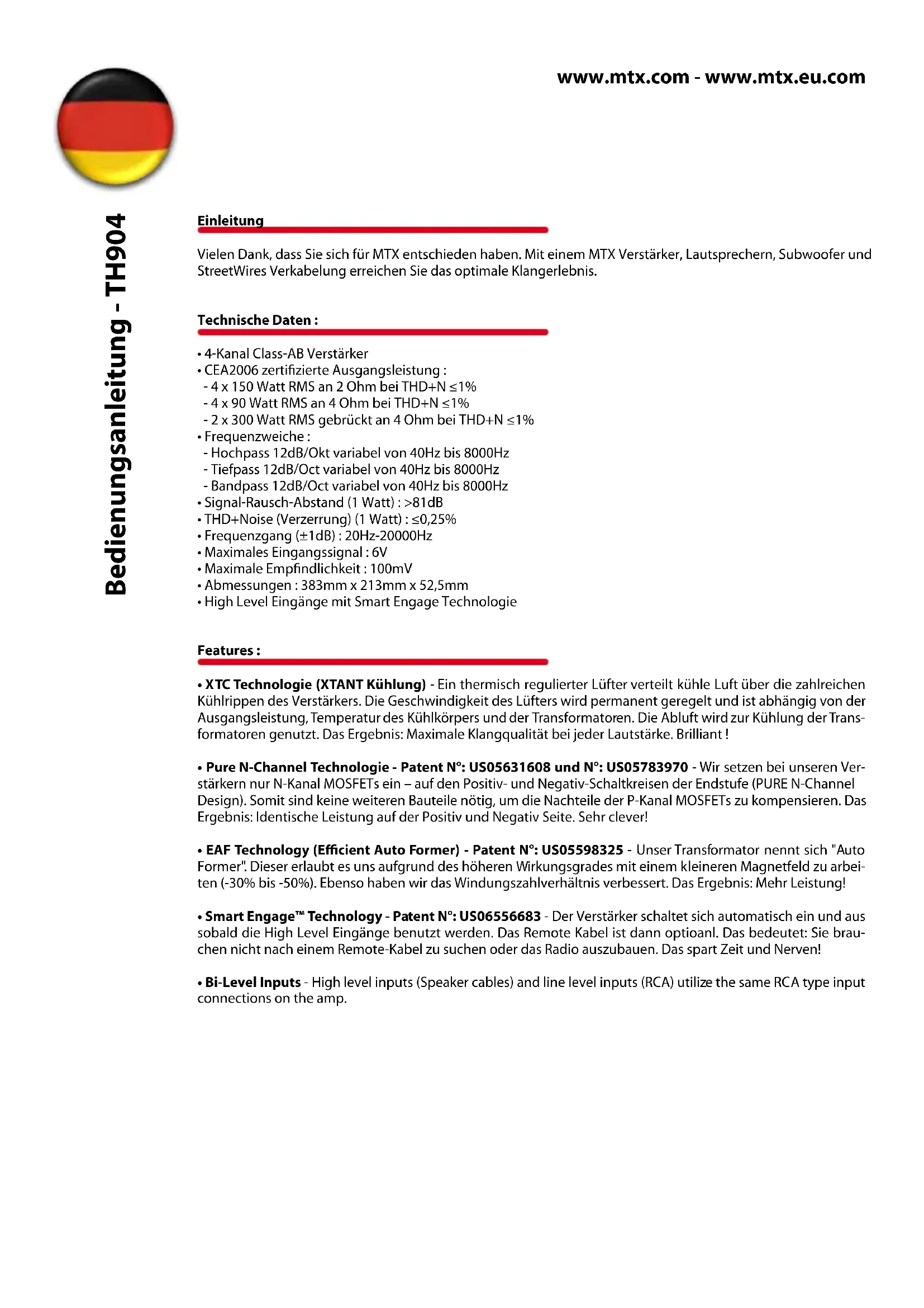 Tiefpass Frequenzweiche - Dieser Schalter aktiviert oder deaktiviert die Tiefpass- Frequenzweiche des Verstär- kers. Im gedrückten Zustand ist die Weiche aktiviert. Tiefpass Frequenzeinstellung - Dieser Regler stellt die gewünschte Trennfrequenz des Tiefpasslters ein. Die Frequenz ist von 40Hz bis 8000 Hz einstellbar. Hochpass Frequenzweiche – Dieser Schalter aktiviert oder deaktiviert die Hochpass- Frequenzweiche des Ver- stärkers. Im gedrückten Zustand ist die Weiche aktiviert. Hochpass Frequenzeinstellung – Dieser Regler stellt die gewünschte Trennfrequenz des Hochpasslters ein. Die Frequenz ist von 40 Hz bis 8000 Hz einstellbar Bandpass : Es ist auch möglich, einen Bandpass zu generieren, um Mitteltöner aktiv zu betreiben. Hierzu wer- dender Hochpass und der Tiefpass aktiviert. Die untere Frequenz wird dann mit dem Hochpass und die obere Frequenz mit dem Tiefpass festgelegt. Wichtiger Hinweis: Wenn beide Frequenzweichen ausgeschaltet sind, ist sie Vorstufe automatisch im „Direkt“ Modus. Hierdurch erreichen Sie die bestmögliche Klangqualität. Statusanzeige: die LED leuchtet rot wenn der Verstärker eingeschaltet ist. Angaben zu Überhitzung oder Kurz- schluss nden Sie unter Punkt 9 und 10 Einstellungen (oben) Anschlussleiste (seitlich)www.mtx.com - www.mtx.eu.com Bedienungsanleitung - TH904 Anschlussleiste : Cincheingänge – Diese Eingänge sind für Radios vorgesehen, die über Cinch- ausgänge oder Hochpegelausgänge verfügen. Für einen einwandfreien Betrieb sind mind. 100mV Spannung des Radios erforderlich. Um ungewünschte Störgeräusche zu vermeiden, empfehlen wir ein hochwertiges Cinchkabel mit “Twisted Pair” Aufbau. Hochpegel-Eingänge : MTX Verstärker erlauben den Hochpegel-Anschluss über die Cinch-Eingänge. Schliessen Sie die Lautsprecherausgänge Ihres Radios einfach mit den mitge- lieferten Adaptern an. Lautsprecheranschlüsse – Schliessen Sie hier Ihre Lautsprecher an. Stellen Sie sicher, dass die Polarität der Lautsprecher im gesamten System korrekt ist. Eine Verpolung der Lautsprecher kann zu Verlusten im Bassbereich und/oder zu einer verschlech- terten Klangqualität führen. Gebrückter Modus : Um den Verstärker gebrückt zu betreiben verwenden Sie von links den Positiv- und von rechts den Negativ-Anschluss. ACHTUNG : Brücken Sie den Verstärker nicht an einer Impedanz unterhalb von 4 Ohm. Überhitzungsschutz - die LED wird rot sobald der Verstärker eine Temperatur von 100°C erreicht. Die LED wird ebenfalls rot wenn die Spannungsversorgung unter 9V oder über 16,2V liegt. Kurzschluss-Schutzschaltung - die LED blinkt gelb oder leuchtet dauerhaft gelb wenn an den Lautsprecherausgängen ein Kurzschluss anliegt. Sicherungen - Sollte eine Sicherung durchbrennen so ersetzten Sie diese mit einer neuen Sicherung des gleichen Wertes. Verwenden Sie niemals eine Sicherung mit einem höheren Wert. (+12) Power Terminal - Dies ist der Stromanschluss des Verstärkers. Dieser muss – um einen optimalen Betrieb sicherzu- stellen – direkt mit dem Pluspol der Batterie verbunden werden. Seien Sie beim Verlegen des Kabels vorsichtig und ver- meiden Sie es, dass Kabel entlang der Cinch-, Antennenleitung oder anderer empndlicher Komponentenzu verlegen. Der besonders starke Stromuss in diesem Kabel könnte zu Störgeräuschen im Audiosystem führen. Auch eine feste Verbindung des Kabels ist sehr wichtig, um maximale Leistung zu erzielen. Wir empfehlen für den MTX TH904 Verstärker einen Kabelquerschnitt von 21mm