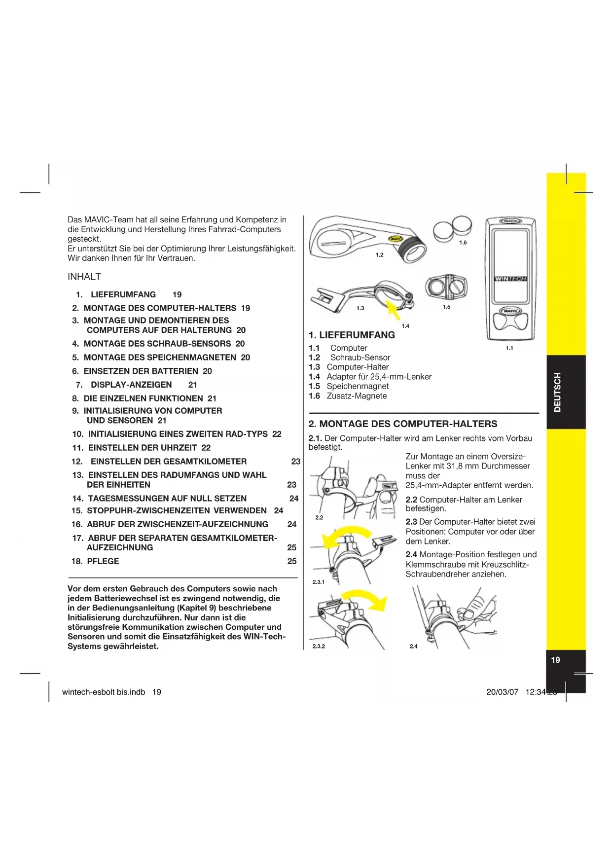 Klemmschraube mit Kreuzschlitz- Schraubendreher anziehen. Das MAVIC-Team hat all seine Erfahrung und Kompetenz in die Entwicklung und Herstellung Ihres Fahrrad-Computers gesteckt. Er unterstützt Sie bei der Optimierung Ihrer Leistungsfähigkeit. Wir danken Ihnen für Ihr Vertrauen. INHALT