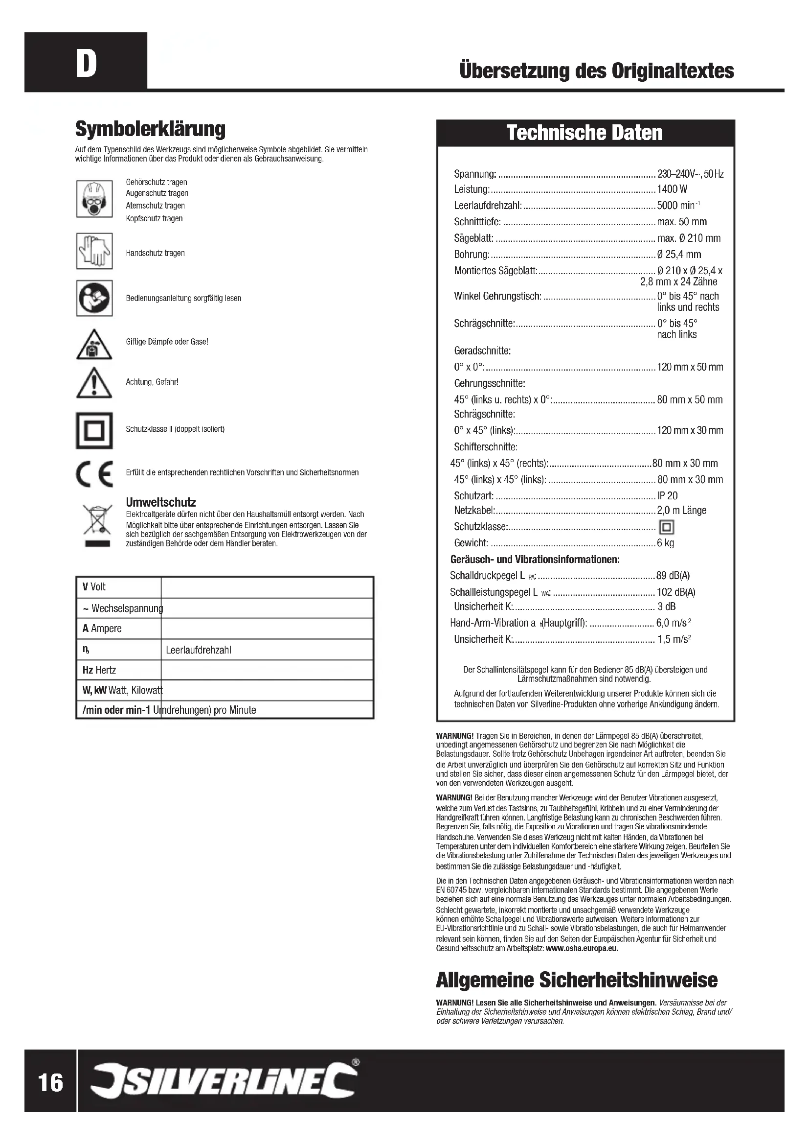 Übersetzung des Originaltextes WARNUNG! Tragen Sie in Bereichen, in denen der Lärmpegel 85 dB(A) überschreitet, unbedingt angemessenen Gehörschutz und begrenzen Sie nach Möglichkeit die Belastungsdauer. Sollte trotz Gehörschutz Unbehagen irgendeiner Art auftreten, beenden Sie die Arbeit unverzüglich und überprüfen Sie den Gehörschutz auf korrekten Sitz und Funktion und stellen Sie sicher, dass dieser einen angemessenen Schutz für den Lärmpegel bietet, der von den verwendeten Werkzeugen ausgeht.WARNUNG! Bei der Benutzung mancher Werkzeuge wird der Benutzer Vibrationen ausgesetzt, welche zum Verlust des Tastsinns, zu Taubheitsgefühl, Kribbeln und zu einer Verminderung der Handgreifkraft führen können. Langfristige Belastung kann zu chronischen Beschwerden führen. Begrenzen Sie, falls nötig, die Exposition zu Vibrationen und tragen Sie vibrationsmindernde Handschuhe. Verwenden Sie dieses Werkzeug nicht mit kalten Händen, da Vibrationen bei Temperaturen unter dem individuellen Komfortbereich eine stärkere Wirkung zeigen. Beurteilen Sie die Vibrationsbelastung unter Zuhilfenahme der Technischen Daten des jeweiligen Werkzeuges und bestimmen Sie die zulässige Belastungsdauer und -häufigkeit.Die in den Technischen Daten angegebenen Geräusch- und Vibrationsinformationen werden nach EN 60745 bzw. vergleichbaren internationalen Standards bestimmt. Die angegebenen Werte beziehen sich auf eine normale Benutzung des Werkzeuges unter normalen Arbeitsbedingungen. Schlecht gewartete, inkorrekt montierte und unsachgemäß verwendete Werkzeuge können erhöhte Schallpegel und Vibrationswerte aufweisen. Weitere Informationen zur EU-Vibrationsrichtlinie und zu Schall- sowie Vibrationsbelastungen, die auch für Heimanwender relevant sein können, finden Sie auf den Seiten der Europäischen Agentur für Sicherheit und Gesundheitsschutz am Arbeitsplatz: www.osha.europa.eu. Allgemeine Sicherheitshinweise WARNUNG! Lesen Sie alle Sicherheitshinweise und Anweisungen. Versäumnisse bei der Einhaltung der Sicherheitshinweise und Anweisungen können elektrischen Schlag, Brand und/oder schwere Verletzungen verursachen. Symbolerklärung Auf dem Typenschild des Werkzeugs sind möglicherweise Symbole abgebildet. Sie vermitteln wichtige Informationen über das Produkt oder dienen als Gebrauchsanweisung. Gehörschutz tragenAugenschutz tragen Atemschutz tragenKopfschutz tragen Handschutz tragen Bedienungsanleitung sorgfältig lesenGiftige Dämpfe oder Gase!Achtung, Gefahr! Schutzklasse II (doppelt isoliert) Erfüllt die entsprechenden rechtlichen Vorschriften und Sicherheitsnormen Umweltschutz Elektroaltgeräte dürfen nicht über den Haushaltsmüll entsorgt werden. Nach Möglichkeit bitte über entsprechende Einrichtungen entsorgen. Lassen Sie sich bezüglich der sachgemäßen Entsorgung von Elektrowerkzeugen von der zuständigen Behörde oder dem Händler beraten. V Volt ~ Wechselspannung A Ampere