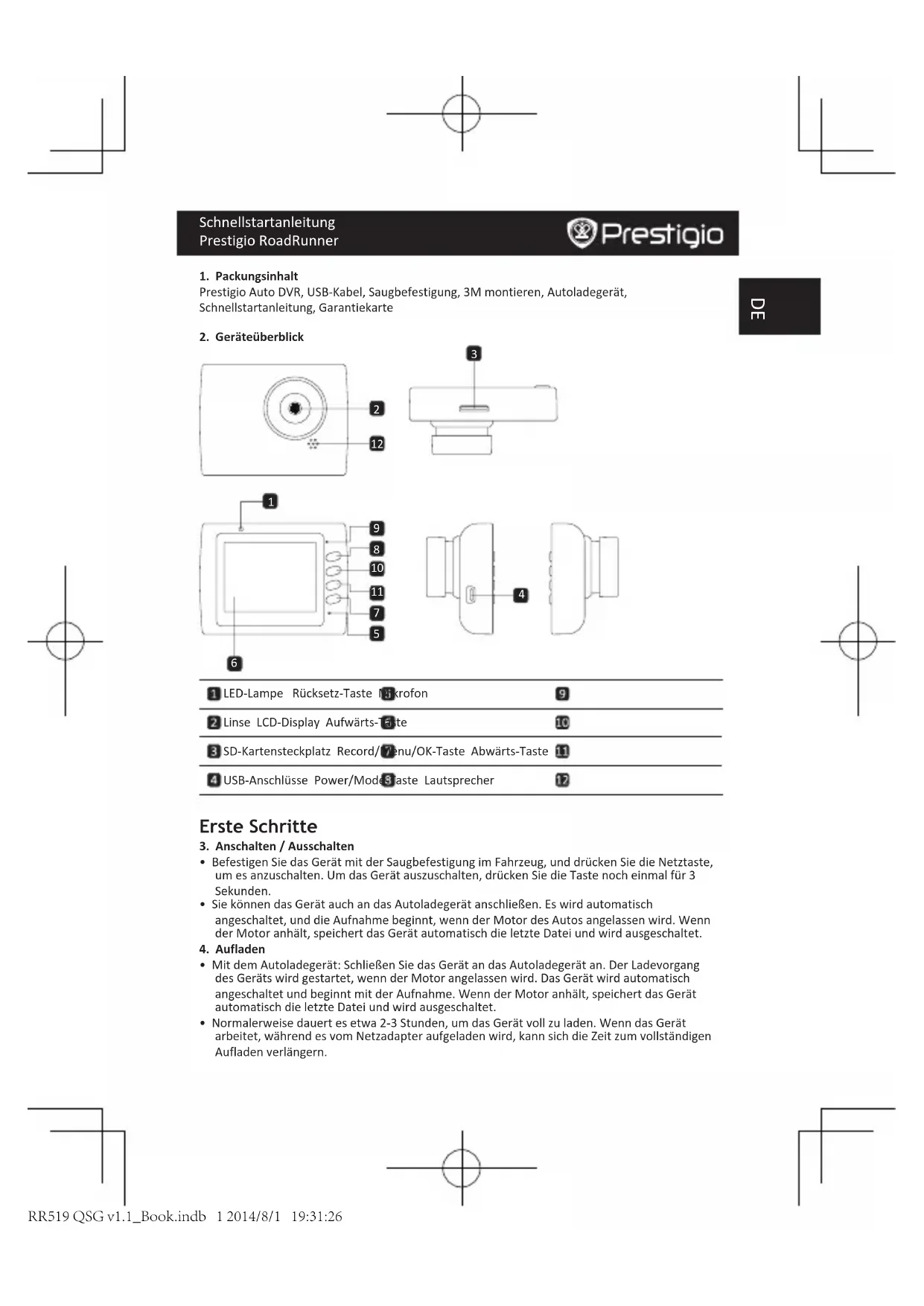 - Normalerweise dauert es etwa 2-3 Stunden, um das Gerät voll zu laden. Wenn das Gerät arbeitet, während es vom Netzadapter aufgeladen wird, kann sich die Zeit zum vollständigen Aufladen verlängern. RR519 QSG v1.1_Book.indb 1 2014/8/1 19:31:26Schnellstartanleitung Prestigio RoadRunner