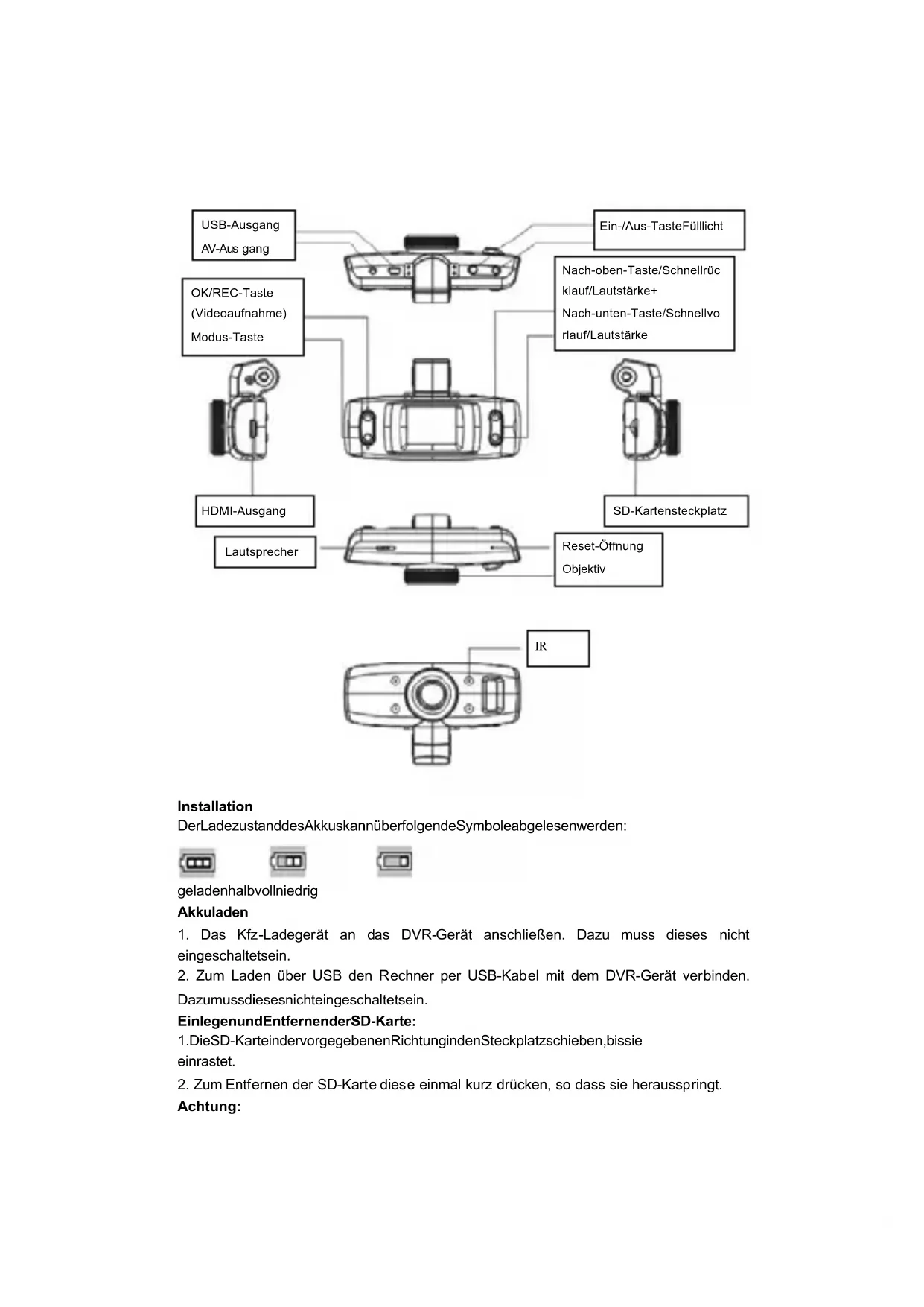 Im Wiedergabe-Modus die Modus-Ta ste gedrckt halten, um zwischen Lschen und Format whlen zu knnen. Mit der Nach-unten-Ta ste die zu lschende Option auswhlen und mit der OK-Taste besttigen. Sie haben dann die Auswahl zwischen Lschen und Alle lschen. Mit der OK-T aste die Auswahl erneut besttigen. Aufnahme-Modus whrend des Ladens Das Kfz-Ladegert an den USB-Port des Gerts anschlieen, dann dieses ausschalten, um den Modus zu starten. Datensicherung USB-Sicherungsmodus DVR-Gert und Rechner per USB-Kabel verbinden. Das Gert schaltet sich automatisch ein und das Symbol erscheint. Memory (Speicher) auswhlen und mit OK-Taste besttigen. Den Rechner einschalten. Unter Arbeitsplatz wird ein mobiles Laufwerk angezeigt. Sie knnen dann Dateien in dem Ordner mobiles Laufwerk/DCIM suchen. Hinweise:
