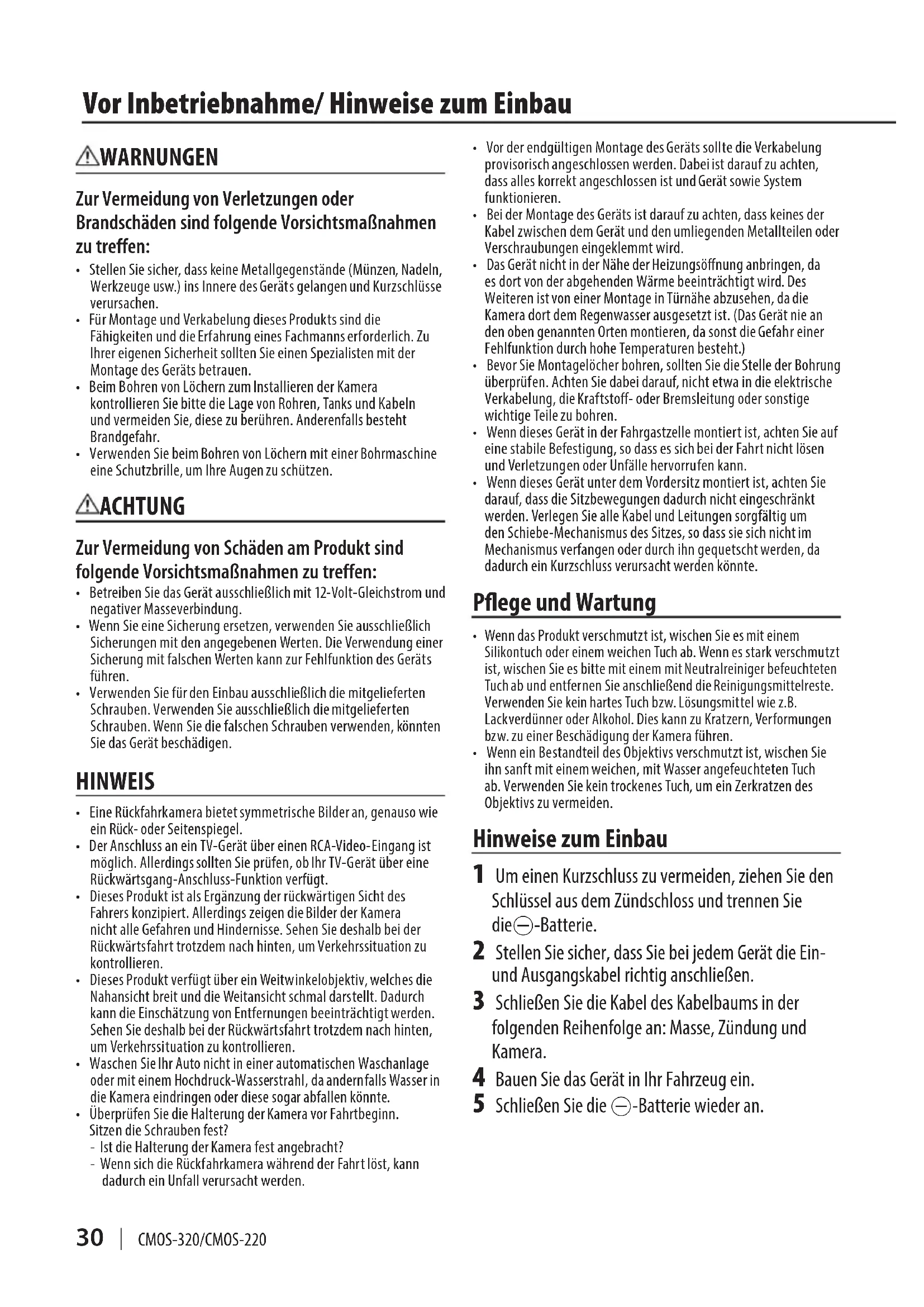 - WenneinBestandteildesObjektivsverschmutztist,wischenSie ihnsanftmiteinemweichen,mitWasserangefeuchtetenTuch ab.VerwendenSiekeintrockenesTuch,umeinZerkratzendes Objektivszuvermeiden. Hinweise zum Einbau 1 UmeinenKurzschlusszuvermeiden,ziehenSieden SchlüsselausdemZündschlossundtrennenSie die--Batterie. 2 StellenSiesicher,dassSiebeijedemGerätdieEin- undAusgangskabelrichtiganschließen. 3 SchließenSiedieKabeldesKabelbaumsinder folgendenReihenfolgean:Masse,Zündungund Kamera. 4 BauenSiedasGerätinIhrFahrzeugein. 5 SchließenSiedie--Batteriewiederan. WARNUNGEN Zur Vermeidung von Verletzungen oder Brandschäden sind folgende Vorsichtsmaßnahmen zu treffen:
