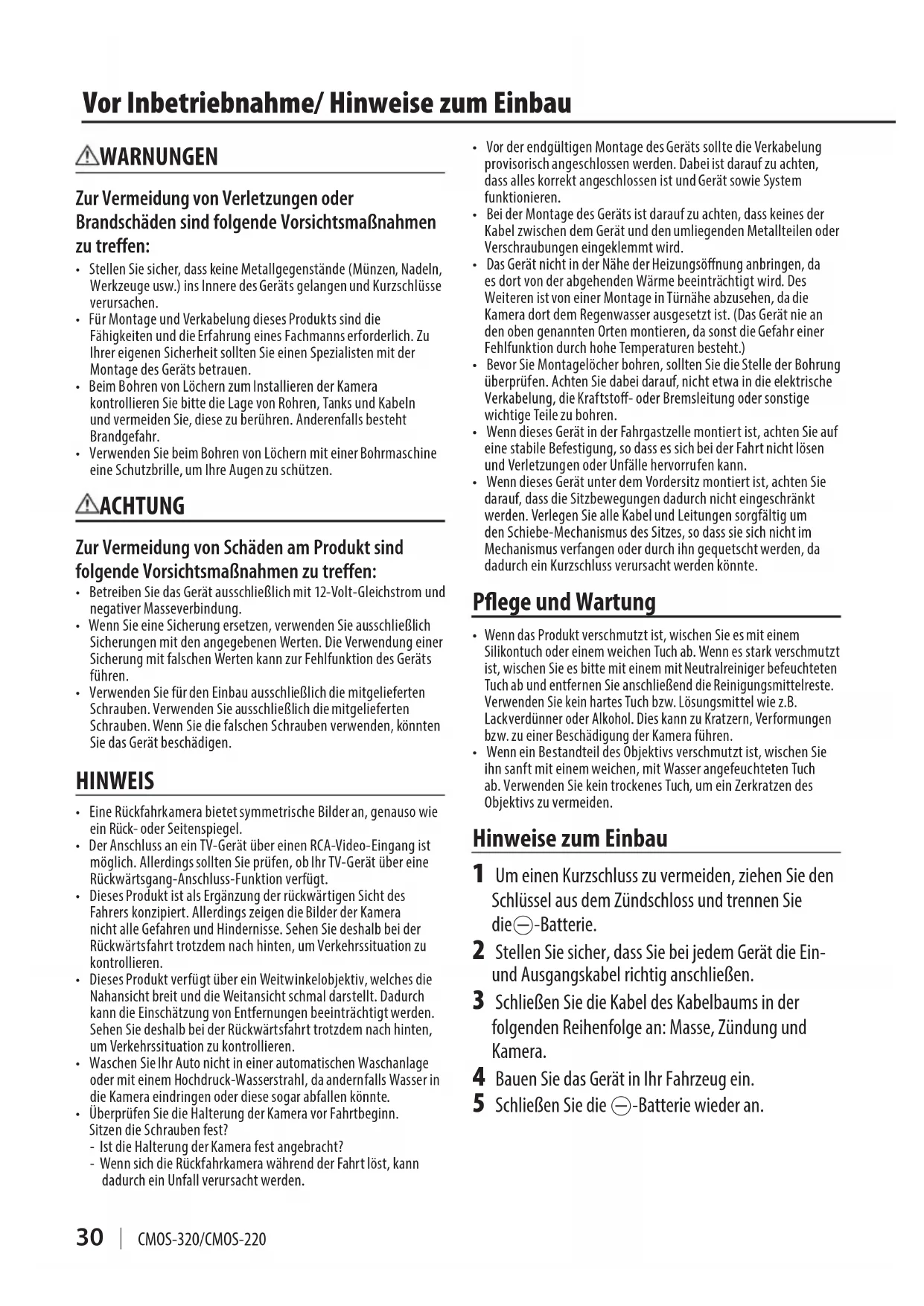 - ÜberprüfenSiedieHalterungderKameravorFahrtbeginn. SitzendieSchraubenfest? -IstdieHalterungderKamerafestangebracht? -WennsichdieRückfahrkamerawährendderFahrtlöst,kann dadurcheinUnfallverursachtwerden. Vor Inbetriebnahme/ Hinweise zum Einbau LVT2720-001A.indb 30 14/02/14 15:11CMOS-320/CMOS-220