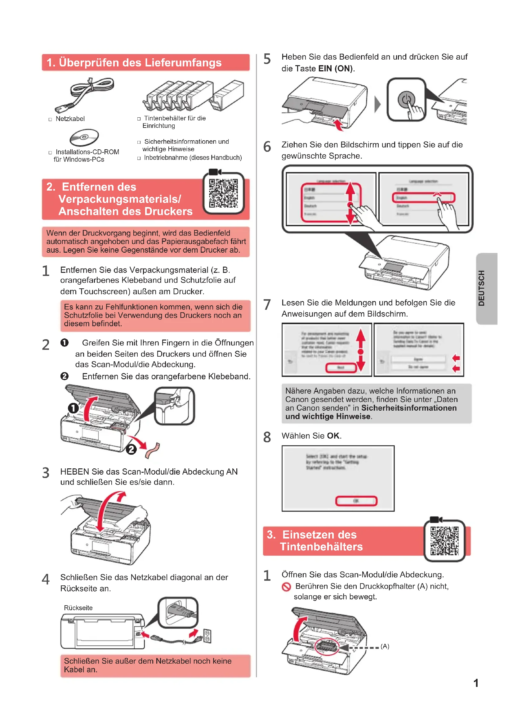 □ Installations-CD-ROM für Windows-PCs□ Netzkabel□ Sicherheitsinformationen und wichtige Hinweise□ Tintenbehälter für die Einrichtung□ Inbetriebnahme (dieses Handbuch)