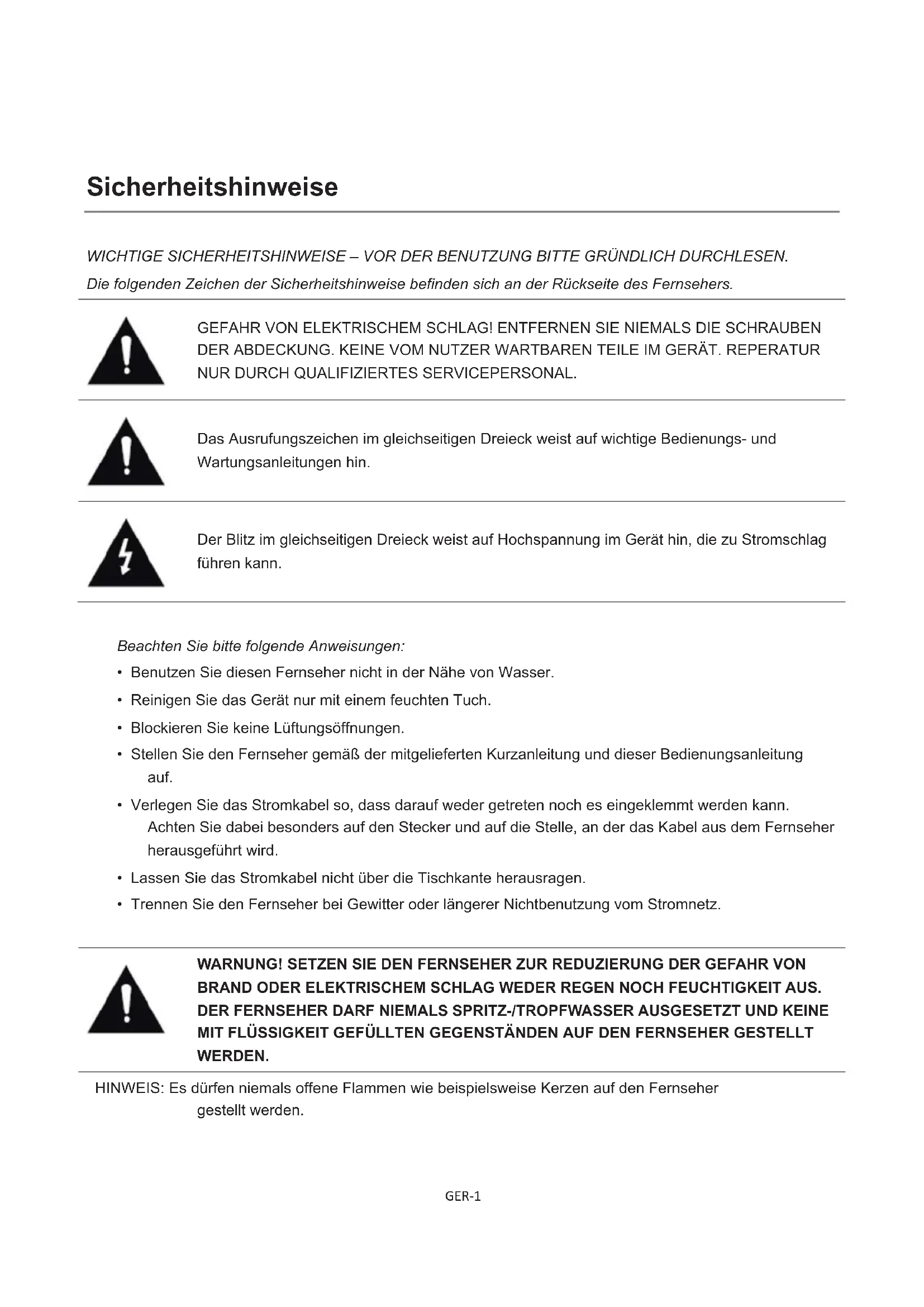 WARNUNG! SETZEN SIE DEN FERNSEHER ZUR REDUZIERUNG DER GEFAHR VON BRAND ODER ELEKTRISCHEM SCHLAG WEDER REGEN NOCH FEUCHTIGKEIT AUS. DER FERNSEHER DARF NIEMALS SPRITZ-/TROPFWASSER AUSGESETZT UND KEINE MIT FLÜSSIGKEIT GEFÜLLTEN GEGENSTÄNDEN AUF DEN FERNSEHER GESTELLT WERDEN. HINWEIS: Es dürfen niemals offene Flammen wie beispielsweise Kerzen auf den Fernseher gestellt werden.GER-2 Frontansicht