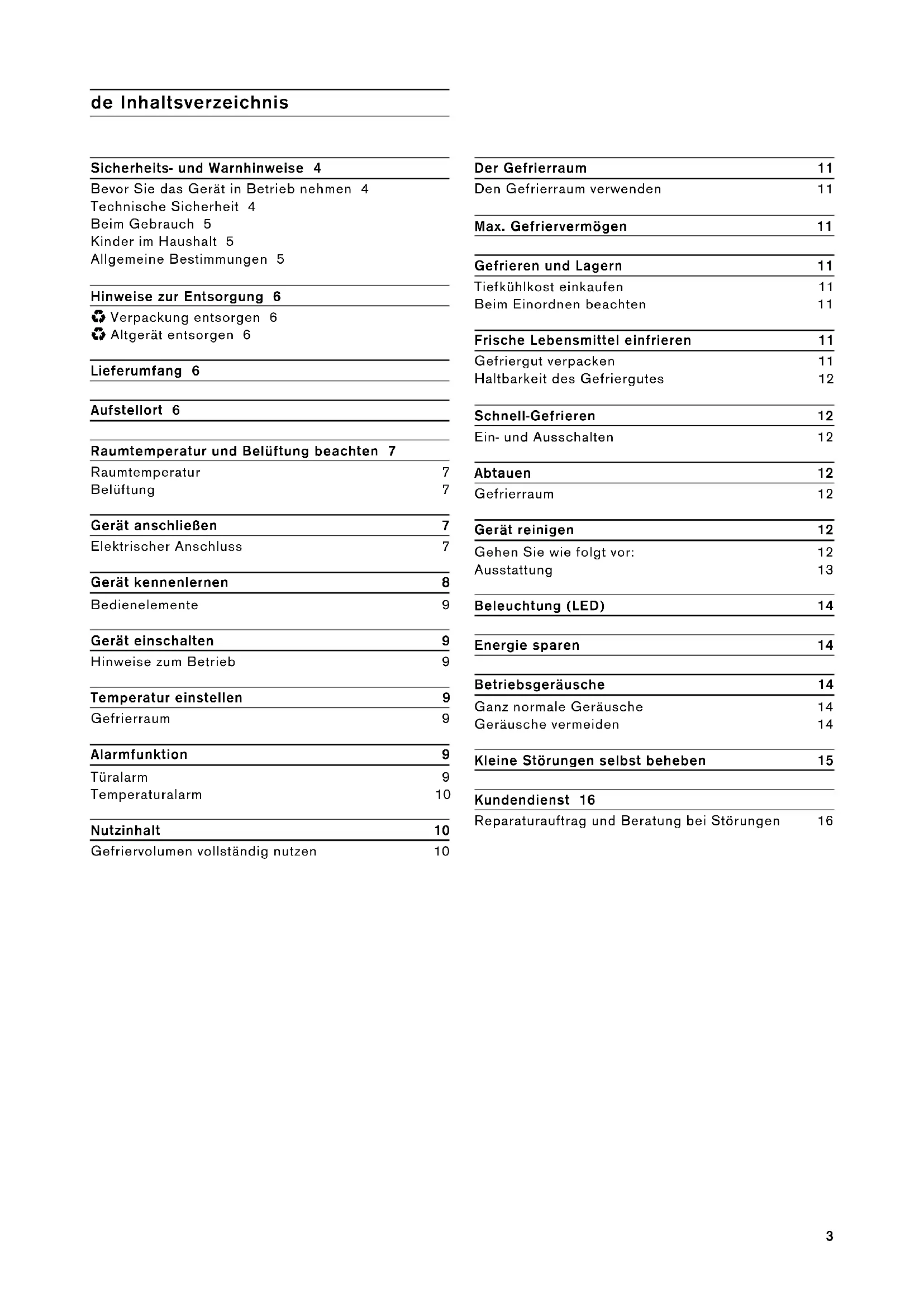 - Altgerät entsorgen 6 Lieferumfang 6 Aufstellort 6 Raumtemperatur und Belüftung beachten 7 Raumtemperatur 7 Belüftung 7 Gerät anschließen 7 Elektrischer Anschluss 7 Gerät kennenlernen 8 Bedienelemente 9 Gerät einschalten 9 Hinweise zum Betrieb 9 Temperatur einstellen 9 Gefrierraum 9 Alarmfunktion 9 Türalarm 9 Temperaturalarm 10 Nutzinhalt 10 Gefriervolumen vollständig nutzen 10 Der Gefrierraum 11 Den Gefrierraum verwenden 11 Max. Gefriervermögen 11 Gefrieren und Lagern 11 Tiefkühlkost einkaufen 11 Beim Einordnen beachten 11 Frische Lebensmittel einfrieren 11 Gefriergut verpacken 11 Haltbarkeit des Gefriergutes 12 Schnell-Gefrieren 12 Ein- und Ausschalten 12 Abtauen 12 Gefrierraum 12 Gerät reinigen 12 Gehen Sie wie folgt vor: 12 Ausstattung 13 Beleuchtung (LED) 14 Energie sparen 14 Betriebsgeräusche 14 Ganz normale Geräusche 14 Geräusche vermeiden 14 Kleine Störungen selbst beheben 15 Kundendienst 16 Reparaturauftrag und Beratung bei Störungen 164 m Sicherheits- und Warnhinweise Bevor Sie das Gerät in Betrieb nehmen Lesen Sie Gebrauchs- und Montageanleitung aufmerksam durch! Sie enthalten wichtige Informationen über Aufstellen, Gebrauch und Wartung des Gerätes. Der Hersteller haftet nicht, wenn Sie die Hinweise und Warnungen der Gebrauchsanleitung missachten. Bewahren Sie alle Unterlagen für späteren Gebrauch oder für Nachbesitzer auf. Technische Sicherheit Das Gerät enthält in geringer Menge das umweltfreundliche, aber brennbare Kältemittel R600a. Achten Sie darauf, dass die Rohre des Kältemittel-Kreislaufes bei Transport oder Montage nicht beschädigt werden. Herausspritzendes Kältemittel kann zu Augenverletzungen führen oder sich entzünden. Bei Beschädigung ▯ offenes Feuer oder Zündquellen vom Gerät fernhalten, ▯ Raum für einige Minuten gut durchlüften, ▯ Gerät ausschalten und Netzstecker ziehen, ▯ Kundendienst benachrichtigen. Je mehr Kältemittel in einem Gerät ist, umso größer muss der Raum sein, in dem das Gerät steht. In zu kleinen Räumen kann bei einem Leck ein brennbares Gas-Luft- Gemisch entstehen. Pro 8 g Kältemittel muss der Raum mindestens 1 m³ groß sein. Die Menge des Kältemittels Ihres Gerätes steht auf dem Typenschild im Inneren des Gerätes. Wenn die Netzanschlussleitung dieses Gerätes beschädigt wird, muss sie durch den Hersteller, Kundendienst oder eine ähnlich qualifizierte Person ersetzt werden. Unsachgemäße Installationen und Reparaturen können den Benutzer erheblich gefährden. Reparaturen dürfen nur durch den Hersteller, Kundendienst oder eine ähnlich qualifizierte Person durchgeführt werden. Es dürfen nur Originalteile des Herstellers benutzt werden. Nur bei diesen Teilen gewährleistet der Hersteller, dass sie die Sicherheitsanforderungen erfüllen. Eine Verlängerung der Netzanschlussleitung darf nur über den Kundendienst bezogen werden.5 Beim Gebrauch ▯ Nie elektrische Geräte innerhalb des Gerätes verwenden (z. B. Heizgeräte, elektrische Eisbereiter usw.). Explosionsgefahr! ▯ Nie das Gerät mit einem Dampfreinigungsgerät abtauen oder reinigen! Der Dampf kann an elektrische Teile gelangen und einen Kurzschluss auslösen. Stromschlaggefahr! ▯ Keine spitzen oder scharfkantigen Gegenstände verwenden, um Reif- und Eisschichten zu entfernen. Sie könnten damit die Kältemittel-Rohre beschädigen. Herausspritzendes Kältemittel kann sich entzünden oder zu Augenverletzungen führen. ▯ Keine Produkte mit brennbaren Treibgasen (z. B. Spraydosen) und keine explosiven Stoffe lagern. Explosionsgefahr! ▯ Sockel, Auszüge, Türen usw. nicht als Trittbrett oder zum Abstützen missbrauchen. ▯ Zum Abtauen und Reinigen Netzstecker ziehen oder Sicherung ausschalten. Am Netzstecker ziehen, nicht am Anschlusskabel. ▯ Hochprozentigen Alkohol nur dicht verschlossen und stehend lagern. ▯ Kunststoffteile und Türdichtung nicht mit Öl oder Fett verschmutzen. Kunststoffteile und Türdichtung werden sonst porös. ▯ Be- und Entlüftungsöffnungen für das Gerät nie abdecken oder zustellen. ▯ Vermeidung von Risiken für Kinder und gefährdete Personen: Gefährdet sind Kinder, Personen, die körperlich, psychisch oder in ihrer Wahrnehmung eingeschränkt sind sowie Personen, die nicht genügend Wissen über die sichere Bedienung des Gerätes haben. Stellen Sie sicher, dass Kinder und gefährdete Personen die Gefahren verstanden haben. Eine für die Sicherheit verantwortliche Person muss Kinder und gefährdete Personen am Gerät beaufsichtigen oder anleiten. Nur Kinder ab 8 Jahren das Gerät benutzen lassen. Bei Reinigung und Wartung Kinder beaufsichtigen. Niemals Kinder mit dem Gerät spielen lassen. ▯ Im Gefrierraum keine Flüssigkeiten in Flaschen und Dosen lagern (besonders kohlensäurehaltige Getränke). Flaschen und Dosen können platzen! ▯ Nie Gefriergut sofort, nachdem es aus dem Gefrierraum genommen wird, in den Mund nehmen. Gefrierverbrennungsgefahr! ▯ Vermeiden Sie längeren Kontakt der Hände mit dem Gefriergut, Eis oder den Verdampferrohren usw. Gefrierverbrennungsgefahr! Kinder im Haushalt ▯ Verpackung und deren Teile nicht Kindern überlassen. Erstickungsgefahr durch Faltkartons und Folien! ▯ Das Gerät ist kein Spielzeug für Kinder! ▯ Bei Gerät mit Türschloss: Schlüssel außer Reichweite von Kindern aufbewahren! Allgemeine Bestimmungen Das Gerät eignet sich ▯ zum Gefrieren von Lebensmitteln, ▯ zur Eisbereitung. Dieses Gerät ist für den häuslichen Gebrauch im Privathaushalt und das häusliche Umfeld bestimmt. Das Gerät ist funkentstört nach EU-Richtlinie 2004/108/EC. Der Kältekreislauf ist auf Dichtheit geprüft. Dieses Erzeugnis entspricht den einschlägigen Sicherheitsbestimmungen für Elektrogeräte (EN 60335-2-24). Dieses Gerät ist für eine Nutzung bis zu einer Höhe von maximal 2000 Metern über dem Meeresspiegel bestimmt.6 Hinweise zur Entsorgung