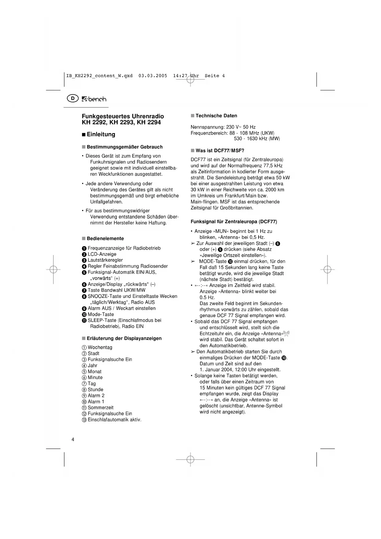 KH 2293 - Radiowecker EBENCH - Kostenlose Bedienungsanleitung