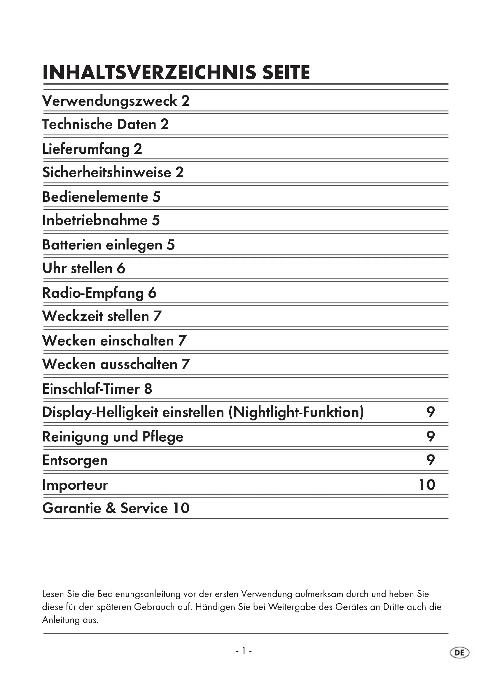 KH 2237 CV_KH2236_39_V6450_LB1 29.10.2007 10:23 Uhr Seite 7INHALTSVERZEICHNIS SEITE Verwendungszweck 2 Technische Daten 2 Lieferumfang 2 Sicherheitshinweise 2 Bedienelemente 5 Inbetriebnahme 5 Batterien einlegen 5 Uhr stellen 6 Radio-Empfang 6 Weckzeit stellen 7 Wecken einschalten 7 Wecken ausschalten 7 Einschlaf-Timer 8 Display-Helligkeit einstellen (Nightlight-Funktion) 9 Reinigung und Pflege 9 Entsorgen 9 Importeur 10 Garantie & Service 10 Lesen Sie die Bedienungsanleitung vor der ersten Verwendung aufmerksam durch und heben Sie diese für den späteren Gebrauch auf. Händigen Sie bei Weitergabe des Gerätes an Dritte auch die Anleitung aus.