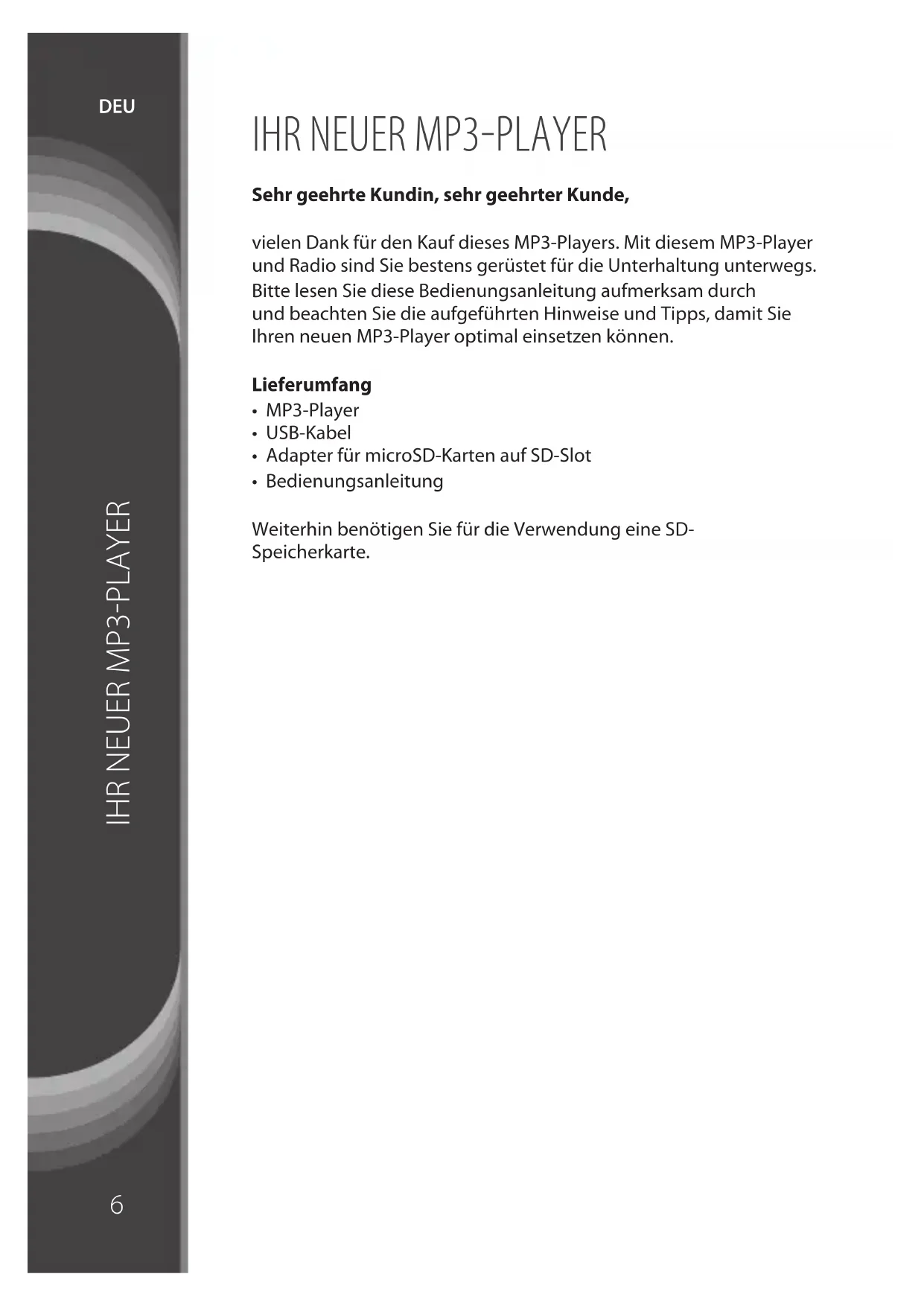 Sehr geehrte Kundin, sehr geehrter Kunde, vielen Dank für den Kauf dieses MP3-Players. Mit diesem MP3-Player und Radio sind Sie bestens gerüstet für die Unterhaltung unterwegs. Bitte lesen Sie diese Bedienungsanleitung aufmerksam durch und beachten Sie die aufgeführten Hinweise und Tipps, damit Sie Ihren neuen MP3-Player optimal einsetzen können. Lieferumfang