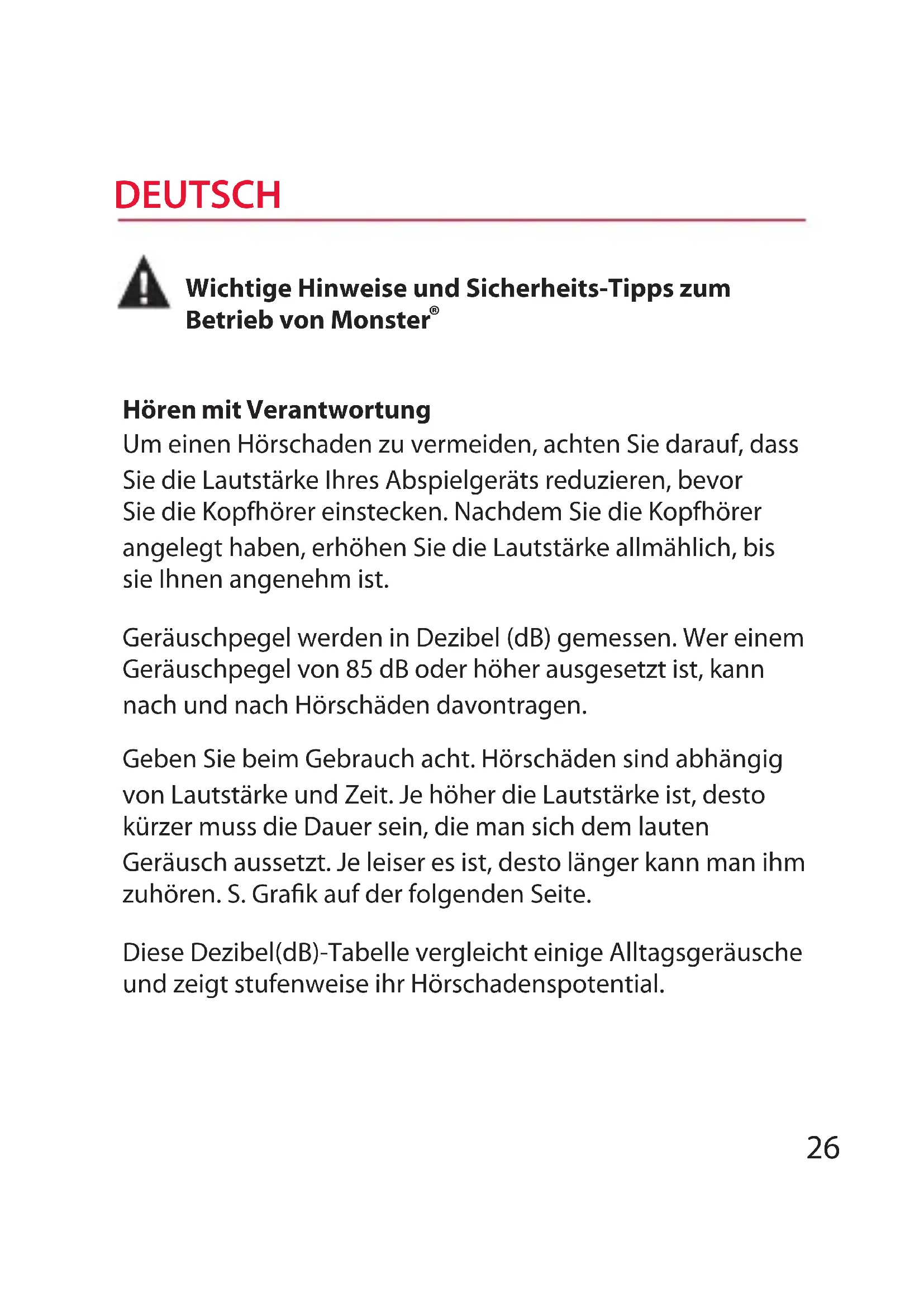 Hören mit Verantwortung Um einen Hörschaden zu vermeiden, achten Sie darauf, dass Sie die Lautstärke Ihres Abspielgeräts reduzieren, bevor Sie die Kopfhörer einstecken. Nachdem Sie die Kopfhörer angelegt haben, erhöhen Sie die Lautstärke allmählich, bis sie Ihnen angenehm ist. Geräuschpegel werden in Dezibel (dB) gemessen. Wer einem Geräuschpegel von 85 dB oder höher ausgesetzt ist, kann nach und nach Hörschäden davontragen. Geben Sie beim Gebrauch acht. Hörschäden sind abhängig von Lautstärke und Zeit. Je höher die Lautstärke ist, desto kürzer muss die Dauer sein, die man sich dem lauten Geräusch aussetzt. Je leiser es ist, desto länger kann man ihm zuhören. S. Grak auf der folgenden Seite. Diese Dezibel(dB)-Tabelle vergleicht einige Alltagsgeräusche und zeigt stufenweise ihr Hörschadenspotential. DEUTSCH