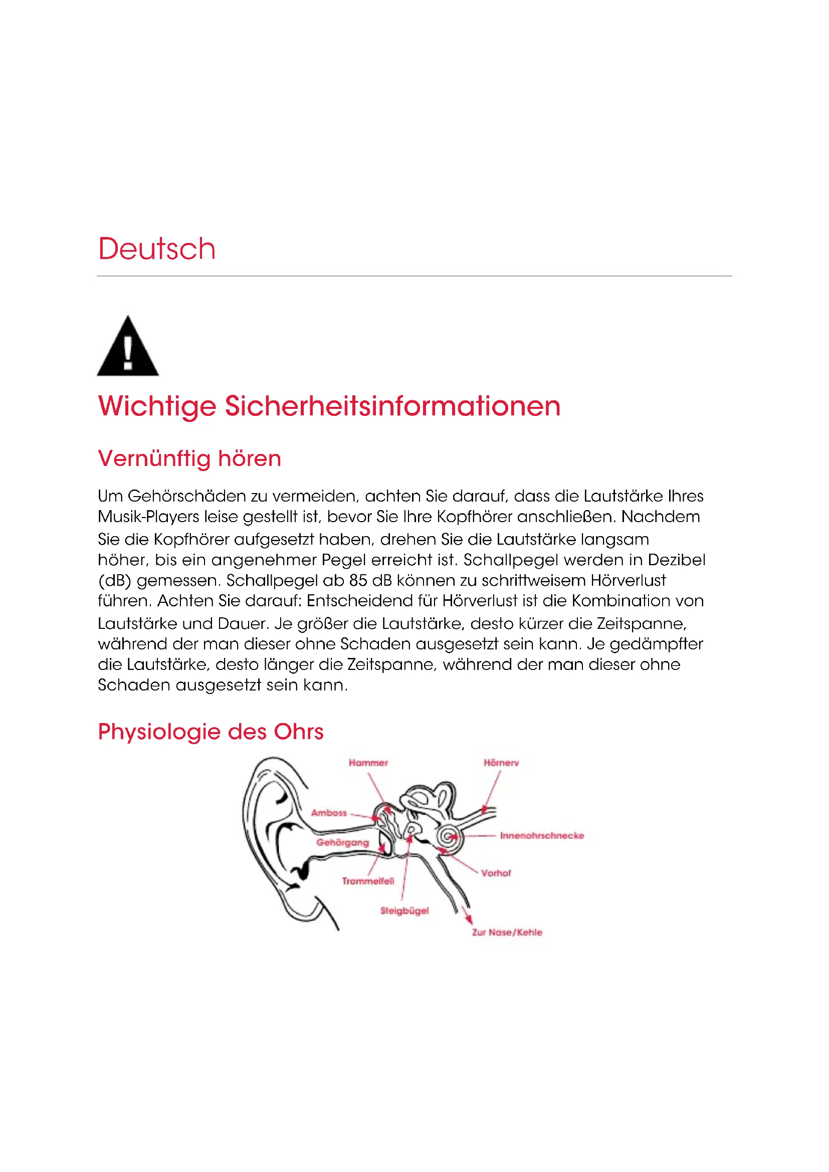 ItalianoWichtige Sicherheitsinformationen Vernünftig hören Um Gehörschäden zu vermeiden, achten Sie darauf, dass die Lautstärke Ihres Musik-Players leise gestellt ist, bevor Sie Ihre Kopfhörer anschließen. Nachdem Sie die Kopfhörer aufgesetzt haben, drehen Sie die Lautstärke langsam höher, bis ein angenehmer Pegel erreicht ist. Schallpegel werden in Dezibel (dB) gemessen. Schallpegel ab 85 dB können zu schrittweisem Hörverlust führen. Achten Sie darauf: Entscheidend für Hörverlust ist die Kombination von Lautstärke und Dauer. Je größer die Lautstärke, desto kürzer die Zeitspanne, während der man dieser ohne Schaden ausgesetzt sein kann. Je gedämpfter die Lautstärke, desto länger die Zeitspanne, während der man dieser ohne Schaden ausgesetzt sein kann. Physiologie des Ohrs Deutsch Hammer Hörnerv Steigbügel Trommelfell Gehörgang Innenohrschnecke Amboss Vorhof Zur Nase/Kehle44