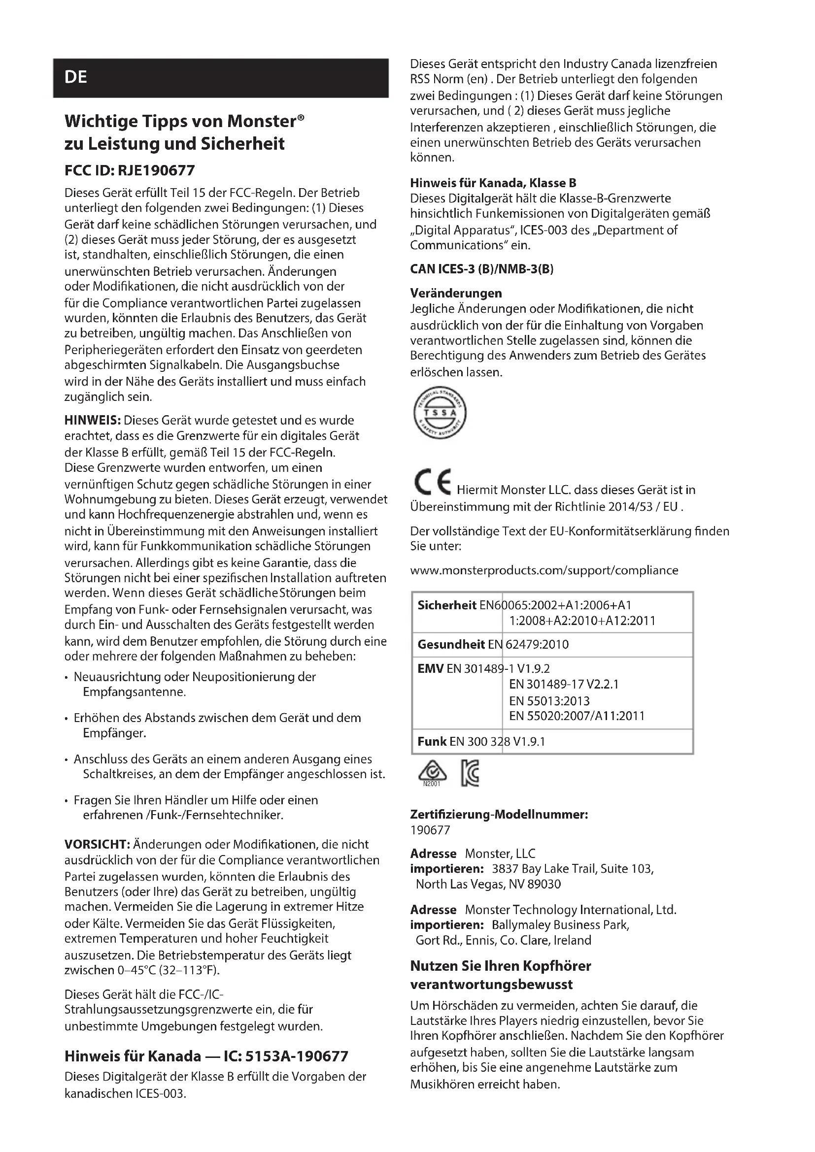 - Fragen Sie Ihren Händler um Hilfe oder einen erfahrenen /Funk-/Fernsehtechniker. VORSICHT: Änderungen oder Modikationen, die nicht ausdrücklich von der für die Compliance verantwortlichen Partei zugelassen wurden, könnten die Erlaubnis des Benutzers (oder Ihre) das Gerät zu betreiben, ungültig machen. Vermeiden Sie die Lagerung in extremer Hitze oder Kälte. Vermeiden Sie das Gerät Flüssigkeiten, extremen Temperaturen und hoher Feuchtigkeit auszusetzen. Die Betriebstemperatur des Geräts liegt zwischen 0–45°C (32–113°F). Dieses Gerät hält die FCC-/IC- Strahlungsaussetzungsgrenzwerte ein, die für unbestimmte Umgebungen festgelegt wurden. Hinweis für Kanada — IC: 5153A-190677 Dieses Digitalgerät der Klasse B erfüllt die Vorgaben der kanadischen ICES-003. Dieses Gerät entspricht den Industry Canada lizenzfreien RSS Norm (en) . Der Betrieb unterliegt den folgenden zwei Bedingungen : (1) Dieses Gerät darf keine Störungen verursachen, und ( 2) dieses Gerät muss jegliche Interferenzen akzeptieren , einschließlich Störungen, die einen unerwünschten Betrieb des Geräts verursachen können. Hinweis für Kanada, Klasse B Dieses Digitalgerät hält die Klasse-B-Grenzwerte hinsichtlich Funkemissionen von Digitalgeräten gemäß „Digital Apparatus“, ICES-003 des „Department of Communications“ ein. CAN ICES-3 (B)/NMB-3(B) Veränderungen Jegliche Änderungen oder Modikationen, die nicht ausdrücklich von der für die Einhaltung von Vorgaben verantwortlichen Stelle zugelassen sind, können die Berechtigung des Anwenders zum Betrieb des Gerätes erlöschen lassen. Hiermit Monster LLC. dass dieses Gerät ist in Übereinstimmung mit der Richtlinie 2014/53 / EU . Der vollständige Text der EU-Konformitätserklärung nden Sie unter: www.monsterproducts.com/support/compliance Sicherheit EN60065:2002+A1:2006+A1 1:2008+A2:2010+A12:2011 Gesundheit EN 62479:2010