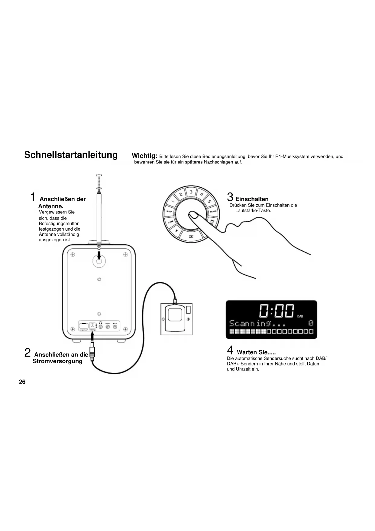 NL26 Schnellstartanleitung 1 Anschließen der Antenne. Vergewissern Sie sich, dass die Befestigungsmutter festgezogen und die Antenne vollständig ausgezogen ist. 2 Anschließen an die Stromversorgung 3 Einschalten Drücken Sie zum Einschalten die Lautstärke-Taste. 4 Warten Sie..... Die automatische Sendersuche sucht nach DAB/ DAB+-Sendern in Ihrer Nähe und stellt Datum und Uhrzeit ein. Wichtig: Bitte lesen Sie diese Bedienungsanleitung, bevor Sie Ihr R1-Musiksystem verwenden, und bewahren Sie sie für ein späteres Nachschlagen auf.27 Grundlegende Bedienelemente „„Taste gedrückt halten“ bedeutet, dass Sie die Taste mindestens 2 Sekunden lang drücken sollen. Standby – Drücken Sie diese Taste, um das Gerät ein- bzw. auszuschalten. Volume (Lautstärke) – Drehen Sie den Regler nach links oder rechts. Snooze (Pausentaste) – Drücken Sie diese Taste, um den Alarm 5 Minuten stumm zu schalten. Cancel alarm (Alarm abstellen) – Halten Sie die Taste gedrückt, um den Alarm abzustellen. Sender Sie können 5 DAB und 5 FM-Sender speichern. Drücken Sie eine Zifferntaste, um einen Sender auszuwählen. Halten Sie eine Zifferntaste gedrückt, um den Sender, der aktuell gespielt wird, zu speichern. Ändern der Wiedergabequelle Drücken Sie SOURCE, um zwischen DAB, FM und AUX auszuwählen. Die ausgewählte Wiedergabequelle wird automatisch geladen. Sleep (Timer) Stellen Sie den Timer so ein, damit der R1 automatisch in den Standby-Modus wechselt. Drücken Sie SLEEP, um 15, 30, 45, 60, 90 Minuten oder AUS zu wählen. Drücken Sie OK , um die Eingabefzu bestätigen. Wenn der Timer aktiviert ist, drücken Sie SLEEP, um die verbleibende Zeit anzuzeigen. Das Uhrsymbol zeigt an, dass der Timer aktiv ist. Info Drücken Sie INFO/MENU, um durch die Senderinformationen zu navigieren, z. B. Text, Uhrzeit und Datum, Inhaltsart usw. Ändern der Sender DAB: Drücken Sie ▼▲, um durch die verfügbaren Sender zu navigieren. Drücken Sie OK, um den Sender auszuwählen. FM scan (FM-Sendersuche): Halten Sie ▲▼ gedrückt, um nach dem nächsten verfügbaren Sender zu suchen. FM manual tune (manuelle FM- Sendersuche): Drücken Sie ▼▲, um die Frequenz zu ändern. Alarm Weitere Hinweise zur Verwendung des Alarms nden Sie auf Seite 30. DE28