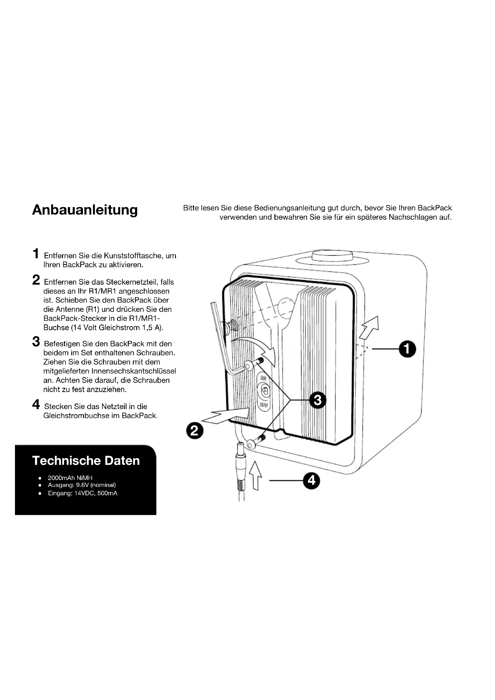 deses an Ihr R1/MR1 angeschlossen ist. Schieber den Den BackPack uber die Antenne (R1) und drucken Sie den BackPack-Stecker in die R1/MR1Buchse (14 Volt Gleichstrom 1,5 A).