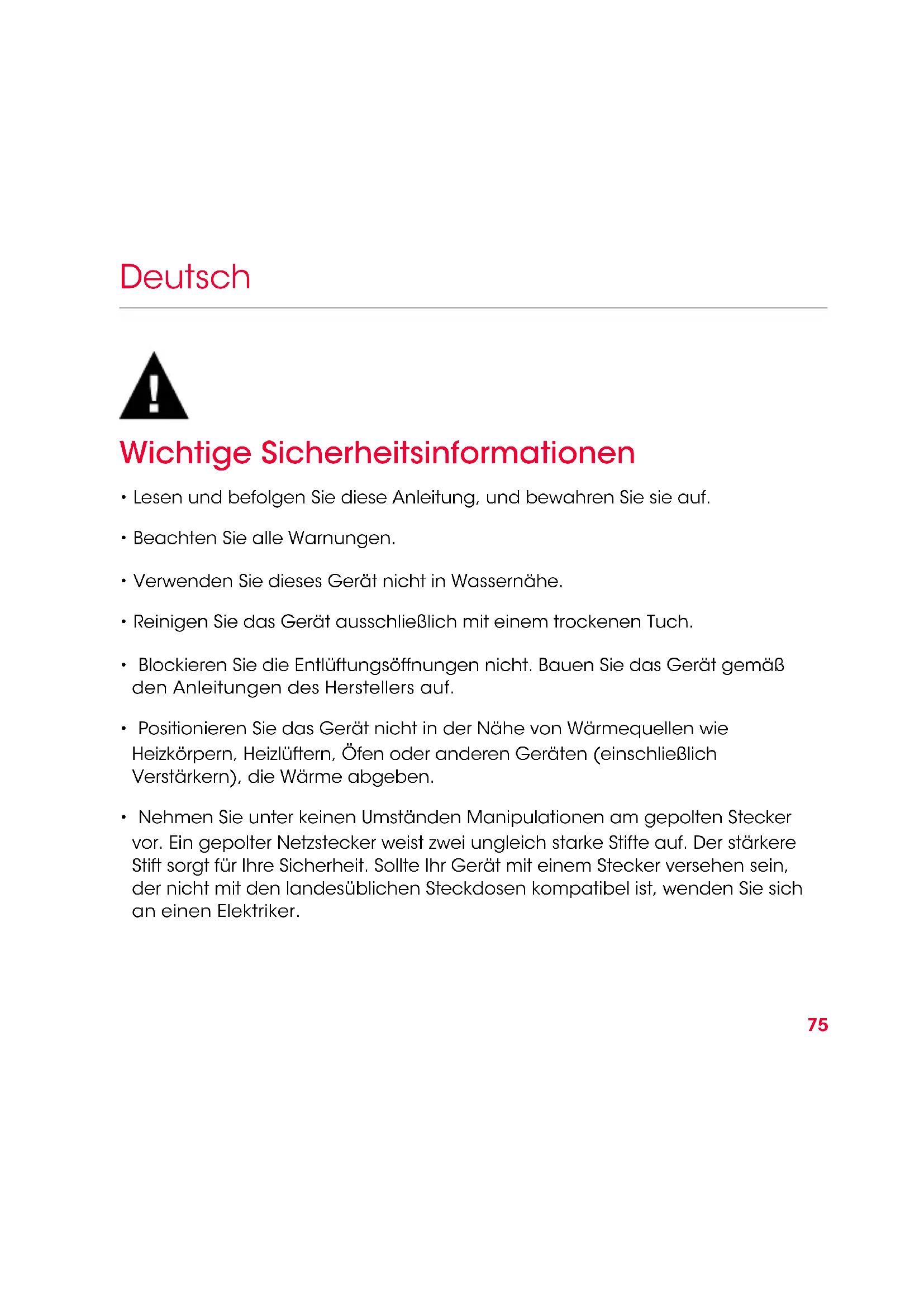 - Nehmen Sie unter keinen Umständen Manipulationen am gepolten Stecker vor. Ein gepolter Netzstecker weist zwei ungleich starke Stifte auf. Der stärkere Stift sorgt für Ihre Sicherheit. Sollte Ihr Gerät mit einem Stecker versehen sein, der nicht mit den landesüblichen Steckdosen kompatibel ist, wenden Sie sich an einen Elektriker.76 Deutsch