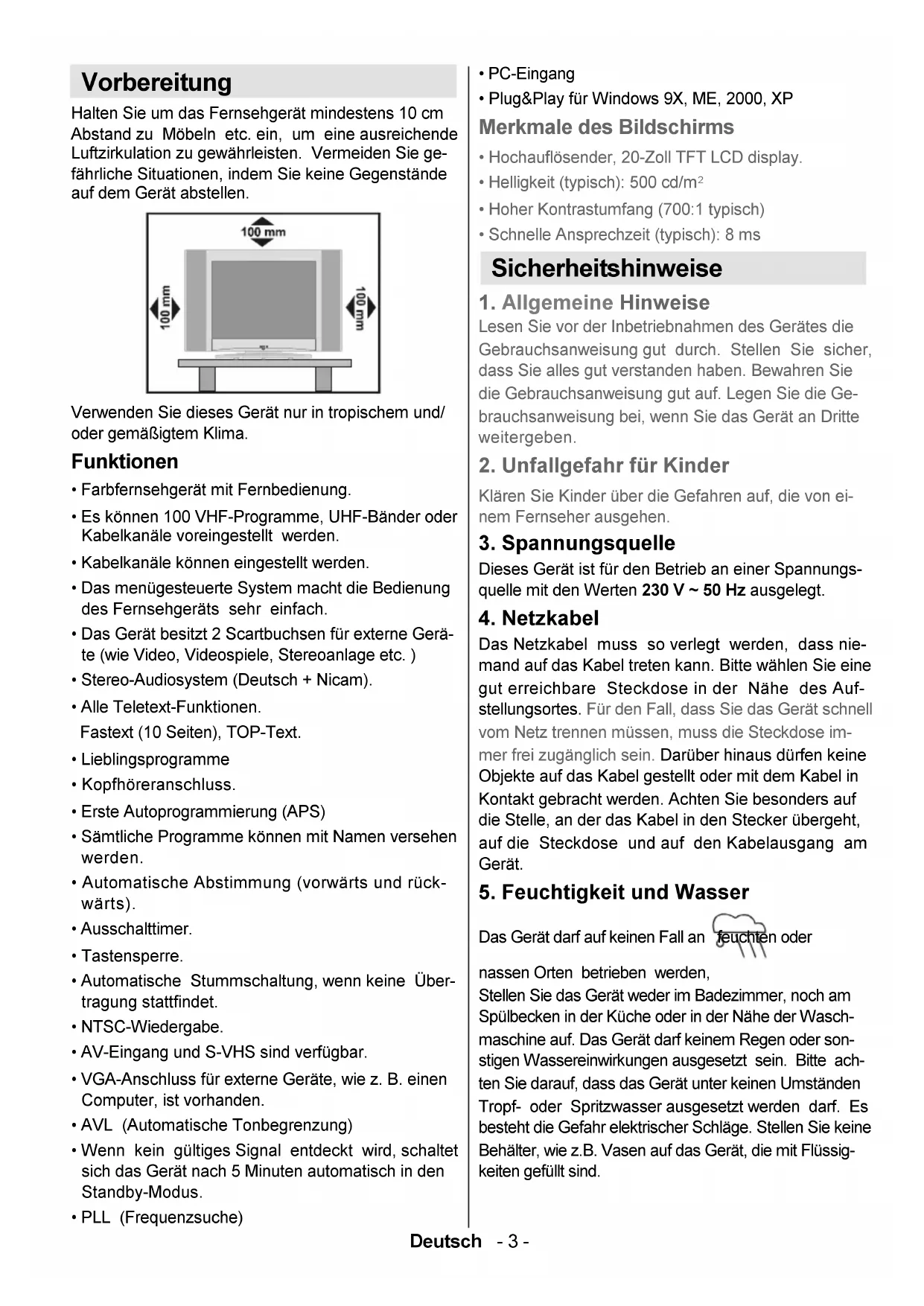 Das Gerät darf auf keinen Fall an feuchten oder nassen Orten betrieben werden, Stellen Sie das Gerät weder im Badezimmer, noch am Spülbecken in der Küche oder in der Nähe der Wasch- maschine auf. Das Gerät darf keinem Regen oder son- stigen Wassereinwirkungen ausgesetzt sein. Bitte ach- ten Sie darauf, dass das Gerät unter keinen Umständen Tropf- oder Spritzwasser ausgesetzt werden darf. Es besteht die Gefahr elektrischer Schläge. Stellen Sie keine Behälter, wie z.B. Vasen auf das Gerät, die mit Flüssig- keiten gefüllt sind. Vorbereitung Halten Sie um das Fernsehgerät mindestens 10 cm Abstand zu Möbeln etc. ein, um eine ausreichende Luftzirkulation zu gewährleisten. Vermeiden Sie ge- fährliche Situationen, indem Sie keine Gegenstände auf dem Gerät abstellen. Verwenden Sie dieses Gerät nur in tropischem und/ oder gemäßigtem Klima. Funktionen Farbfernsehgerät mit Fernbedienung. Es können 100 VHF-Programme, UHF-Bänder oder Kabelkanäle voreingestellt werden. Kabelkanäle können eingestellt werden. Das menügesteuerte System macht die Bedienung des Fernsehgeräts sehr einfach. Das Gerät besitzt 2 Scartbuchsen für externe Gerä- te (wie Video, Videospiele, Stereoanlage etc. ) Stereo-Audiosystem (Deutsch + Nicam). Alle Teletext-Funktionen. Fastext (10 Seiten), TOP-Text. Lieblingsprogramme Kopfhöreranschluss. Erste Autoprogrammierung (APS) Sämtliche Programme können mit Namen versehen werden. Automatische Abstimmung (vorwärts und rück- wärts). Ausschalttimer. Tastensperre. Automatische Stummschaltung, wenn keine Über- tragung stattfindet. NTSC-Wiedergabe. AV-Eingang und S-VHS sind verfügbar. VGA-Anschluss für externe Geräte, wie z. B. einen Computer, ist vorhanden. AVL (Automatische Tonbegrenzung) Wenn kein gültiges Signal entdeckt wird, schaltet sich das Gerät nach 5 Minuten automatisch in den Standby-Modus. PLL (Frequenzsuche) 01-ALM-2008-1243UK-17MB24-(HP LINE OUT)(YPbPr)-50095832.P65 15.11.2006, 19:413Deutsch - 4 -
