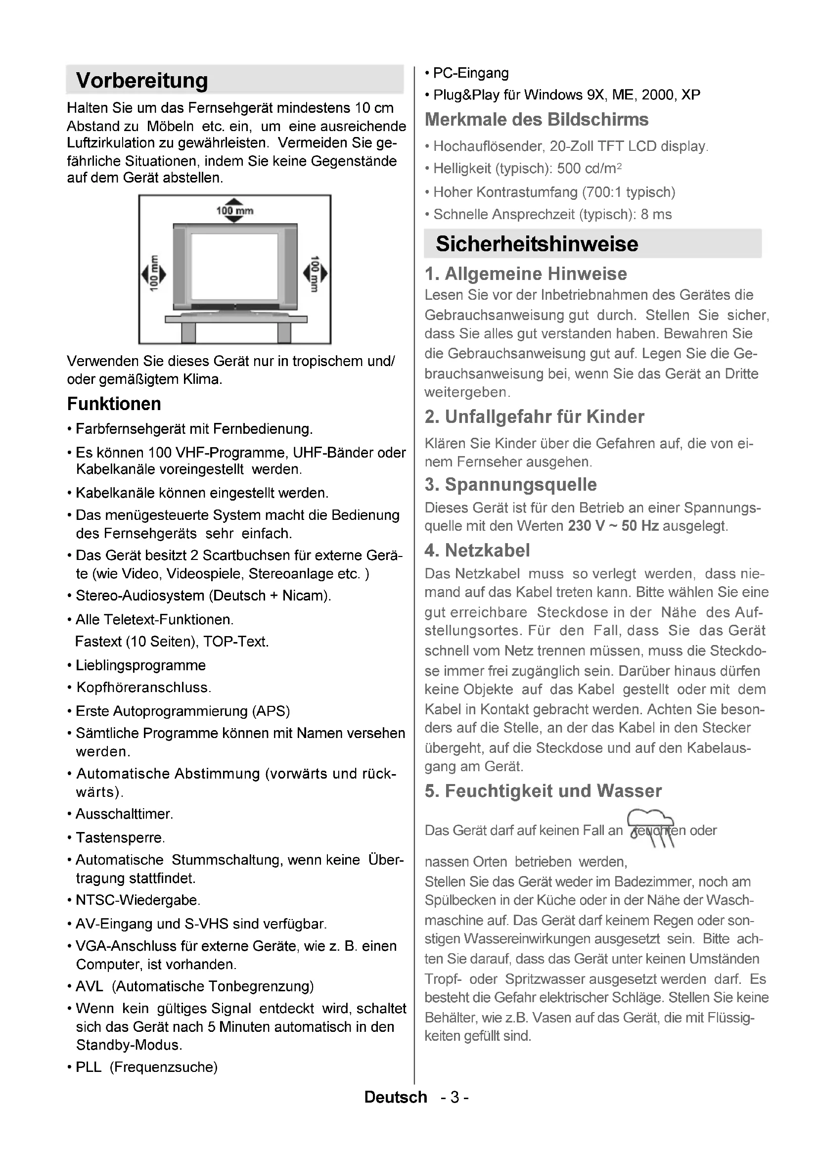 Das Gerät darf auf keinen Fall an feuchten oder nassen Orten betrieben werden, Stellen Sie das Gerät weder im Badezimmer, noch am Spülbecken in der Küche oder in der Nähe der Wasch- maschine auf. Das Gerät darf keinem Regen oder son- stigen Wassereinwirkungen ausgesetzt sein. Bitte ach- ten Sie darauf, dass das Gerät unter keinen Umständen Tropf- oder Spritzwasser ausgesetzt werden darf. Es besteht die Gefahr elektrischer Schläge. Stellen Sie keine Behälter, wie z.B. Vasen auf das Gerät, die mit Flüssig- keiten gefüllt sind. Vorbereitung Halten Sie um das Fernsehgerät mindestens 10 cm Abstand zu Möbeln etc. ein, um eine ausreichende Luftzirkulation zu gewährleisten. Vermeiden Sie ge- fährliche Situationen, indem Sie keine Gegenstände auf dem Gerät abstellen. Verwenden Sie dieses Gerät nur in tropischem und/ oder gemäßigtem Klima. Funktionen Farbfernsehgerät mit Fernbedienung. Es können 100 VHF-Programme, UHF-Bänder oder Kabelkanäle voreingestellt werden. Kabelkanäle können eingestellt werden. Das menügesteuerte System macht die Bedienung des Fernsehgeräts sehr einfach. Das Gerät besitzt 2 Scartbuchsen für externe Gerä- te (wie Video, Videospiele, Stereoanlage etc. ) Stereo-Audiosystem (Deutsch + Nicam). Alle Teletext-Funktionen. Fastext (10 Seiten), TOP-Text. Lieblingsprogramme Kopfhöreranschluss. Erste Autoprogrammierung (APS) Sämtliche Programme können mit Namen versehen werden. Automatische Abstimmung (vorwärts und rück- wärts). Ausschalttimer. Tastensperre. Automatische Stummschaltung, wenn keine Über- tragung stattfindet. NTSC-Wiedergabe. AV-Eingang und S-VHS sind verfügbar. VGA-Anschluss für externe Geräte, wie z. B. einen Computer, ist vorhanden. AVL (Automatische Tonbegrenzung) Wenn kein gültiges Signal entdeckt wird, schaltet sich das Gerät nach 5 Minuten automatisch in den Standby-Modus. PLL (Frequenzsuche) 01-ALM-2011-1243UK-17MB24-(HP LINE OUT)(YPbPr)-50095833.P65 16.11.2006, 15:133Deutsch - 4 -