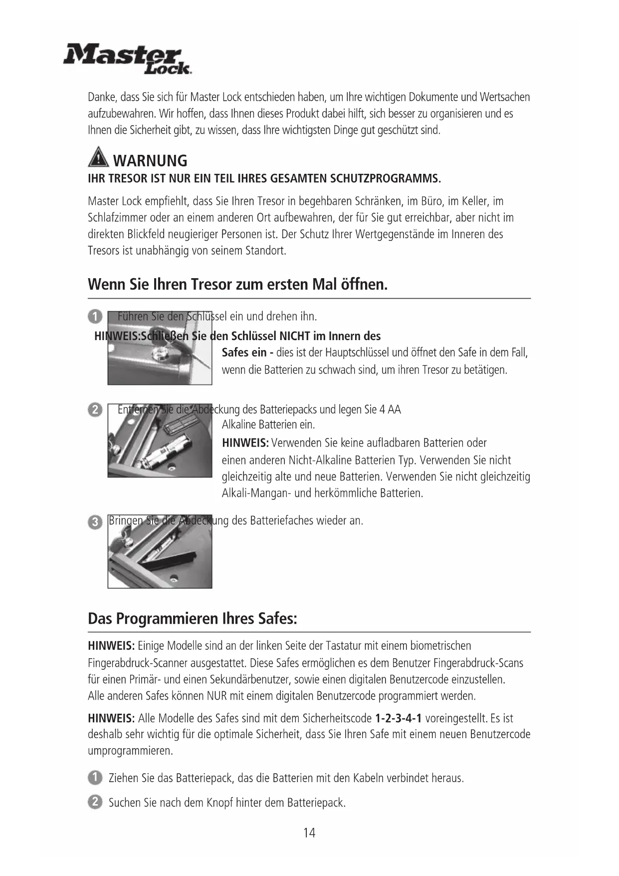 Danke, dass Sie sich für Master Lock entschieden haben, um Ihre wichtigen Dokumente und Wertsachen aufzubewahren. Wir hoffen, dass Ihnen dieses Produkt dabei hilft, sich besser zu organisieren und es Ihnen die Sicherheit gibt, zu wissen, dass Ihre wichtigsten Dinge gut geschützt sind.