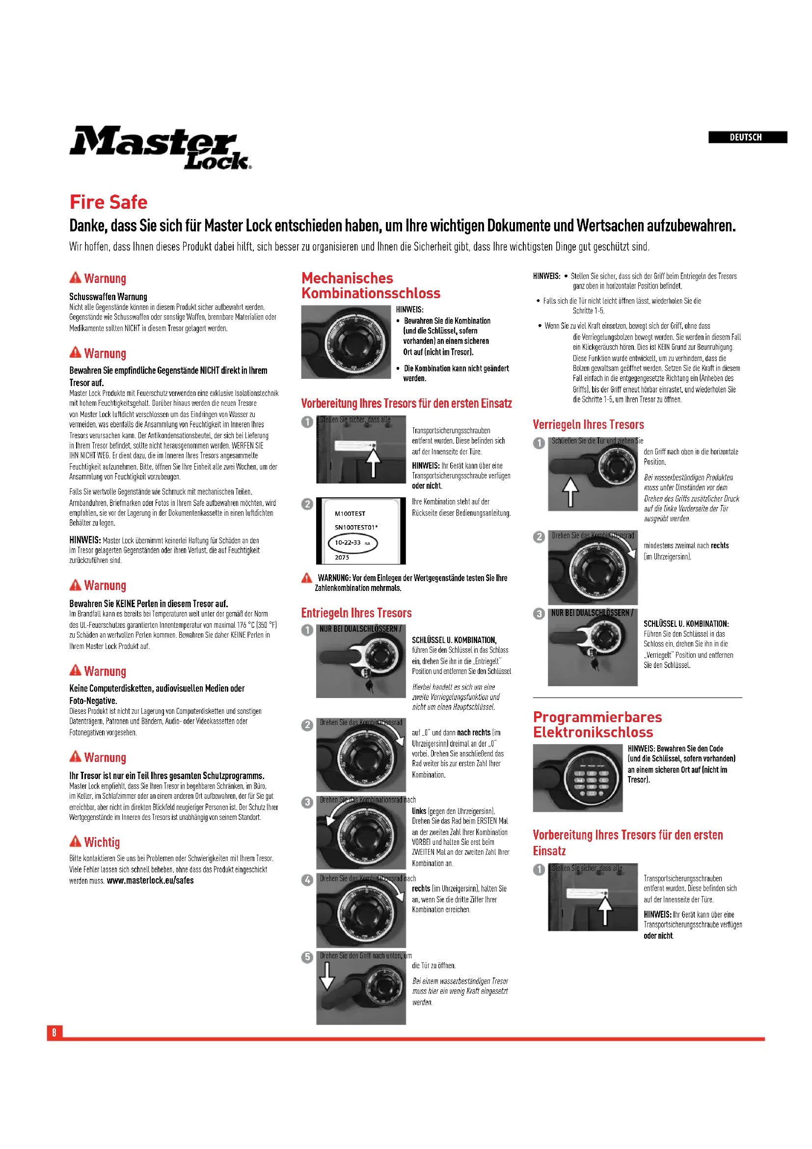 Im Brandfall kann es bereits bei Temperaturen welt unter der gemäß der Korm des UL Feuerschutzen garantierten Innertemater von maximal 176 °C [350°F] zu Schaden an wertvolum Pettenkommen. Bewahren sie daher KEINE Petten in ihren Master Lock Produkt auf.