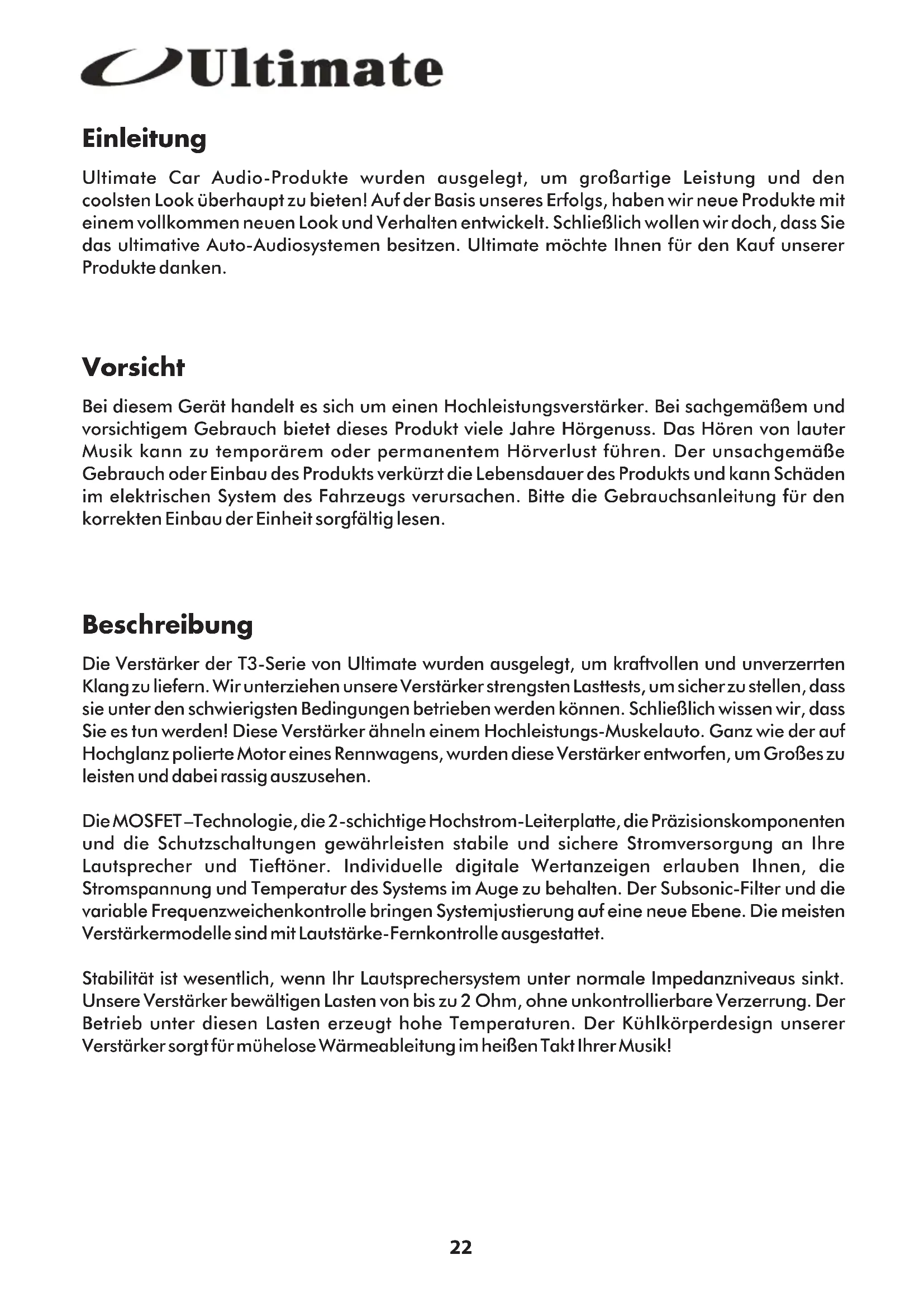 - 4 ohms DAT: Relación señal/ruido: Respuesta de frecuencia: Impedancia de altavoz: Factor damping efectivo: Sensibilidad de entrada: Dimensiones: Fusible: Corriente máxima: T3-1250 250 x 1 320 x 1 440 x 1 620 x 1 0.06% 90db 5-400 Hz 2 ohmios 210 @ 4 ohmios 250mV - 8V 11” x 16” x 2 3/8” 28cm x 41cm x 6cm 20A x 2 23A T3-500D 500 x 1 900 x 1 1000 x 1 1800 x 1 0.12% 90db 5-400K hz 2 ohmios 230 @ 4 ohmios 250mV - 8V 11” x 19 3/4” x 2 3/8” 28cm x 50cm x 6cm 40A x 3 55A Especificaciones T3-1000D 1000 x 1 1200 x 1 1600 x 1 3500 x 1 0.04% 91db 5-400K hz 2 ohmios 220 @ 4 ohmios 250mV - 8V 11” x 23” x 2 3/8” 28cm x 58cm x 6cm Externo solamente 136A T3-Series22 Ultimate Car Audio-Produkte wurden ausgelegt, um großartige Leistung und den coolsten Look überhaupt zu bieten! Auf der Basis unseres Erfolgs, haben wir neue Produkte mit einem vollkommen neuen Look und Verhalten entwickelt. Schließlich wollen wir doch, dass Sie das ultimative Auto-Audiosystemen besitzen. Ultimate möchte Ihnen für den Kauf unserer Produkte danken. Einleitung Bei diesem Gerät handelt es sich um einen Hochleistungsverstärker. Bei sachgemäßem und vorsichtigem Gebrauch bietet dieses Produkt viele Jahre Hörgenuss. Das Hören von lauter Musik kann zu temporärem oder permanentem Hörverlust führen. Der unsachgemäße Gebrauch oder Einbau des Produkts verkürzt die Lebensdauer des Produkts und kann Schäden im elektrischen System des Fahrzeugs verursachen. Bitte die Gebrauchsanleitung für den korrekten Einbau der Einheit sorgfältig lesen. Vorsicht Die Verstärker der T3-Serie von Ultimate wurden ausgelegt, um kraftvollen und unverzerrten Klang zu liefern. Wir unterziehen unsere Verstärker strengsten Lasttests, um sicher zu stellen, dass sie unter den schwierigsten Bedingungen betrieben werden können. Schließlich wissen wir, dass Sie es tun werden! Diese Verstärker ähneln einem Hochleistungs-Muskelauto. Ganz wie der auf Hochglanz polierte Motor eines Rennwagens, wurden diese Verstärker entworfen, um Großes zu leisten und dabei rassig auszusehen. Die MOSFET –Technologie, die 2-schichtige Hochstrom-Leiterplatte, die Präzisionskomponenten und die Schutzschaltungen gewährleisten stabile und sichere Stromversorgung an Ihre Lautsprecher und Tieftöner. Individuelle digitale Wertanzeigen erlauben Ihnen, die Stromspannung und Temperatur des Systems im Auge zu behalten. Der Subsonic-Filter und die variable Frequenzweichenkontrolle bringen Systemjustierung auf eine neue Ebene. Die meisten Verstärkermodelle sind mit Lautstärke-Fernkontrolle ausgestattet. Stabilität ist wesentlich, wenn Ihr Lautsprechersystem unter normale Impedanzniveaus sinkt. Unsere Verstärker bewältigen Lasten von bis zu 2 Ohm, ohne unkontrollierbare Verzerrung. Der Betrieb unter diesen Lasten erzeugt hohe Temperaturen. Der Kühlkörperdesign unserer Verstärker sorgt für mühelose Wärmeableitung im heißen Takt Ihrer Musik! BeschreibungT3-Series