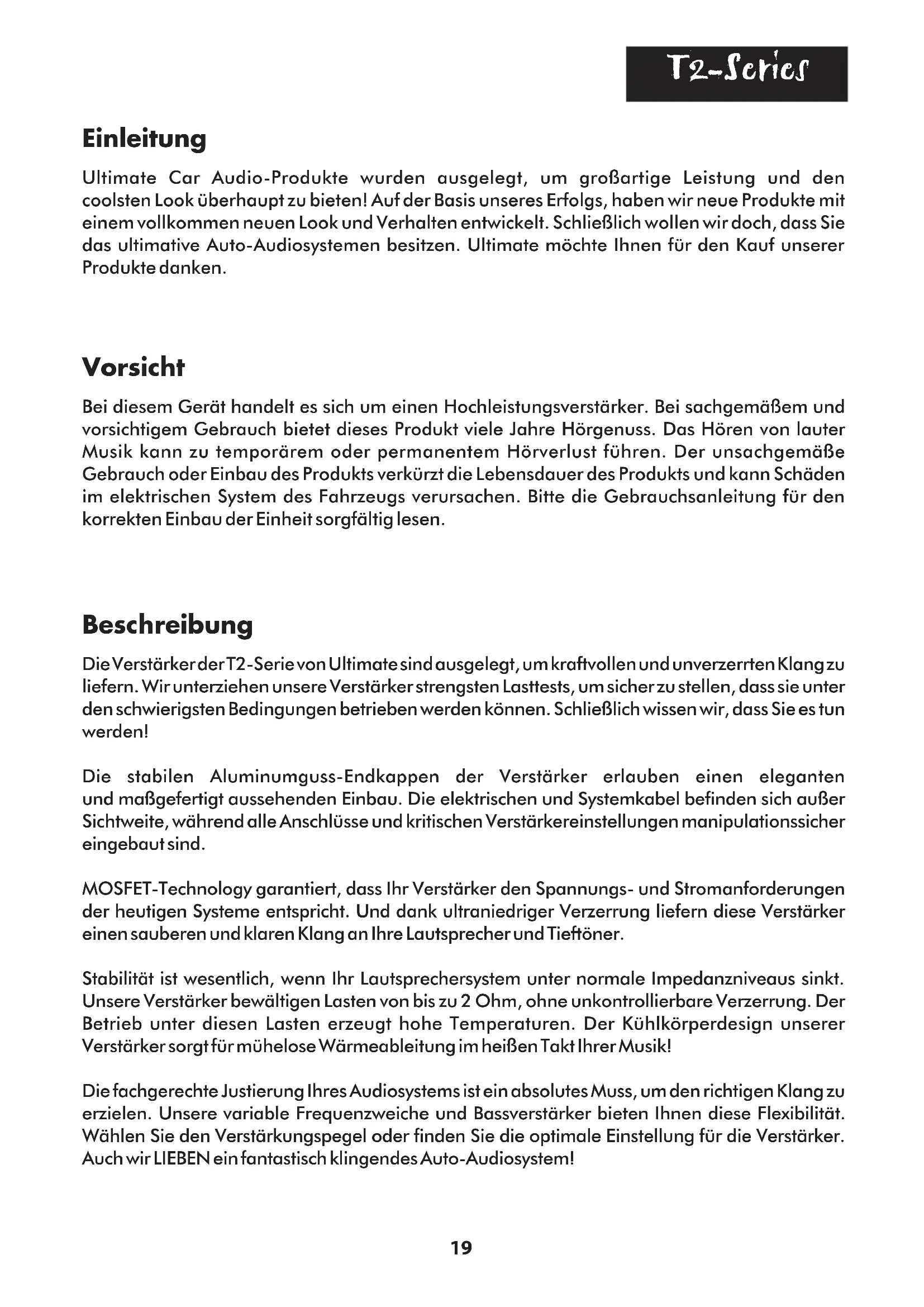- 4 ohms DAT: Relación señal/ruido: Respuesta de frecuencia: Impedancia de altavoz: Factor damping efectivo: Sensibilidad de entrada: Dimensiones: Fusible: T2-5450 55 x 4 + 170 x 1 85 x 4 + 240 x 1 140 x 4 + 300 x 1 320 x 4 + 410 x 1 0.05% 96db 10-110K hz 2 ohms 230 @ 4 ohms 300mV - 8V 9” x 20 5/8” x 2” 23cm x 52cm x 5cm 40A x 2 T2-1200 200 x 1 300 x 1 350 x 1 470 x 1 0.12% 97db 10-200K hz 2 ohms 180 @ 4 ohms 300mV - 8V 9” x 14 1/2” x 2” 23cm x 37cm x 5cm 30A Especificaciones T2-1400 400 x 1 550 x 1 800 x 1 1100 x 1 0.04% 97db 10-200K hz 2 ohms 190 @ 4 ohms 300mV - 8V 9” x 18 1/2” x 2” 23cm x 47cm x 5cm 30A x 219 Ultimate Car Audio-Produkte wurden ausgelegt, um großartige Leistung und den coolsten Look überhaupt zu bieten! Auf der Basis unseres Erfolgs, haben wir neue Produkte mit einem vollkommen neuen Look und Verhalten entwickelt. Schließlich wollen wir doch, dass Sie das ultimative Auto-Audiosystemen besitzen. Ultimate möchte Ihnen für den Kauf unserer Produkte danken. Einleitung Bei diesem Gerät handelt es sich um einen Hochleistungsverstärker. Bei sachgemäßem und vorsichtigem Gebrauch bietet dieses Produkt viele Jahre Hörgenuss. Das Hören von lauter Musik kann zu temporärem oder permanentem Hörverlust führen. Der unsachgemäße Gebrauch oder Einbau des Produkts verkürzt die Lebensdauer des Produkts und kann Schäden im elektrischen System des Fahrzeugs verursachen. Bitte die Gebrauchsanleitung für den korrekten Einbau der Einheit sorgfältig lesen. Vorsicht Die Verstärker der T2-Serie von Ultimate sind ausgelegt, um kraftvollen und unverzerrten Klang zu liefern. Wir unterziehen unsere Verstärker strengsten Lasttests, um sicher zu stellen, dass sie unter den schwierigsten Bedingungen betrieben werden können. Schließlich wissen wir, dass Sie es tun werden! Die stabilen Aluminumguss-Endkappen der Verstärker erlauben einen eleganten und maßgefertigt aussehenden Einbau. Die elektrischen und Systemkabel befinden sich außer Sichtweite, während alle Anschlüsse und kritischen Verstärkereinstellungen manipulationssicher eingebaut sind. MOSFET-Technology garantiert, dass Ihr Verstärker den Spannungs- und Stromanforderungen der heutigen Systeme entspricht. Und dank ultraniedriger Verzerrung liefern diese Verstärker einen sauberen und klaren Klang an Ihre Lautsprecher und Tieftöner. Stabilität ist wesentlich, wenn Ihr Lautsprechersystem unter normale Impedanzniveaus sinkt. Unsere Verstärker bewältigen Lasten von bis zu 2 Ohm, ohne unkontrollierbare Verzerrung. Der Betrieb unter diesen Lasten erzeugt hohe Temperaturen. Der Kühlkörperdesign unserer Verstärker sorgt für mühelose Wärmeableitung im heißen Takt Ihrer Musik! Die fachgerechte Justierung Ihres Audiosystems ist ein absolutes Muss, um den richtigen Klang zu erzielen. Unsere variable Frequenzweiche und Bassverstärker bieten Ihnen diese Flexibilität. Wählen Sie den Verstärkungspegel oder finden Sie die optimale Einstellung für die Verstärker. Auch wir LIEBEN ein fantastisch klingendes Auto-Audiosystem! Beschreibung T2-Series• AB-Schaltung