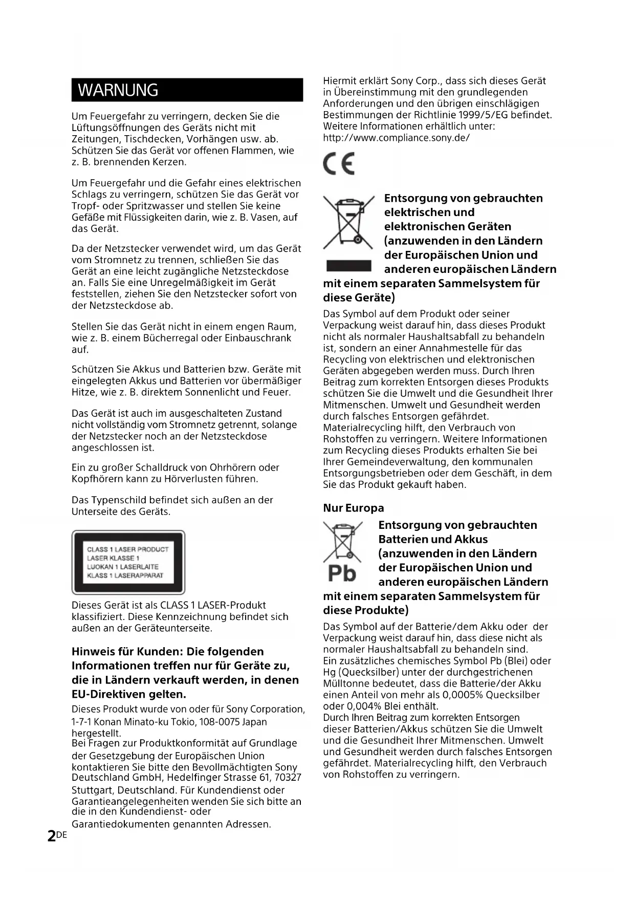Um Feuergefahr zu verringern, decken Sie die Lüftungsöffnungen des Geräts nicht mit Zeitungen, Tischdecken, Vorhängen usw. ab. Schützen Sie das Gerät vor offenen Flammen, wie z.B. brennenden Kerzen. Um Feuergefahr und die Gefahr eines elektrischen Schlags zu verringern, schützen Sie das Gerät vor Tropf- oder Spritzwasser und stellen Sie keine Gefäße mit Flüssigkeiten darin, wie z.B. Vasen, auf das Gerät. Da der Netzstecker verwendet wird, um das Gerät vom Stromnetz zu trennen, schließen Sie das Gerät an eine leicht zugängliche Netzsteckdose an. Falls Sie eine Unregelmäßigkeit im Gerät feststellen, ziehen Sie den Netzstecker sofort von der Netzsteckdose ab. Stellen Sie das Gerät nicht in einem engen Raum, wie z. B. einem Bücherregal oder Einbauschrank auf. Schützen Sie Akkus und Batterien bzw. Geräte mit eingelegten Akkus und Batterien vor übermäßiger Hitze, wie z.B. direktem Sonnenlicht und Feuer. Das Gerät ist auch im ausgeschalteten Zustand nicht vollständig vom Stromnetz getrennt, solange der Netzstecker noch an der Netzsteckdose angeschlossen ist. Ein zu großer Schalldruck von Ohrhörern oder Kopfhörern kann zu Hörverlusten führen. Das Typenschild befindet sich außen an der Unterseite des Geräts. Dieses Gerät ist als CLASS 1 LASER-Produkt klassifiziert. Diese Kennzeichnung befindet sich außen an der Geräteunterseite. Hinweis für Kunden: Die folgenden Informationen treffen nur für Geräte zu, die in Ländern verkauft werden, in denen EU-Direktiven gelten. Dieses Produkt wurde von oder für Sony Corporation, 1-7-1 Konan Minato-ku Tokio, 108-0075 Japan hergestellt. Bei Fragen zur Produktkonformität auf Grundlage der Gesetzgebung der Europäischen Union kontaktieren Sie bitte den Bevollmächtigten Sony Deutschland GmbH, Hedelfinger Strasse 61, 70327 Stuttgart, Deutschland. Für Kundendienst oder Garantieangelegenheiten wenden Sie sich bitte an die in den Kundendienst- oder Garantiedokumenten genannten Adressen. Hiermit erklärt Sony Corp., dass sich dieses Gerät in Übereinstimmung mit den grundlegenden Anforderungen und den übrigen einschlägigen Bestimmungen der Richtlinie 1999/5/EG befindet. Weitere Informationen erhältlich unter: http://www.compliance.sony.de/ Entsorgung von gebrauchten elektrischen und elektronischen Geräten (anzuwenden in den Ländern der Europäischen Union und anderen europäischen Ländern mit einem separaten Sammelsystem für diese Geräte) Das Symbol auf dem Produkt oder seiner Verpackung weist darauf hin, dass dieses Produkt nicht als normaler Haushaltsabfall zu behandeln ist, sondern an einer Annahmestelle für das Recycling von elektrischen und elektronischen Geräten abgegeben werden muss. Durch Ihren Beitrag zum korrekten Entsorgen dieses Produkts schützen Sie die Umwelt und die Gesundheit Ihrer Mitmenschen. Umwelt und Gesundheit werden durch falsches Entsorgen gefährdet. Materialrecycling hilft, den Verbrauch von Rohstoffen zu verringern. Weitere Informationen zum Recycling dieses Produkts erhalten Sie bei Ihrer Gemeindeverwaltung, den kommunalen Entsorgungsbetrieben oder dem Geschäft, in dem Sie das Produkt gekauft haben. Nur Europa Entsorgung von gebrauchten Batterien und Akkus (anzuwenden in den Ländern der Europäischen Union und anderen europäischen Ländern mit einem separaten Sammelsystem für diese Produkte) Das Symbol auf der Batterie/dem Akku oder der Verpackung weist darauf hin, dass diese nicht als normaler Haushaltsabfall zu behandeln sind. Ein zusätzliches chemisches Symbol Pb (Blei) oder Hg (Quecksilber) unter der durchgestrichenen Mülltonne bedeutet, dass die Batterie/der Akku einen Anteil von mehr als 0,0005% Quecksilber oder 0,004% Blei enthält. Durch Ihren Beitrag zum korrekten Entsorgen dieser Batterien/Akkus schützen Sie die Umwelt und die Gesundheit Ihrer Mitmenschen. Umwelt und Gesundheit werden durch falsches Entsorgen gefährdet. Materialrecycling hilft, den Verbrauch von Rohstoffen zu verringern. WARNUNG3