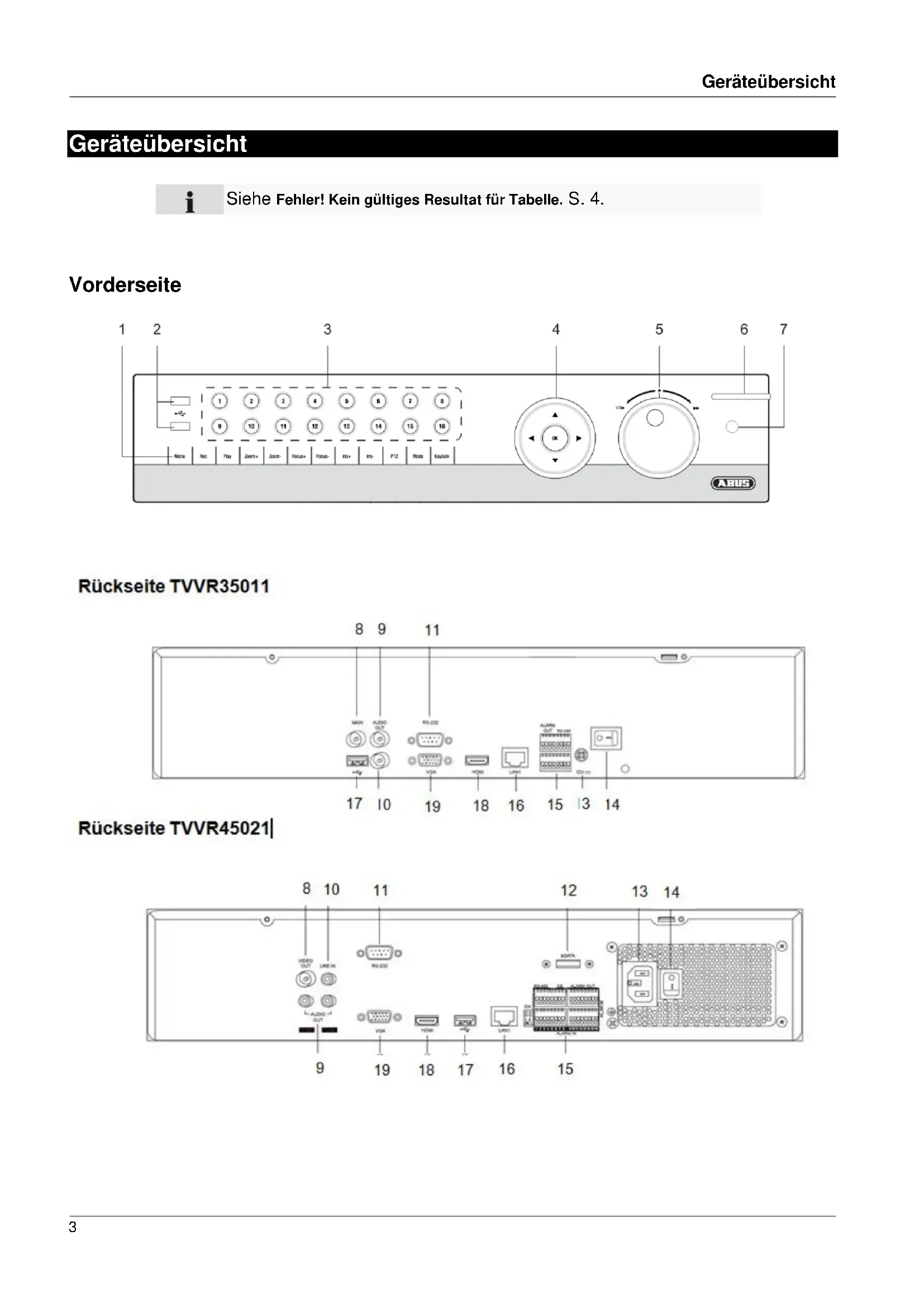 Laden Sie die Anleitung für Ihr Videorekorder kostenlos im PDF-Format! Finden Sie Ihr Handbuch TVVR45021 - ABUS und nehmen Sie Ihr elektronisches Gerät wieder in die Hand. Auf dieser Seite sind alle Dokumente veröffentlicht, die für die Verwendung Ihres Geräts notwendig sind. TVVR45021 von der Marke ABUS.