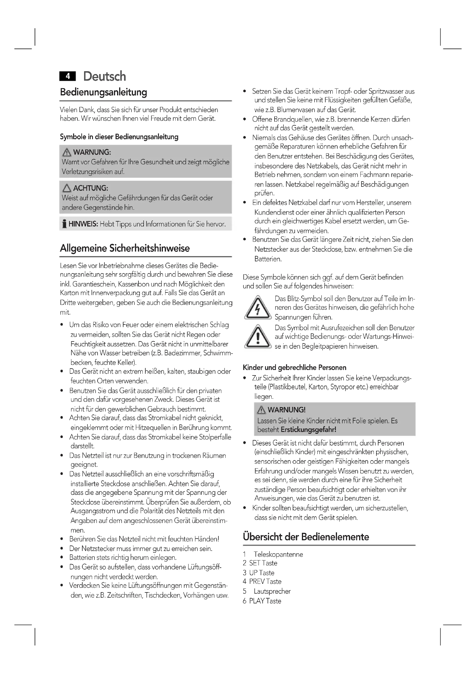 - Kindersolltenbeaufsichtigtwerden,umsicherzustellen, dass sie nicht mit dem Gerät spielen. Übersicht der Bedienelemente 1 Teleskopantenne 2 SET Taste 3 UP Taste 4 PREV Taste 5 Lautsprecher 6 PLAY TasteDeutsch