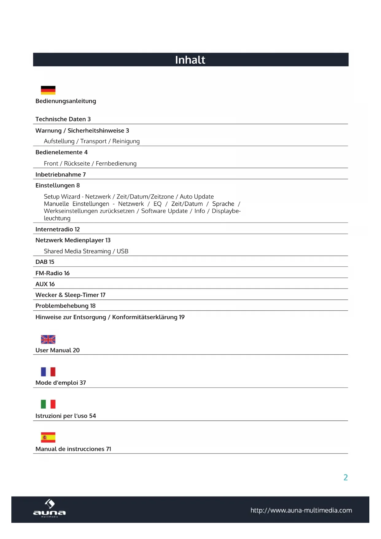 Inhalt Bedienungsanleitung Technische Daten 3 Warnung / Sicherheitshinweise 3 Aufstellung / Transport / Reinigung Bedienelemente 4 Front / Rückseite / Fernbedienung Inbetriebnahme 7 Einstellungen 8 Setup Wizard - Netzwerk / Zeit/Datum/Zeitzone / Auto Update Manuelle Einstellungen - Netzwerk / EQ / Zeit/Datum / Sprache / Werkseinstellungen zurücksetzen / Software Update / Info / Displaybe- leuchtung Internetradio 12 Netzwerk Medienplayer 13 Shared Media Streaming / USB DAB 15 FM-Radio 16 AUX 16 Wecker & Sleep-Timer 17 Problembehebung 18 Hinweise zur Entsorgung / Konformitätserklärung 19 User Manual 20 Mode d‘emploi 37 Istruzioni per l‘uso 54 Manual de instrucciones 713 Sehr geehrter Kunde, zunächst möchten wir Ihnen zum Erwerb Ihres Gerätes gratulieren. Bitte lesen Sie die folgenden Anschluss- und Anwendungshinweise sorgfältig durch und befolgen Sie diese um mögli- chen technischen Schäden vorzubeugen. Technische Daten Artikelnummer 10028153, 10028154 Beschreibung Internet Radio / Netzwerk Audio Player mit integriertem 2.1-System Display 2.4“, 320 x 240, TFT Unterstützte Netzwerke IEEE 802.11b/g/n; 10/100 Ethernet (LAN) Unterstützte Verschlüsselung WEP, WPA, WPA2 (PSK), WPS Streaming UPnP, DLNA Untertützte Dateiformate MP3, WMA, WAV, AAC, FLAC DAB / DAB+ Band III (170 – 240 MHz) FM 87.0 – 108.0 MHz + RDS USB 2.0 Netz-Adapter / Akku 12V / 2500mA; 220V ~50Hz Leistungsaufnahme im Standby-Betrieb <1W Anschlüsse 3,5mm-Kopfhörer USB 3.5mm AUX-Eingang Stereo 3,5mm Line-Out LAN (RJ45) DC IN (Netzteilanschluss) Maße 155 x 155 x 161mm Gewicht 2,2 kg Warnung Zur Reduzierung der Gefahr von Brand, elektrischem Schlag und Beschädigung: