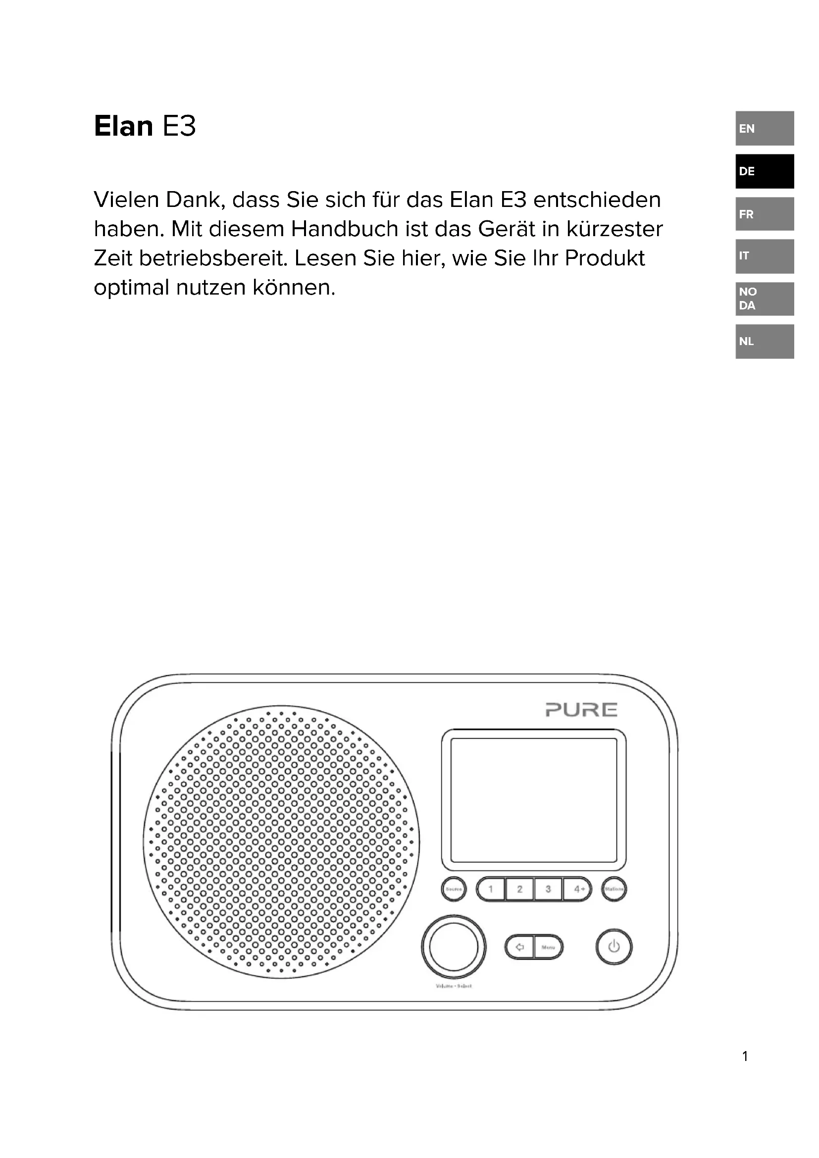 Radio Digital (DAB/DAB+) und UKW-Radio. Frequenzen Digital Band III 174–240 MHz, UKW 87,5-108 MHz (mit RDS). Display 2,8", 320 x 240, TFT-Farbdisplay. Lautsprecher 3"-Breitbänder, 2-W-Ausgang Eingänge 6-VDC-Netzteilanschluss (Adapter im Lieferumfang enthalten) Ausgänge: 3,5-mm-Buchse für Stereokopörer Netzteil 6 VDC, 500 mA oder 4 AA-Batterien Abmessungen 200 mm breit x 53 mm tief x 115 mm hoch Gewicht 420 g Garantie Umfassende dreijährige Garantie Zulassungen CE-Zeichen. Erfüllt die EMV- und Niederspannungsrichtlinien (2014/30/EU und 2014/35/EU) sowie ETSI EN 300 401. Funkgeräterichtlinie (RED), 2014/53 / EU-konform nach dem 12. Juni 2017. Technische Daten DE18 Garantieerklärung Pure International Limited garantiert dem Endverbraucher, dass dieses Gerät frei von Material- und Herstellungsfehlern im Rahmen des normalen Gebrauchs ist. Diese Garantie gilt für einen Zeitraum von drei Jahren ab Kaufdatum. Die Garantie umfasst Störungen aufgrund von Herstellungs- oder Ausführungsfehlern. Sie gilt jedoch nicht für Unfallschäden jeglicher Art und Schäden, die auf Verschleiß, Fahrlässigkeit oder von uns nicht autorisierte Anpassungen, Änderungen oder Reparaturen zurückzuführen sind. Falls ein Problem mit Ihrem Gerät auftritt, wenden Sie sich bitte an Ihren Händler oder an den Pure Support unter http://support.pure.com. Haftungsausschluss Pure International Limited gibt keine Erklärungen oder Garantien bezüglich des Inhalts dieses Dokuments und schließt insbesondere implizierte Zusicherungen der Marktgängigkeit und der Eignung für einen bestimmten Zweck aus. Weiterhin behält sich Pure International Limited das Recht vor, diese Veröentlichung zu überarbeiten und von Zeit zu Zeit Änderungen vorzunehmen, ohne dass Pure International Limited dazu verpflichtet ist, Personen oder Organisationen über solche Überarbeitungen oder Änderungen zu benachrichtigen. Warenzeichen Elan E3, Pure und das Pure-Logo sind Marken oder eingetragene Warenzeichen von Pure International Limited. Urheberrecht Copyright © 2017 Pure International Limited. Alle Rechte vorbehalten. Ohne ausdrückliche schriftliche Genehmigung durch Pure International Limited ist jede Vervielfältigung dieser Publikation, auch auszugsweise, verboten. Ebenso ist ihre Verbreitung, Übermittlung, Abschrift, Speicherung in einem Datenverarbeitungssystem oder die Übersetzung in eine natürliche Sprache oder Programmiersprache in jeglicher Form, sei sie elektronisch, mechanisch, magnetisch, manuell oder anderweitig, und jegliche Oenlegung gegenüber Dritten verboten. Korrekte Entsorgung dieses Produkts Diese Kennzeichnung weist darauf hin, dass dieses Produkt innerhalb der EU nicht zusammen mit anderen Haushaltsabfällen entsorgt werden darf. Sorgen Sie für ein verantwortungsvolles Recycling, um Gesundheits- oder Umweltschäden durch unkontrollierte Abfallentsorgung zu vermeiden. Sie ermöglichen damit gleichzeitig eine nachhaltige Wiederverwendung von Ressourcen. Wenn Sie Ihr gebrauchtes Gerät zurückgeben wollen, nutzen Sie das Rückgabe- und Sammelsystem oder wenden Sie sich an den Händler, bei dem Sie das Gerät gekauft hatten. Diese Stellen können das Produkt einem umweltgerechten Recycling zuführen.1 Nous vous remercions d’avoir choisi Elan E3. Ce manuel vous permettra de commencer à utiliser votre produit en un tour de main vous explique comment en profiter au maximum. Elan E3