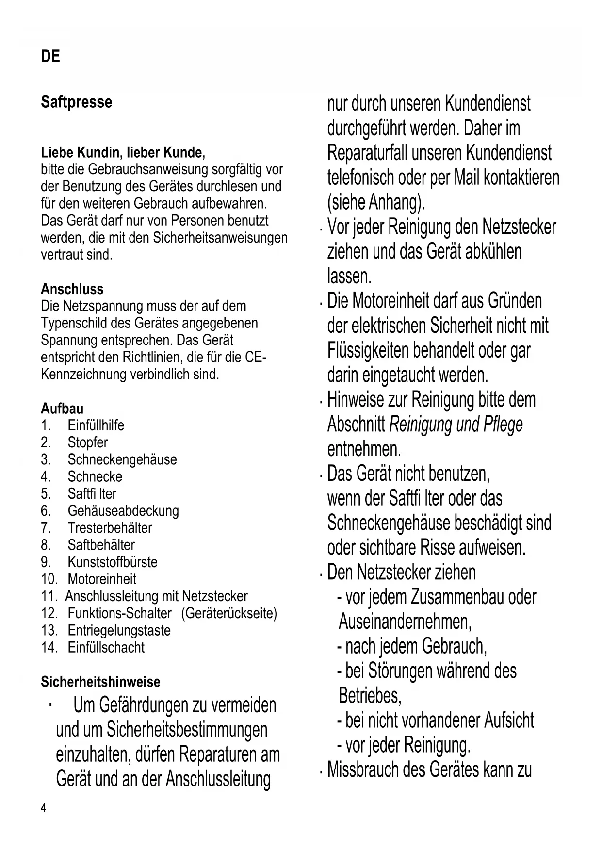Saftpresse Liebe Kundin, lieber Kunde, bitte die Gebrauchsanweisung sorgfältig vor der Benutzung des Gerätes durchlesen und für den weiteren Gebrauch aufbewahren. Das Gerät darf nur von Personen benutzt werden, die mit den Sicherheitsanweisungen vertraut sind. Anschluss Die Netzspannung muss der auf dem Typenschild des Gerätes angegebenen Spannung entsprechen. Das Gerät entspricht den Richtlinien, die für die CE- Kennzeichnung verbindlich sind. Aufbau