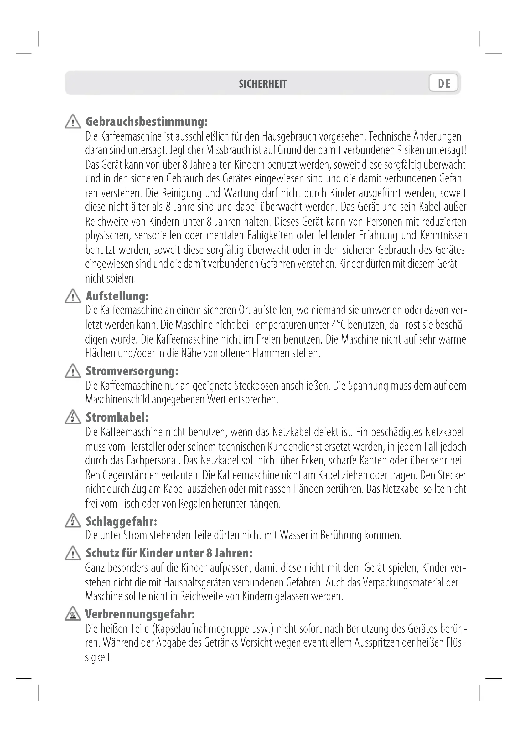 - Chaudière instantanée en aluminium avec sonde de températureDE Gebrauchsbestimmung: Die Kaffeemaschine ist ausschließlich für den Hausgebrauch vorgesehen. Technische Änderungen daran sind untersagt. Jeglicher Missbrauch ist auf Grund der damit verbundenen Risiken untersagt! Das Gerät kann von über 8 Jahre alten Kindern benutzt werden, soweit diese sorgfältig überwacht und in den sicheren Gebrauch des Gerätes eingewiesen sind und die damit verbundenen Gefah- ren verstehen. Die Reinigung und Wartung darf nicht durch Kinder ausgeführt werden, soweit diese nicht älter als 8 Jahre sind und dabei überwacht werden. Das Gerät und sein Kabel außer Reichweite von Kindern unter 8 Jahren halten. Dieses Gerät kann von Personen mit reduzierten physischen, sensoriellen oder mentalen Fähigkeiten oder fehlender Erfahrung und Kenntnissen benutzt werden, soweit diese sorgfältig überwacht oder in den sicheren Gebrauch des Gerätes eingewiesen sind und die damit verbundenen Gefahren verstehen. Kinder dürfen mit diesem Gerät nicht spielen. Aufstellung: Die Kaffeemaschine an einem sicheren Ort aufstellen, wo niemand sie umwerfen oder davon ver- letzt werden kann. Die Maschine nicht bei Temperaturen unter 4°C benutzen, da Frost sie beschä- digen würde. Die Kaffeemaschine nicht im Freien benutzen. Die Maschine nicht auf sehr warme Flächen und/oder in die Nähe von offenen Flammen stellen. Stromversorgung: Die Kaffeemaschine nur an geeignete Steckdosen anschließen. Die Spannung muss dem auf dem Maschinenschild angegebenen Wert entsprechen. Stromkabel: Die Kaffeemaschine nicht benutzen, wenn das Netzkabel defekt ist. Ein beschädigtes Netzkabel muss vom Hersteller oder seinem technischen Kundendienst ersetzt werden, in jedem Fall jedoch durch das Fachpersonal. Das Netzkabel soll nicht über Ecken, scharfe Kanten oder über sehr hei- ßen Gegenständen verlaufen. Die Kaffeemaschine nicht am Kabel ziehen oder tragen. Den Stecker nicht durch Zug am Kabel ausziehen oder mit nassen Händen berühren. Das Netzkabel sollte nicht frei vom Tisch oder von Regalen herunter hängen. Schlaggefahr: Die unter Strom stehenden Teile dürfen nicht mit Wasser in Berührung kommen. Schutz für Kinder unter 8 Jahren: Ganz besonders auf die Kinder aufpassen, damit diese nicht mit dem Gerät spielen, Kinder ver- stehen nicht die mit Haushaltsgeräten verbundenen Gefahren. Auch das Verpackungsmaterial der Maschine sollte nicht in Reichweite von Kindern gelassen werden. Verbrennungsgefahr: Die heißen Teile (Kapselaufnahmegruppe usw.) nicht sofort nach Benutzung des Gerätes berüh- ren. Während der Abgabe des Getränks Vorsicht wegen eventuellem Ausspritzen der heißen Flüs- sigkeit. SICHERHEITITDE Reinigung: Vor Reinigung der Maschine muss unbedingt der Stecker aus der Steckdose abgezogen und ab- gewartet werden, dass sich die Maschine abkühlt. Die Kaffeemaschine nicht in Wasser tauchen! Es ist streng untersagt, Einschritte im Maschineninneren durchzuführen. Das Wasser im Behälter nach einigen Tagen Nichtbenutzung erneuern. Aufbewahrung der Maschine: Wird die Maschine für längere Zeit nicht benutzt, den Stecker aus der Dose ziehen und die Ma- schine an einem trockenen, für Kinder unzugänglichen und vor Staub und Schmutz geschützten Ort aufbewahren. Reparaturen / Wartung: Bei Havarien, Defekten oder Verdacht auf Beschädigung nach einem Fall, sofort den Stecker aus der Dose ziehen. Eine defekte Maschine nicht in Betrieb setzen. Allein die autorisierten Kunden- dienstzentren dürfen Einschritte und Reparaturen ausführen. Bei Einschritten, die nicht fachge- recht ausgeführt wurden, wird bei eventueller Beschädigung jegliche Haftung hinfällig. Wasserbehälter: Nur stilles, nicht sprudelndes Trinkwasser in den Behälter füllen. Die Maschine nicht in Betrieb setzen, wenn nicht genügend Wasser im Behälter vorhanden ist. Kapselraum: In die Kapselaufnahme können nur kompatible Kapseln eingeführt werden, weder Finger noch jeglicher anderer Gegenstand. Die Kapseln können nur einmal benutzt werden. Entsorgung der Maschine nach Beendigung ihrer Lebensdauer: INFORMATIONEN FÜR DEN BENUTZER: im Sinne der EG-Richtlinien 2002/95, 2002/96 und 2003/108 (und darauf folgenden Änderungen) über die Reduzierung der Anwendung von Ge- fahrsubstanzen in elektrischen und elektronischen Geräten, als auch über die Entsorgung des elektrischen und elektronischen Gerätemülls. Das Symbol des durchgestrichenen Containers auf dem Gerät und auf der Verpackung laut Vorschriften der europäischen Richtlinie 2002/96 be- deutet, dass das Produkt nach Ablauf seiner Benutzung als Sondermüll zu entsorgen ist. Das Gerät muss in ein spezielles Sammelzentrum gebracht werden. Für weitere Informationen über die korrekte Entsorgung können sich die Benutzer an die entsprechende, öffentliche Stelle oder aber an die Vertreiber der Neugeräte wenden. SICHERHEITDE