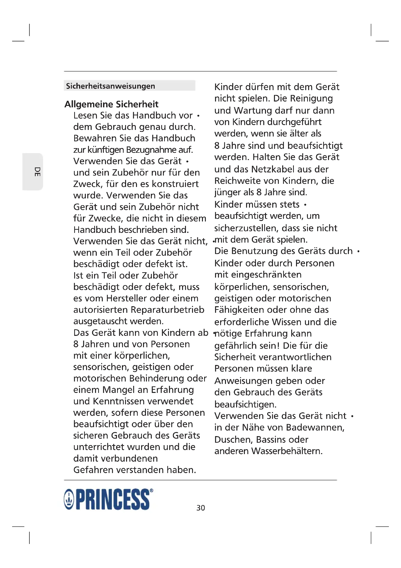 Sicherheitsanweisungen Allgemeine Sicherheit Lesen Sie das Handbuch vor • dem Gebrauch genau durch. Bewahren Sie das Handbuch zur künftigen Bezugnahme auf. Verwenden Sie das Gerät • und sein Zubehör nur für den Zweck, für den es konstruiert wurde. Verwenden Sie das Gerät und sein Zubehör nicht für Zwecke, die nicht in diesem Handbuch beschrieben sind. Verwenden Sie das Gerät nicht, • wenn ein Teil oder Zubehör beschädigt oder defekt ist. Ist ein Teil oder Zubehör beschädigt oder defekt, muss es vom Hersteller oder einem autorisierten Reparaturbetrieb ausgetauscht werden. Das Gerät kann von Kindern ab • 8 Jahren und von Personen mit einer körperlichen, sensorischen, geistigen oder motorischen Behinderung oder einem Mangel an Erfahrung und Kenntnissen verwendet werden, sofern diese Personen beaufsichtigt oder über den sicheren Gebrauch des Geräts unterrichtet wurden und die damit verbundenen Gefahren verstanden haben. Kinder dürfen mit dem Gerät nicht spielen. Die Reinigung und Wartung darf nur dann von Kindern durchgeführt werden, wenn sie älter als 8 Jahre sind und beaufsichtigt werden. Halten Sie das Gerät und das Netzkabel aus der Reichweite von Kindern, die jünger als 8 Jahre sind. Kinder müssen stets • beaufsichtigt werden, um sicherzustellen, dass sie nicht mit dem Gerät spielen. Die Benutzung des Geräts durch • Kinder oder durch Personen mit eingeschränkten körperlichen, sensorischen, geistigen oder motorischen Fähigkeiten oder ohne das erforderliche Wissen und die nötige Erfahrung kann gefährlich sein! Die für die Sicherheit verantwortlichen Personen müssen klare Anweisungen geben oder den Gebrauch des Geräts beaufsichtigen. Verwenden Sie das Gerät nicht • in der Nähe von Badewannen, Duschen, Bassins oder anderen Wasserbehältern.31