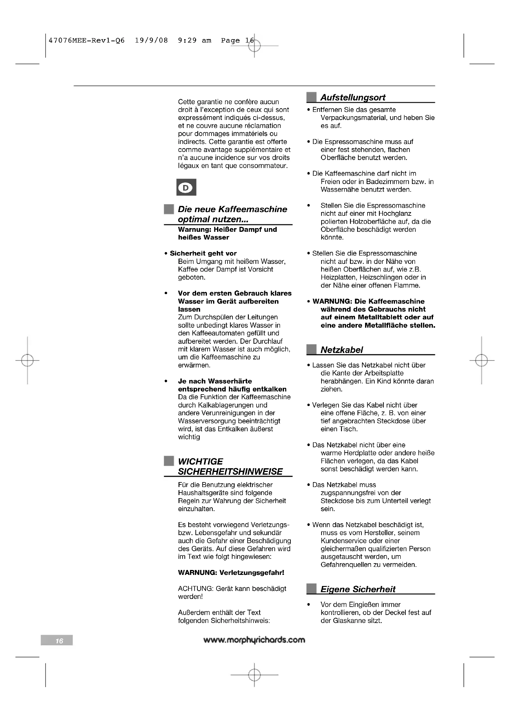47076MEE-Rev1-Q6 19/9/08 9:29 am Page 16• Heißen Kaffee immer langsam und vorsichtig aus der Glaskanne gießen.