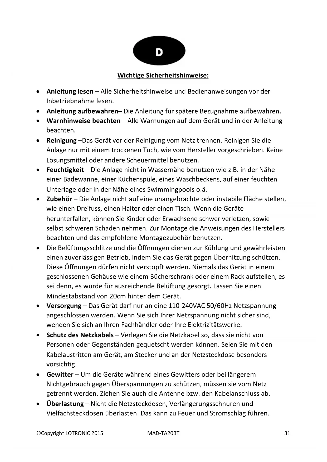 - Überlastung – Nicht die Netzsteckdosen, Verlängerungsschnuren und Vielfachsteckdosen überlasten. Das kann zu Feuer und Stromschlag führen.©Copyright LOTRONIC 2015 MAD-TA20BT 32