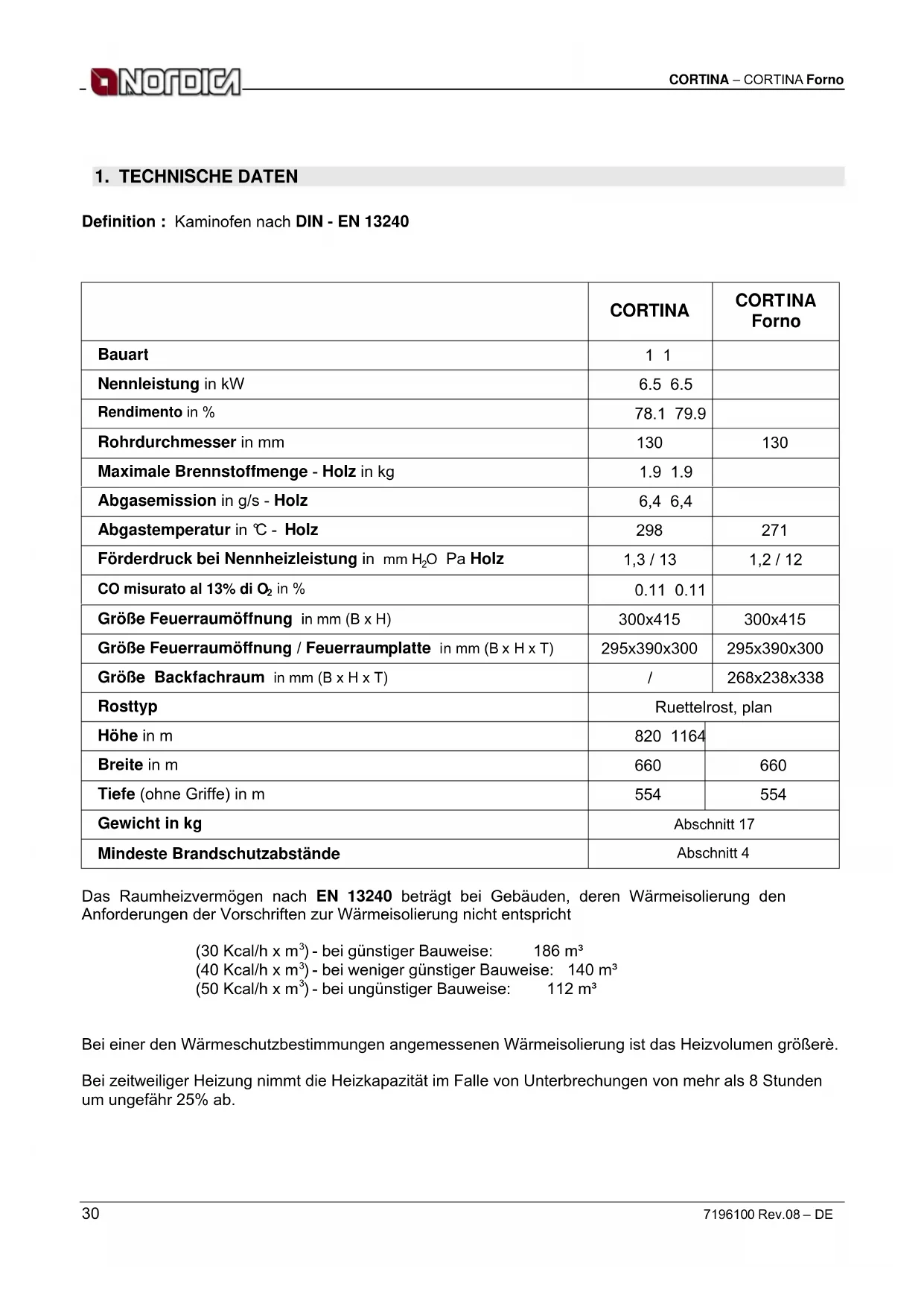 Bei einer den Wärmeschutzbestimmungen angemessenen Wärmeisolierung ist das Heizvolumen größerè. Bei zeitweiliger Heizung nimmt die Heizkapazität im Falle von Unterbrechungen von mehr als 8 Stunden um ungefähr 25% ab. CORTINA CORT INA Forno Bauart