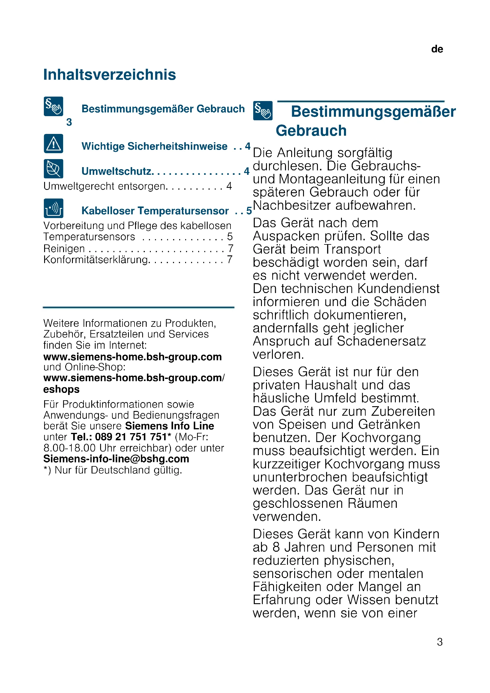 - Konformitätserklärung Produktinfo Weitere Informationen zu Produkten, Zubehör, Ersatzteilen und Services finden Sie im Internet: www.siemens-home.bsh-group.com und Online-Shop: www.siemens-home.bsh-group.com/ eshops Für Produktinformationen sowie Anwendungs- und Bedienungsfragen berät Sie unsere Siemens Info Line unter Tel.: 089 21 751 751* (Mo-Fr: 8.00-18.00 Uhr erreichbar) oder unter Siemens-info-line@bshg.com *) Nur für Deutschland gültig. 8 Bestimmungsgemäßer Gebrauch Bestimmungsgemäßer Gebrauch Die Anleitung sorgfältig durchlesen. Die Gebrauchs- und Montageanleitung für einen späteren Gebrauch oder für Nachbesitzer aufbewahren. Das Gerät nach dem Auspacken prüfen. Sollte das Gerät beim Transport beschädigt worden sein, darf es nicht verwendet werden. Den technischen Kundendienst informieren und die Schäden schriftlich dokumentieren, andernfalls geht jeglicher Anspruch auf Schadenersatz verloren. Dieses Gerät ist nur für den privaten Haushalt und das häusliche Umfeld bestimmt. Das Gerät nur zum Zubereiten von Speisen und Getränken benutzen. Der Kochvorgang muss beaufsichtigt werden. Ein kurzzeitiger Kochvorgang muss ununterbrochen beaufsichtigt werden. Das Gerät nur in geschlossenen Räumen verwenden. Dieses Gerät kann von Kindern ab 8 Jahren und Personen mit reduzierten physischen, sensorischen oder mentalen Fähigkeiten oder Mangel an Erfahrung oder Wissen benutzt werden, wenn sie von einerde p. 7