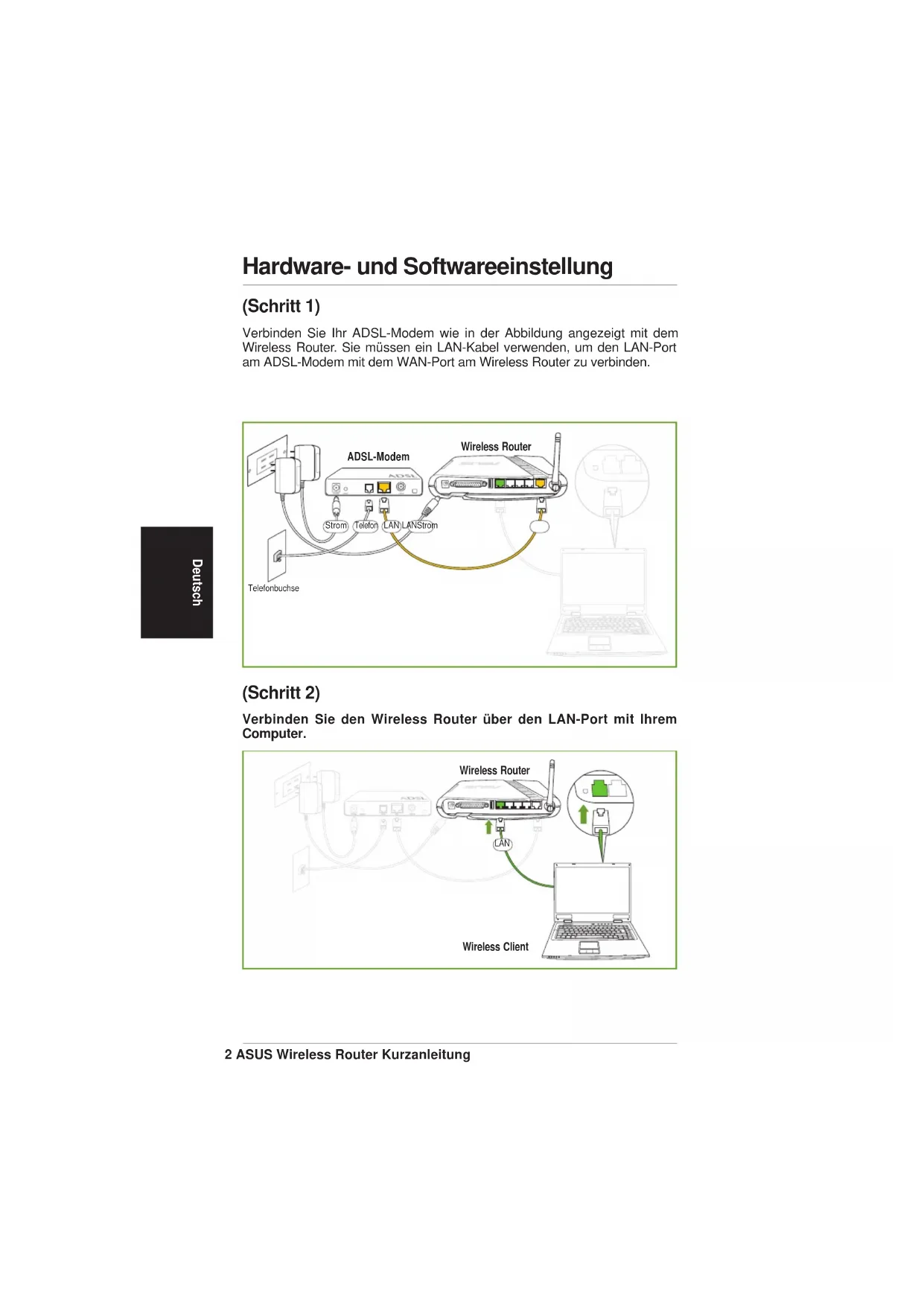 (Etape 3) Activez trois contrôles ActiveX et plug- ins. Par défaut ces éléments sont désactivés et empêcheront la webcam du routeur de fonctionner correctement. Paramétrage de la Webcam (DefaultEnglish Français Routeur sans fil ASUS: guide de démarrage rapide 13 (Etape 4) Par défaut, trois éléments sont déjà activés. Activez-les s’ils ont été modifiés. (Etape 5) Cliquez sur Oui pour changer les paramètres de sécurité. Paramétrage de la Webcam (suite)Français 14 Routeur sans fil ASUS: guide de démarrage rapide L’interface web du routeur sans fil WL-500b/g vous aidera à paramétrer la partie logicielle de la webcam. (Etape 4) Cliquez sur Add to Bookmark tpour sauvegarder un lien vers cette page. (Etape 2) Choisissez Web Camera dans lemenu USB Application. (Etape 3) Sur cette page réglez des paramètres tels que la taille de l’image. Cliquez sur Preview pour avoir une idée de ce que cela donnera. (Etape 5) Réglez Remote Monitor si nécessaire. Cliquez sur Finish une fois fini. Paramétrage logiciel de la webcam (Etape 1) Saisissez l’une des adresses suivantes dans votre navigateur Internet: http://my.WL500b ou http://my.WL500g (en fonction des modèles) http://my.router ou http://192.168.1.1Deutsch Deutsch WL500g / WL500g Deluxe Wireless Router (Für 802.11g/b Wireless Clients) WL500b Wireless Router (Für 802.11b Wireless Clients) KurzanleitungDeutsch 2 ASUS Wireless Router Kurzanleitung (Schritt 1) Verbinden Sie Ihr ADSL-Modem wie in der Abbildung angezeigt mit dem Wireless Router. Sie müssen ein LAN-Kabel verwenden, um den LAN-Port am ADSL-Modem mit dem WAN-Port am Wireless Router zu verbinden. (Schritt 2) Verbinden Sie den Wireless Router über den LAN-Port mit Ihrem Computer. ADSL-Modem Wireless Router Telefonbuchse Strom Telefon LAN LANStrom Wireless Client Wireless Router LAN Hardware- und SoftwareeinstellungDeutsch Deutsch ASUS Wireless Router Kurzanleitung 3 (Schritt 5) Die Startseite zeigt Links zur Konfiguration der Hauptfunktionen des Wireless Home Gateway an. Klicken Sie für eine schnelle Einstellung auf Next (Weiter). (Schritt 3) Geben Sie eine der folgenden Adressen in Ihren Webbrowser ein: WL500g [http://my.router] oder [http://my.WL500g] oder [http://192.168.1.1] WL500g Deluxe [http://my.router] oder [http://my.WL500g.Deluxe] oder [http://192.168.1.1] (Schritt 4) Anmelden mit Werksvorgabe: Benutzer: admin Passwort: admin WL500g WL500g Deluxe (Schritt 6) Wählen Sie aus dem Pull-Down-Menü Ihre Zeitzone oder die nächste Region aus. Klicken Sie zum Fortfahren auf Next (Weiter). Hardware- und Softwareeinstellung (Fortsetzung)Deutsch 4 ASUS Wireless Router Kurzanleitung (Schritt 7) Wählen Sie Ihren Verbindungstyp. (“ADSL” verwendet ein standardmäßiges Telefonkabel. “Kabel” verwendet ein schweres, rundes TV-Kabel.) Klicken Sie zum Fortfahren auf Next (Weiter). (Schritt 8) Geben Sie Ihren Benutzernamen und Ihr Kennwort ein, um eine Verbindung mit Ihrem ISP herzustellen. Klicken Sie zum Fortfahren auf Next (Weiter). (Schritt 11) Geben Sie die SSID ein und nehmen Sie die WEP-Einstellungen vor, wenn Sie die Sicherheit Ihres drahtlosen Netzwerks verstärken möchten. Klicken Sie zum Fortfahren auf Finish (Fertig stellen). (Schritt 10) Normalerweise sollten Sie die Optionen “IP automatisch beziehen” und “DNS- Server automatisch beziehen” aktivieren. Wenn Sie die beiden Optionen nicht aktivieren, müssen Sie die Informationen von Ihrem ISP eingeben. Klicken Sie zum Fortfahren auf Next (Weiter). (Schritt 9) Füllen Sie, wenn notwendig, die Felder Host-Name und MAC-Adresse für Ihren ISP aus. Geben Sie den Servernamen oder die Server-IP-Adresse des Heart- Beat Servers ein, wenn Sie eine Verbindung mit BigPond herstellen (nur für Telstar BigPond Cable-Benutzer). Klicken Sie zum Fortfahren auf Next (Weiter). (Schritt 12) Klicken Sie auf Speichern & Neu starten, um die Einstellungen in dem Wireless Router zu speichern und die neuen Einstellungen wirksam zu machen. Klicken Sie zum Fortfahren auf Finish (Fertig stellen). Hardware- und Softwareeinstellung (Fortsetzung)Deutsch Deutsch ASUS Wireless Router Kurzanleitung 5 Druckerinstallations-Assistent Sie sollten Ihren Drucker auf Ihrem Computer installieren, um die Druckereinstellung auf dem Wireless Router zu vereinfachen. Wenn Sie den “Druckereinstellungs-Assistent” starten, ohne Ihren Druckertreiber installiert zu haben, werden Sie an den “Druckerinstallations- Assistent” weitergeleitet. Verbinden Sie Ihren Drucker über den parallelen Anschluss oder USB-Anschluss (wenn verfügbar) mit Ihrem Computer. (Schritt 1) Starten Sie den “Add Printer Wizard (Druckerinstallations-Assistent)” unter Start | Drucker und Faxgeräte| Drucker hinzufügen. (Schritt 2) Wählen Sie “Local printer attached to this computer (Lokaler Drucker, der an dem Computer angeschlossen ist)”. (Schritt 3) Wählen Sie den parallelen Anschluss oder USB-Anschluss, mit dem Ihr Drucker verbunden ist. Drahtlos drucken (ausgewählte Modelle)Deutsch 6 ASUS Wireless Router Kurzanleitung (Schritt 4) Suchen Sie Ihren Druckerhersteller und Ihr Druckermodell. Klicken Sie auf Have Disk (Diskette), wenn Sie Ihren Drucker nicht in der Liste finden konnten. Verwenden Sie den Ihrem Drucker beigefügten Treiber. (Schritt 5) Klicken Sie auf Next (Weiter), um diesen Drucker als Standarddrucker einzustellen. (Schritt 6) Sie können eine Testseite drucken. (Schritt 7) Klicken Sie zum Beenden des Assistenten auf Finish (Fertig stellen). Hinweis: Sie können auch Druckertreiber über die von Ihrem Druckerhersteller gelieferte Disc installieren. Dennoch müssen Sie das Drucker- Utility von dem Druckerhersteller (wenn installiert) deinstallieren, wenn Sie die Wireless LAN Druckerserver-Funktion verwenden möchten. Hinweis: WL-500g unterstützt nur einen parallelen Drucker. WL-500g Deluxe unterstützt nur einen USB-Drucker. Drahtlos drucken (Fortsetzung)Deutsch Deutsch ASUS Wireless Router Kurzanleitung 7 Stellen Sie sicher, 