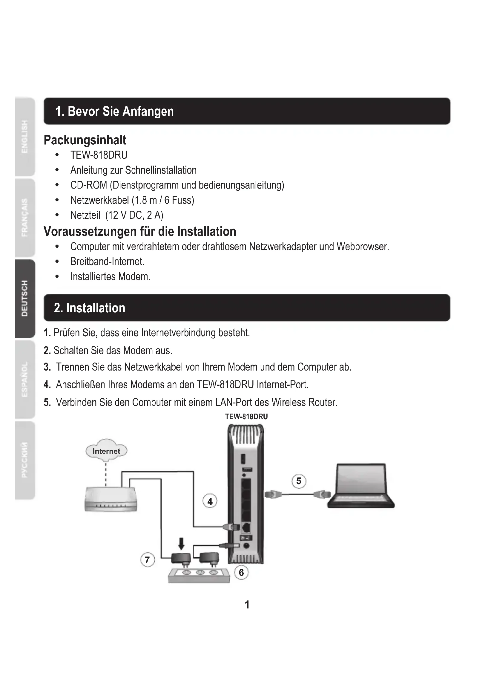 TEW-818DRU Anleitung zur Schnellinstallation (1) AC1900 Dual Band Wireless Router1 Voraussetzungen für die Installation Packungsinhalt TEW-818DRU Anleitung zur Schnellinstallation CD-ROM (Dienstprogramm und bedienungsanleitung) Netzwerkkabel (1.8 m / 6 Fuss) Netzteil (12 V DC, 2 A) Computer mit verdrahtetem oder drahtlosem Netzwerkadapter und Webbrowser. Breitband-Internet. Installiertes Modem.