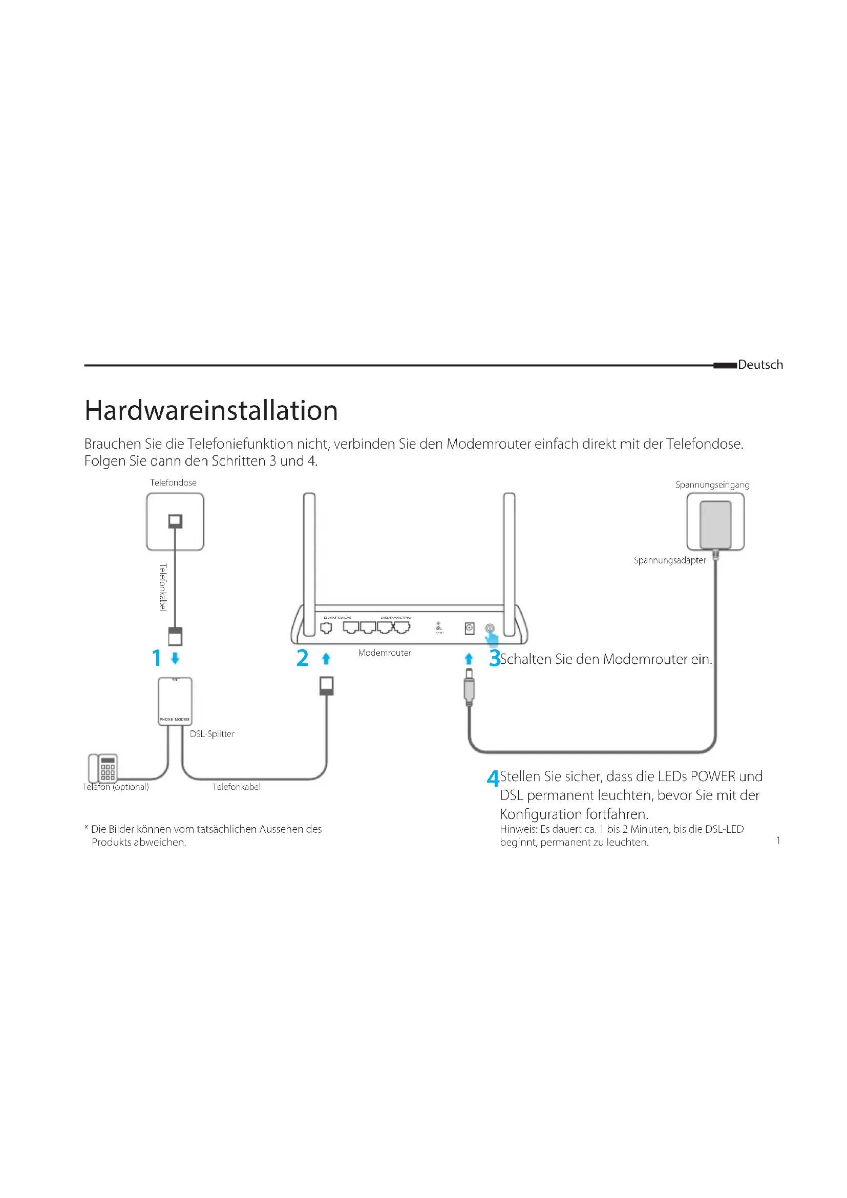 WPS/ RESETLAN3 LAN4/WAN WIFI Power* Die Bilder können vom tatsächlichen Aussehen des Produkts abweichen.Hinweis: Es dauert ca. 1 bis 2 Minuten, bis die DSL-LED beginnt, permanent zu leuchten. Stellen Sie sicher, dass die LEDs POWER und DSL permanent leuchten, bevor Sie mit der Konguration fortfahren. TelefondoseTelefonkabelTelefonkabelModemrouter Schalten Sie den Modemrouter ein. SpannungseingangSpannungsadapterDSL-SplitterTelefon (optional)Deutsch