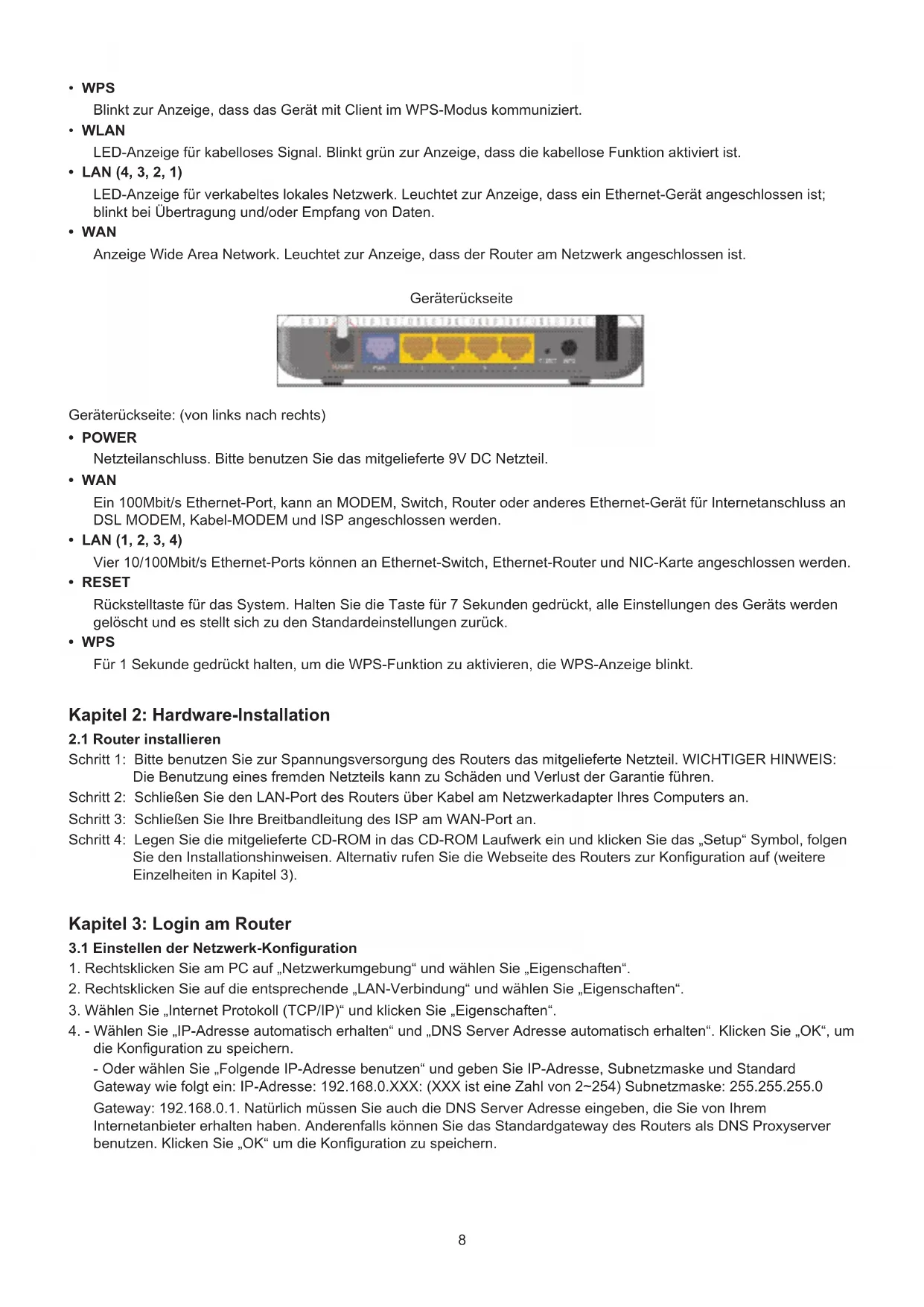 - WAN Ein 100Mbit/s Ethernet-Port, kann an MODEM, Switch, Router oder anderes Ethernet-Gerät für Internetanschluss an DSL MODEM, Kabel-MODEM und ISP angeschlossen werden.