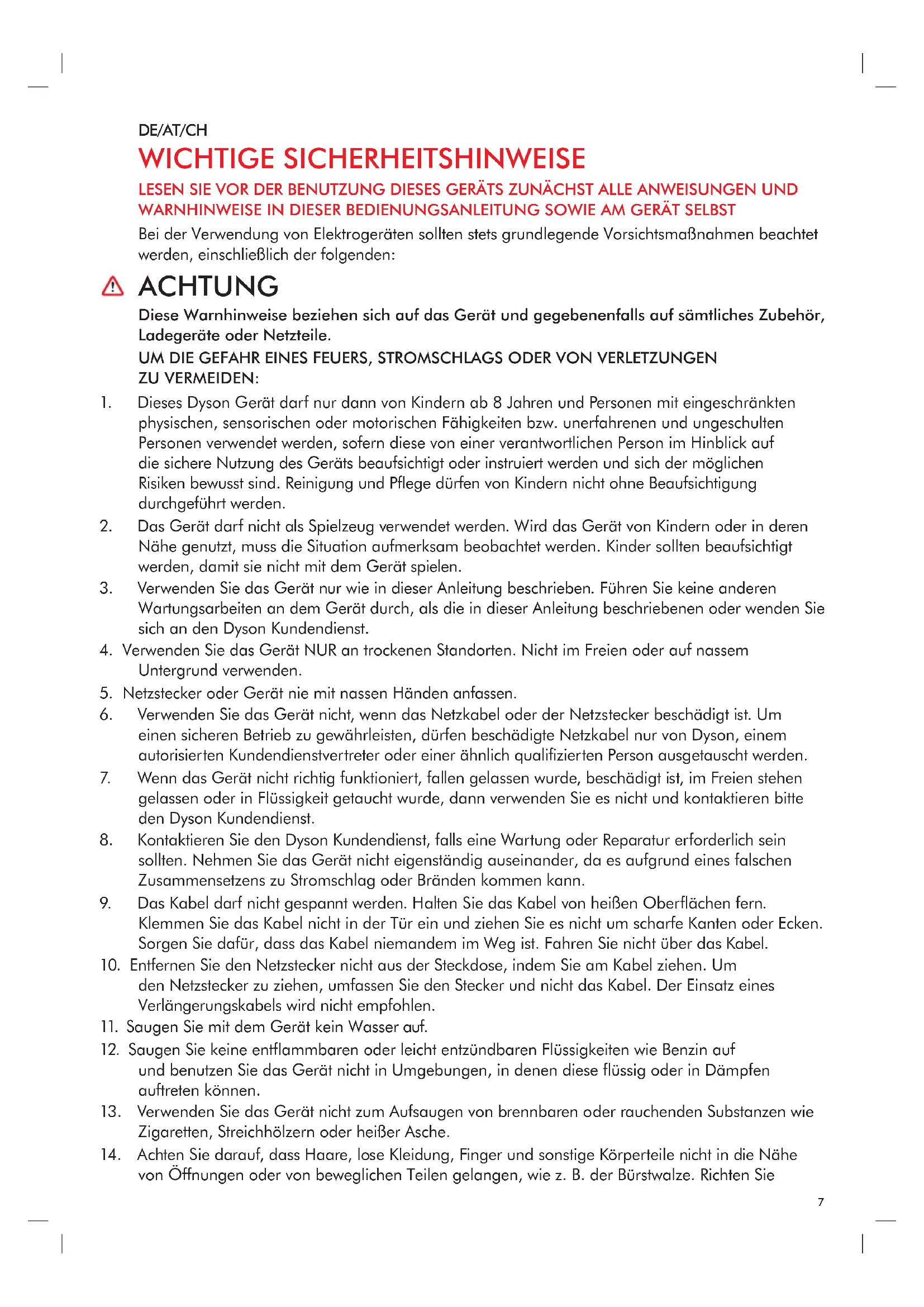 CONSIGNES CET APPAREIL DYSON EST EXCLUSIVEMENT DESTINÉ À UN USAGE DOMESTIQUE7 DE/AT/CH WICHTIGE SICHERHEITSHINWEISE LESEN SIE VOR DER BENUTZUNG DIESES GERÄTS ZUNÄCHST ALLE ANWEISUNGEN UND WARNHINWEISE IN DIESER BEDIENUNGSANLEITUNG SOWIE AM GERÄT SELBST Bei der Verwendung von Elektrogeräten sollten stets grundlegende Vorsichtsmaßnahmen beachtet werden, einschließlich der folgenden: ACHTUNG Diese Warnhinweise beziehen sich auf das Gerät und gegebenenfalls auf sämtliches Zubehör, Ladegeräte oder Netzteile. UM DIE GEFAHR EINES FEUERS, STROMSCHLAGS ODER VON VERLETZUNGEN ZU VERMEIDEN: