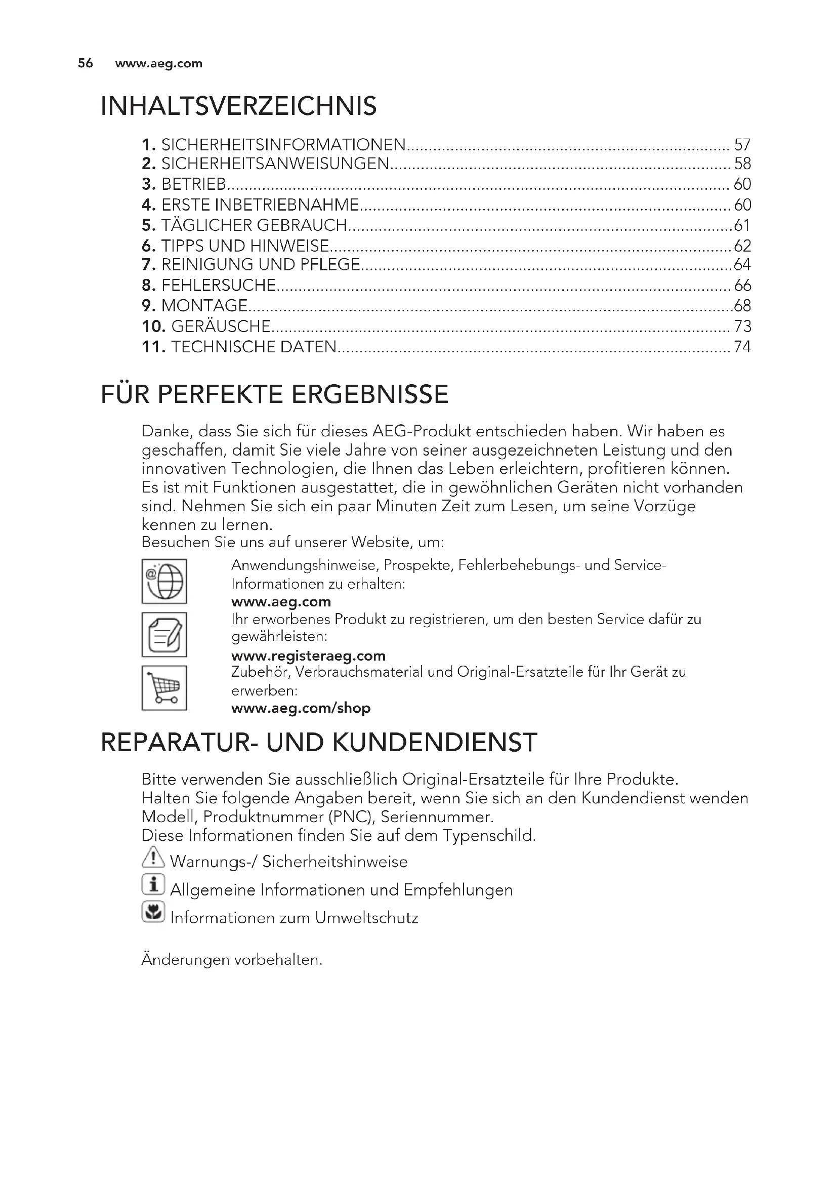 Danke, dass Sie sich für dieses AEG-Produkt entschieden haben. Wir haben es geschaffen, damit Sie viele Jahre von seiner ausgezeichneten Leistung und den innovativen Technologien, die Ihnen das Leben erleichtern, profitieren können. Es ist mit Funktionen ausgestattet, die in gewöhnlichen Geräten nicht vorhanden sind. Nehmen Sie sich ein paar Minuten Zeit zum Lesen, um seine Vorzüge kennen zu lernen. Besuchen Sie uns auf unserer Website, um: Anwendungshinweise, Prospekte, Fehlerbehebungs- und Service- Informationen zu erhalten: www.aeg.com Ihr erworbenes Produkt zu registrieren, um den besten Service dafür zu gewährleisten: www.registeraeg.com Zubehör, Verbrauchsmaterial und Original-Ersatzteile für Ihr Gerät zu erwerben: www.aeg.com/shop