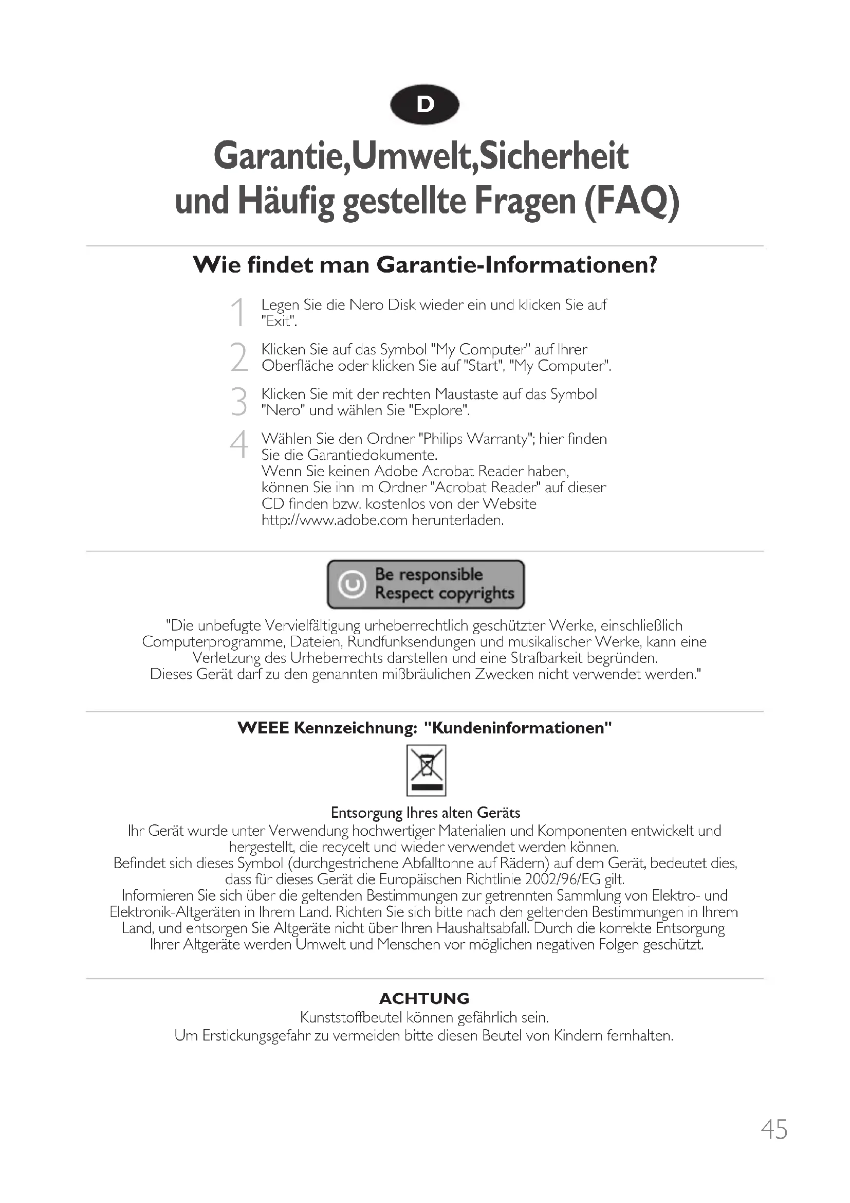 Wählen Sie den Ordner "Philips Warranty"; hier finden Sie die Garantiedokumente. Wenn Sie keinen Adobe Acrobat Reader haben, können Sie ihn im Ordner "Acrobat Reader" auf dieser CD finden bzw. kostenlos von der Website http://www.adobe.com herunterladen. "Die unbefugte Vervielfältigung urheberrechtlich geschützter Werke, einschließlich Computerprogramme, Dateien, Rundfunksendungen und musikalischer Werke, kann eine Verletzung des Urheberrechts darstellen und eine Strafbarkeit begründen. Dieses Gerät darf zu den genannten mißbräulichen Zwecken nicht verwendet werden." WEEE Kennzeichnung: "Kundeninformationen" Entsorgung Ihres alten Geräts Ihr Gerät wurde unter Verwendung hochwertiger Materialien und Komponenten entwickelt und hergestellt, die recycelt und wieder verwendet werden können. Befindet sich dieses Symbol (durchgestrichene Abfalltonne auf Rädern) auf dem Gerät, bedeutet dies, dass für dieses Gerät die Europäischen Richtlinie 2002/96/EG gilt. Informieren Sie sich über die geltenden Bestimmungen zur getrennten Sammlung von Elektro- und Elektronik-Altgeräten in Ihrem Land. Richten Sie sich bitte nach den geltenden Bestimmungen in Ihrem Land, und entsorgen Sie Altgeräte nicht über Ihren Haushaltsabfall. Durch die korrekte Entsorgung Ihrer Altgeräte werden Umwelt und Menschen vor möglichen negativen Folgen geschützt. ACHTUNG Kunststoffbeutel können gefährlich sein. Um Erstickungsgefahr zu vermeiden bitte diesen Beutel von Kindern fernhalten. Garantie,Umwelt,Sicherheit und Häufig gestellte Fragen (FAQ)
